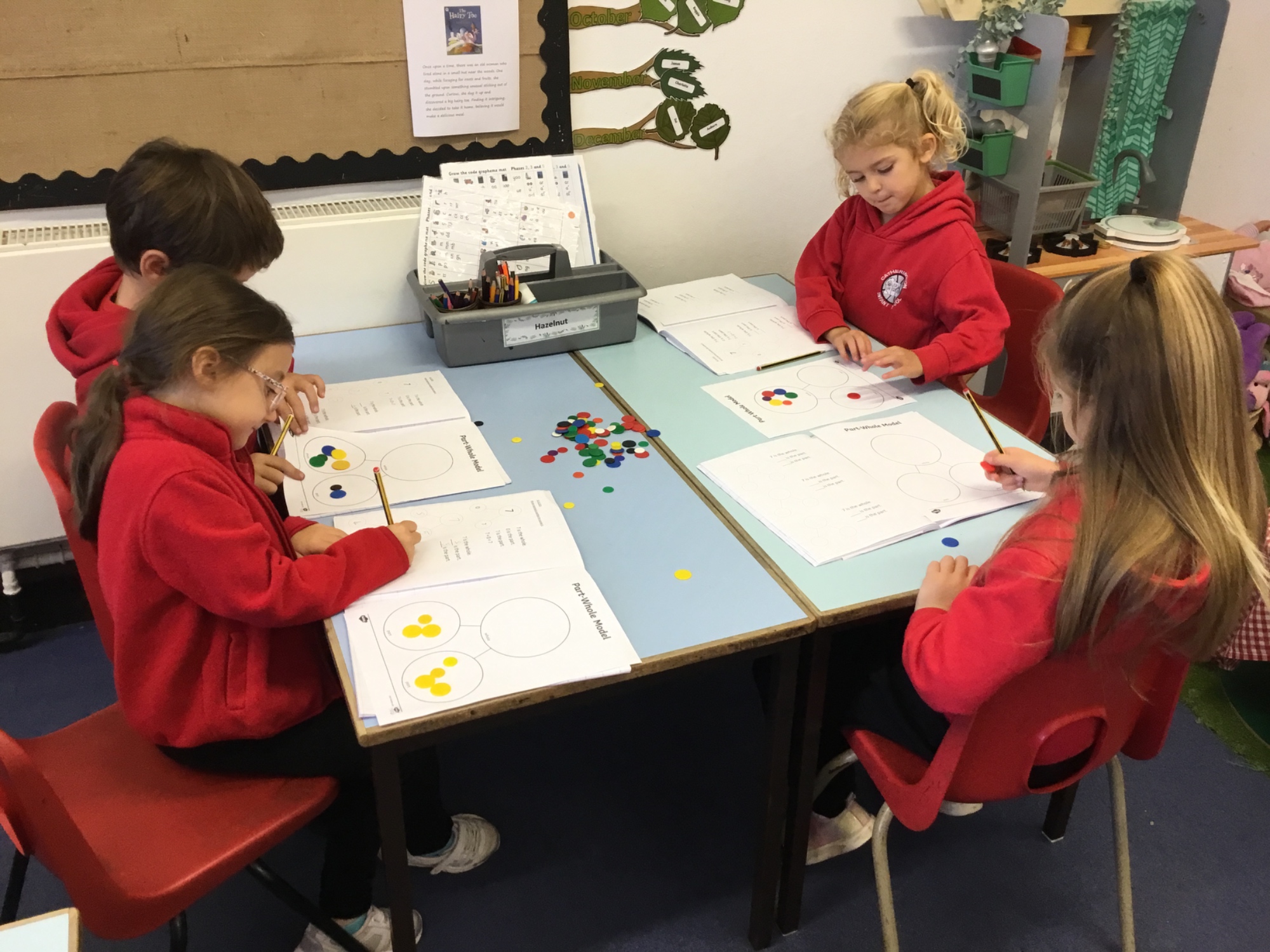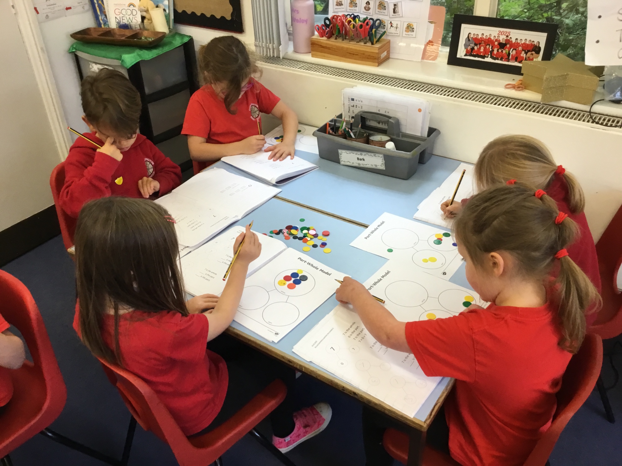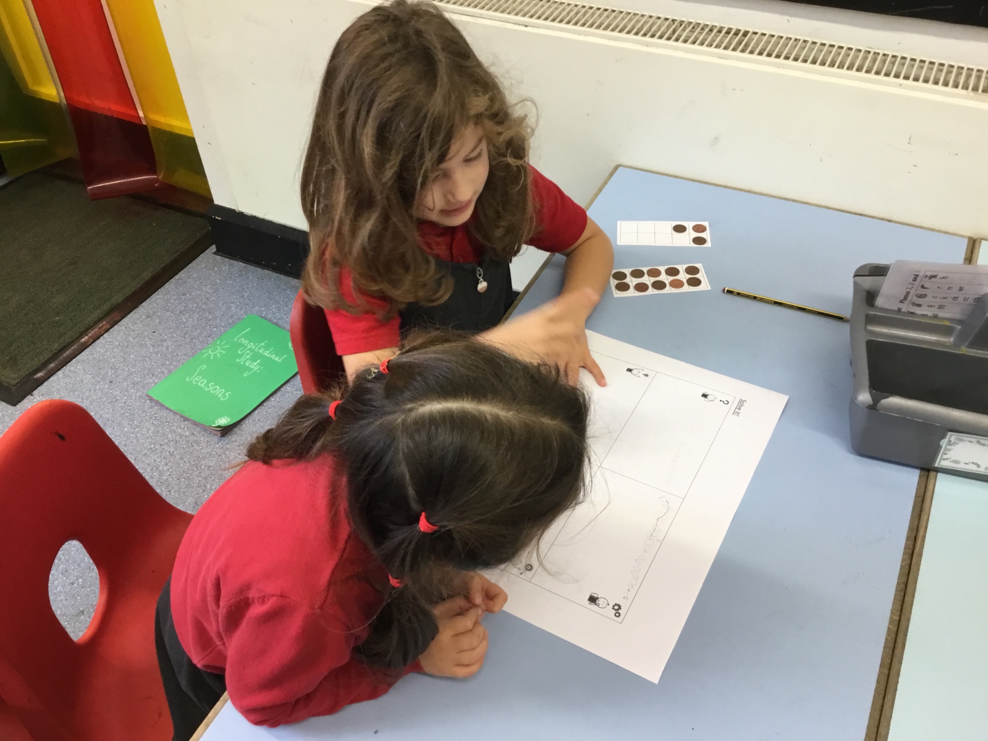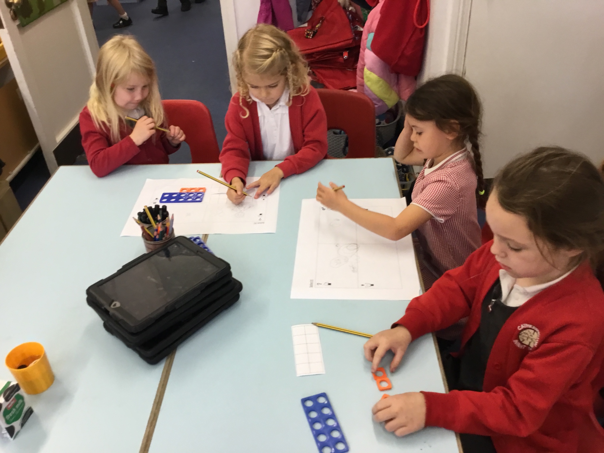 In maths this week the children have been busy using ten frames and flip counters as well as cherry models and counters to find all of the number bonds to 6 and 7. They were working systematically to make sure they found all of the pairs of numbers and then they write them down as number sentences and completed the models drawn in their books.