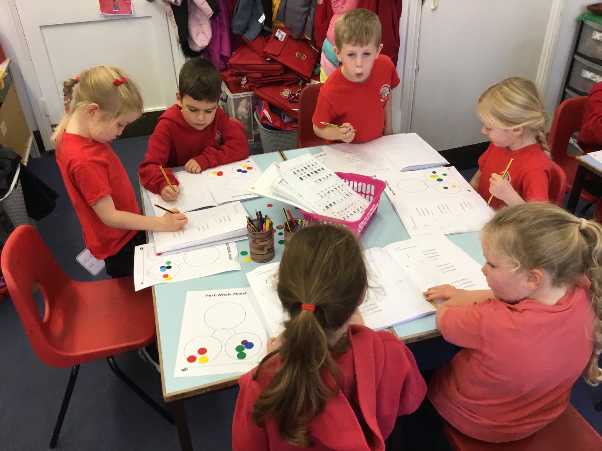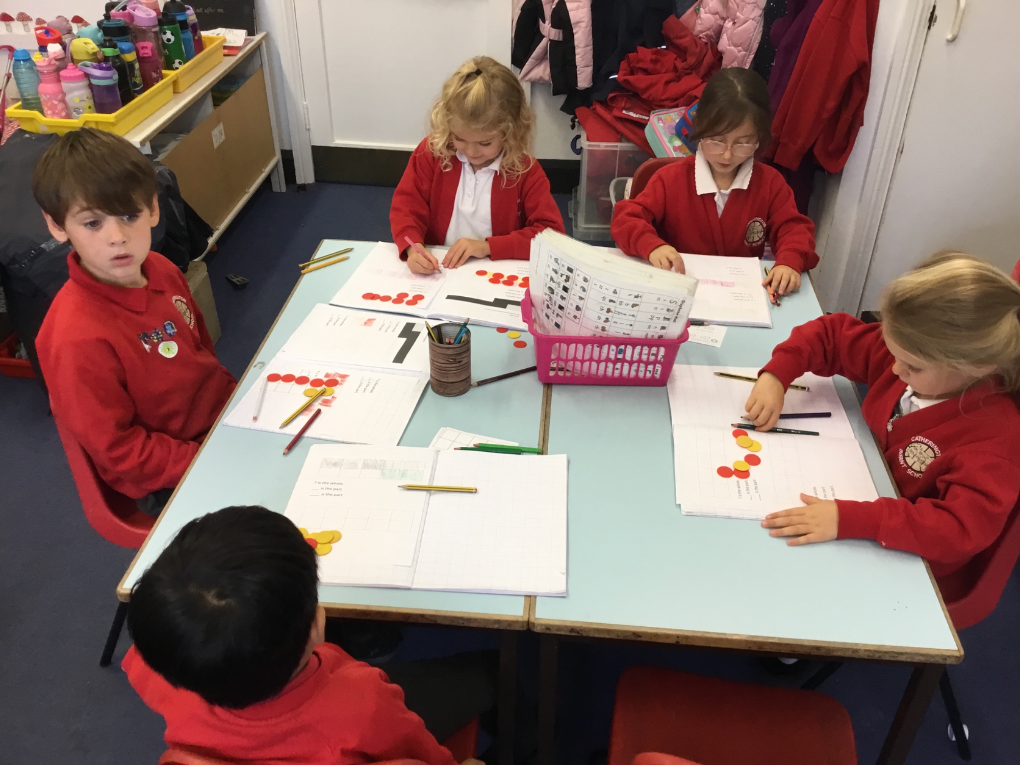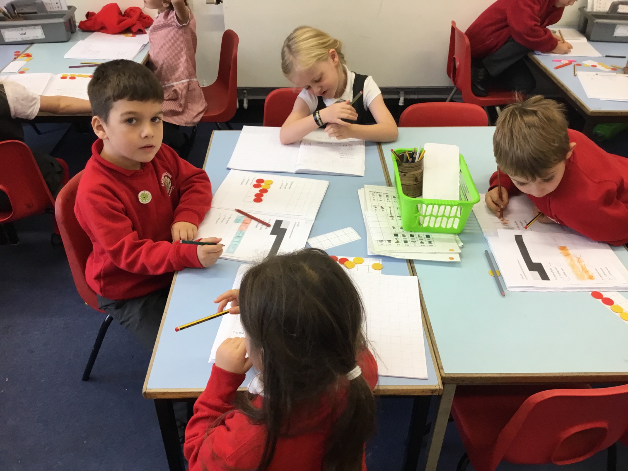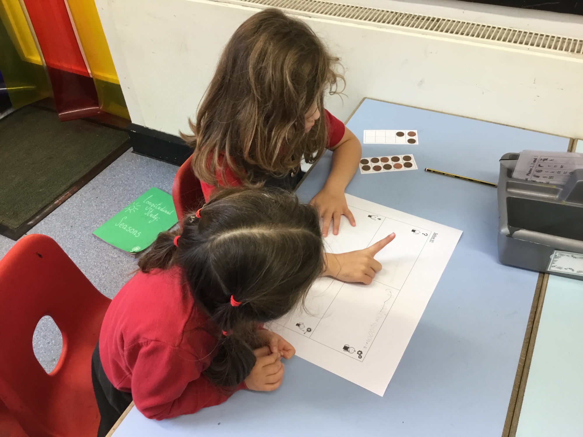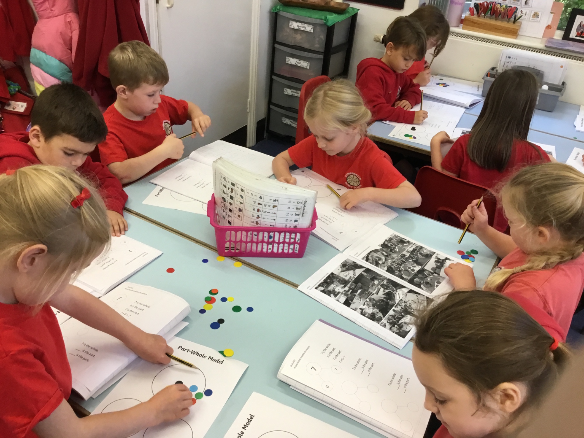 In maths this week the children have been busy using ten frames and flip counters as well as cherry models and counters to find all of the number bonds to 6 and 7. They were working systematically to make sure they found all of the pairs of numbers and then they write them down as number sentences and completed the models drawn in their books.
