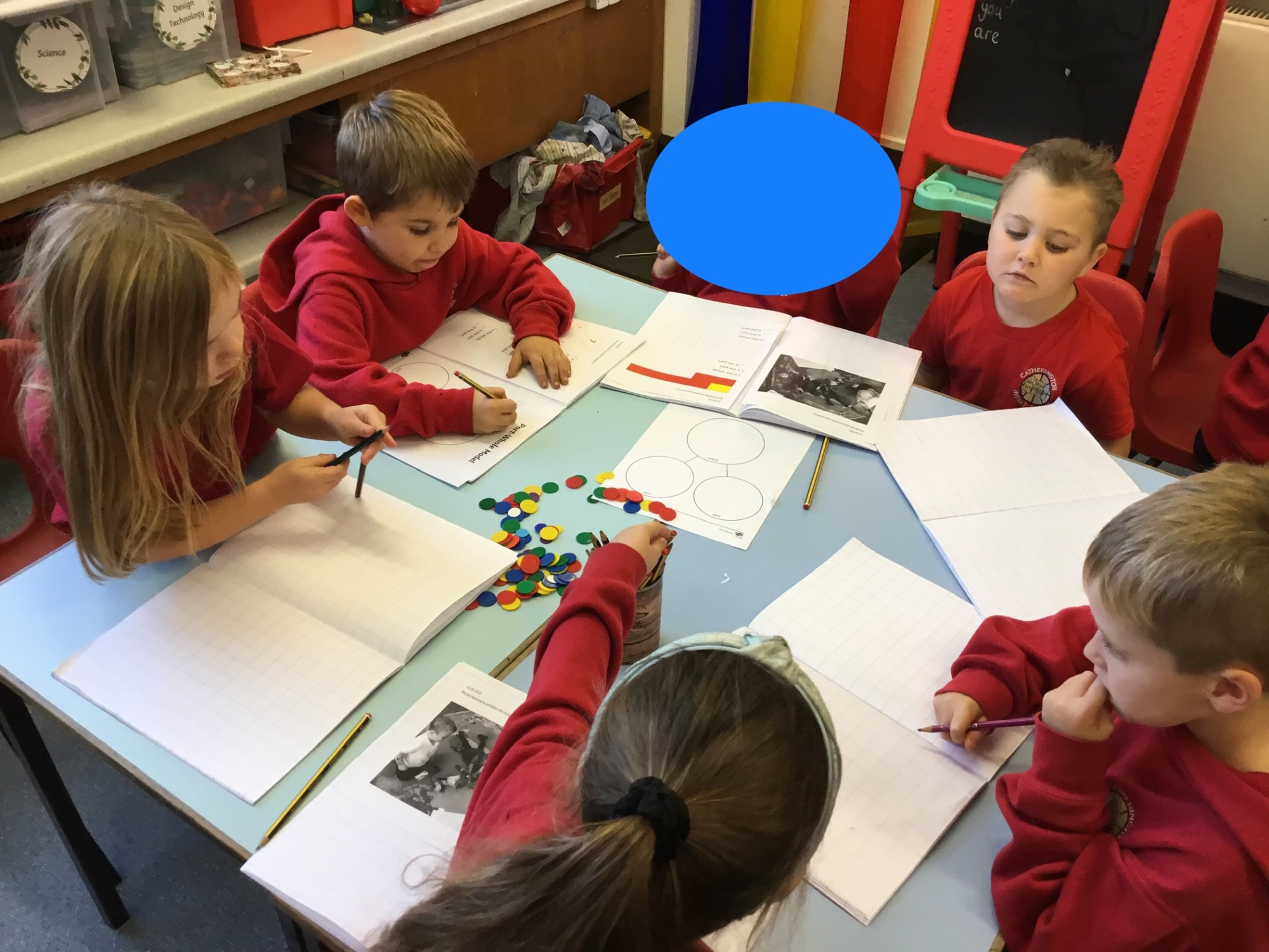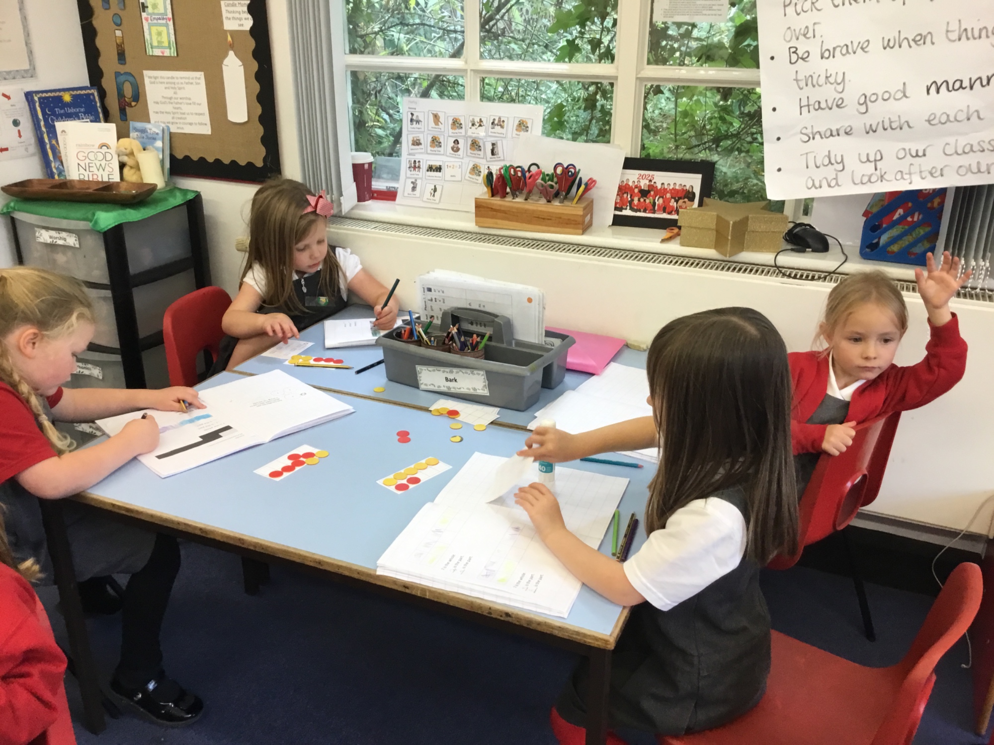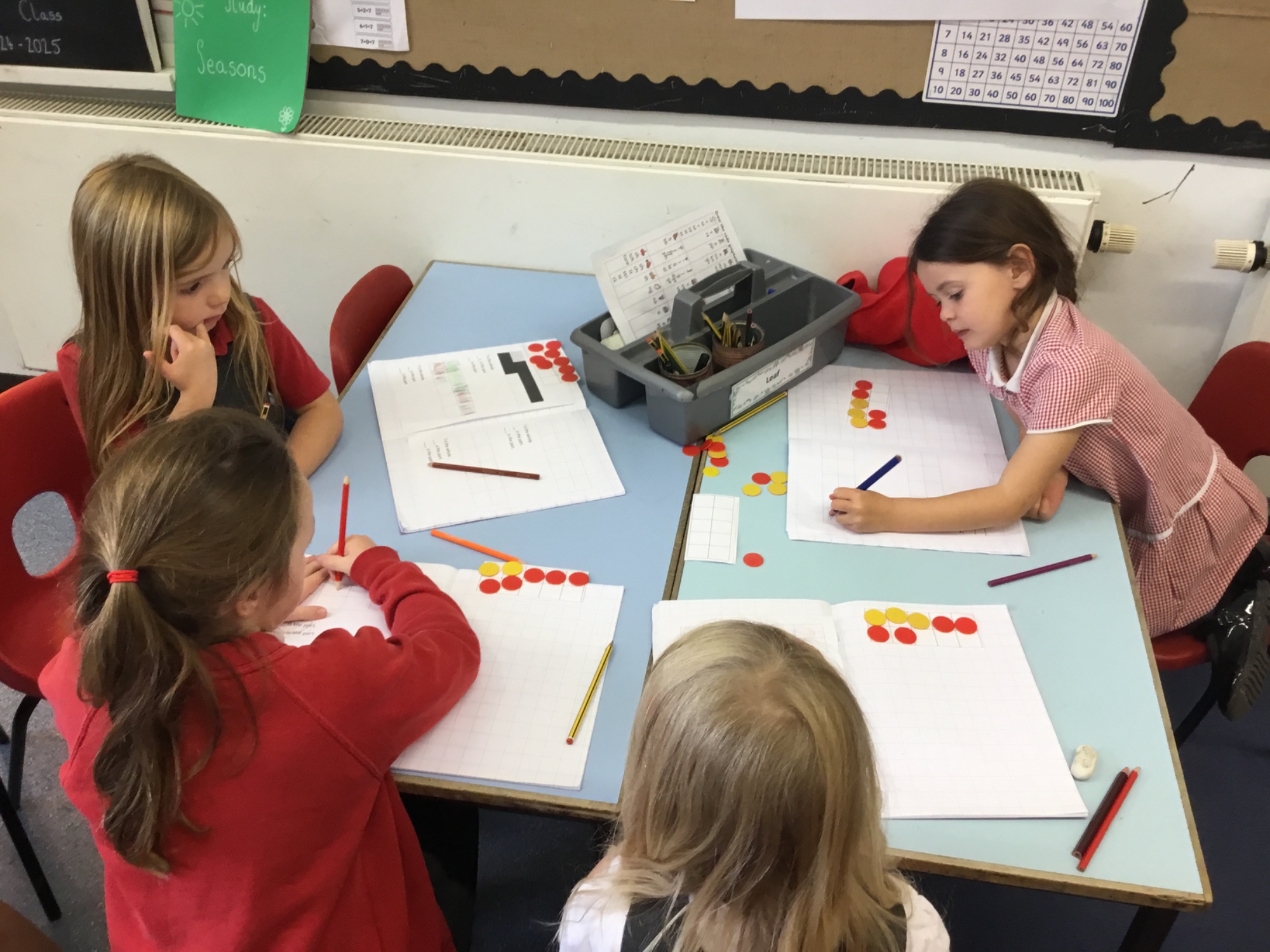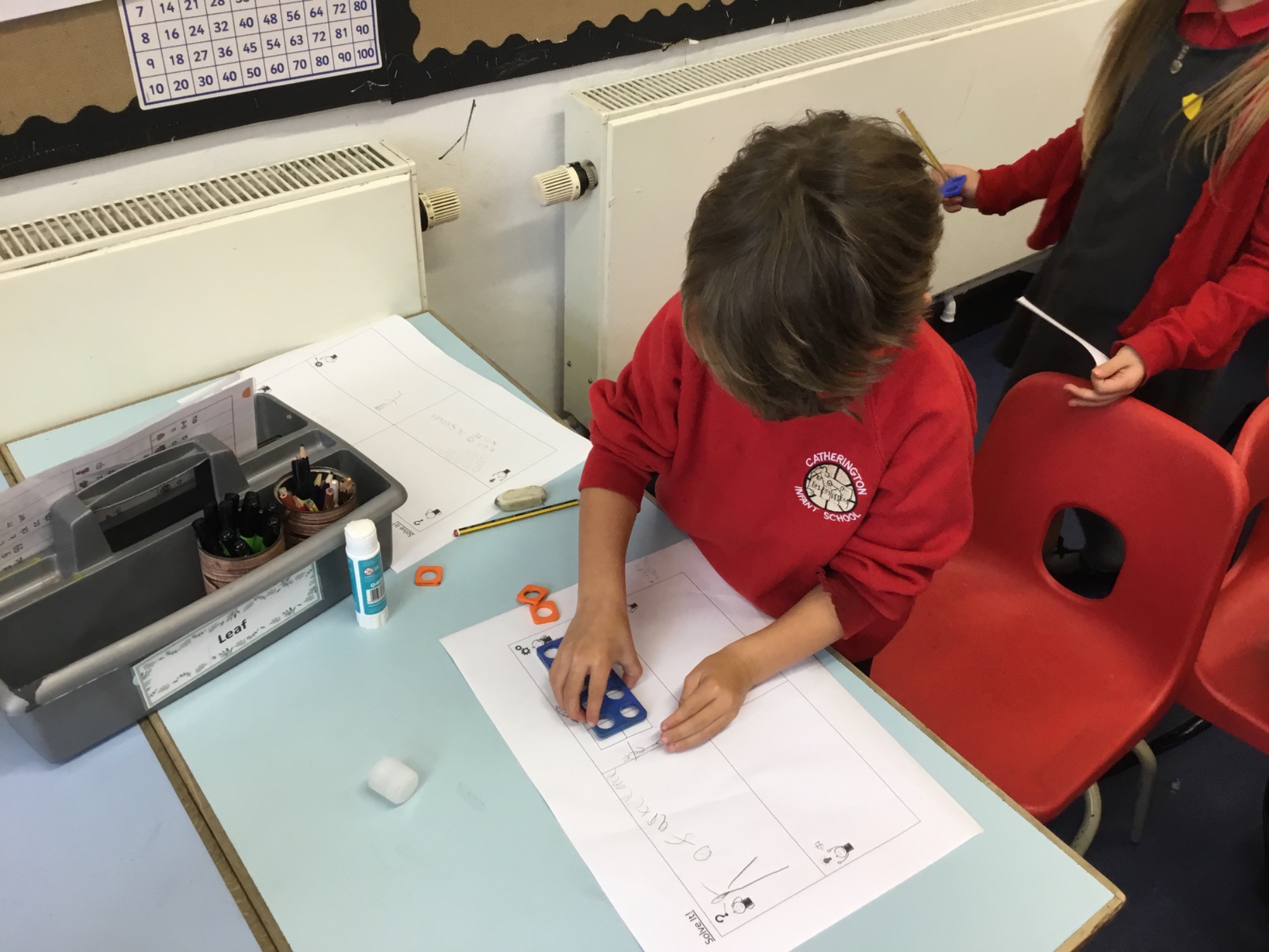 In maths this week the children have been busy using ten frames and flip counters as well as cherry models and counters to find all of the number bonds to 6 and 7. They were working systematically to make sure they found all of the pairs of numbers and then they write them down as number sentences and completed the models drawn in their books.