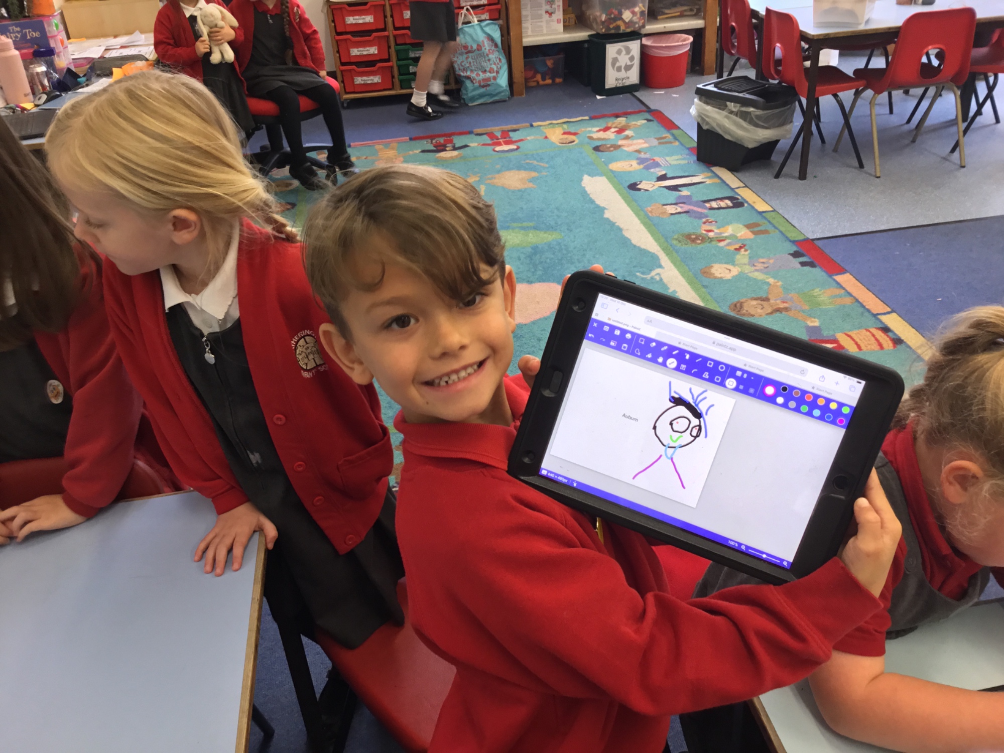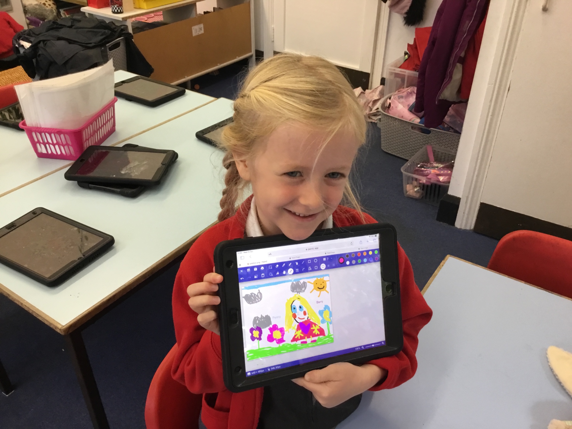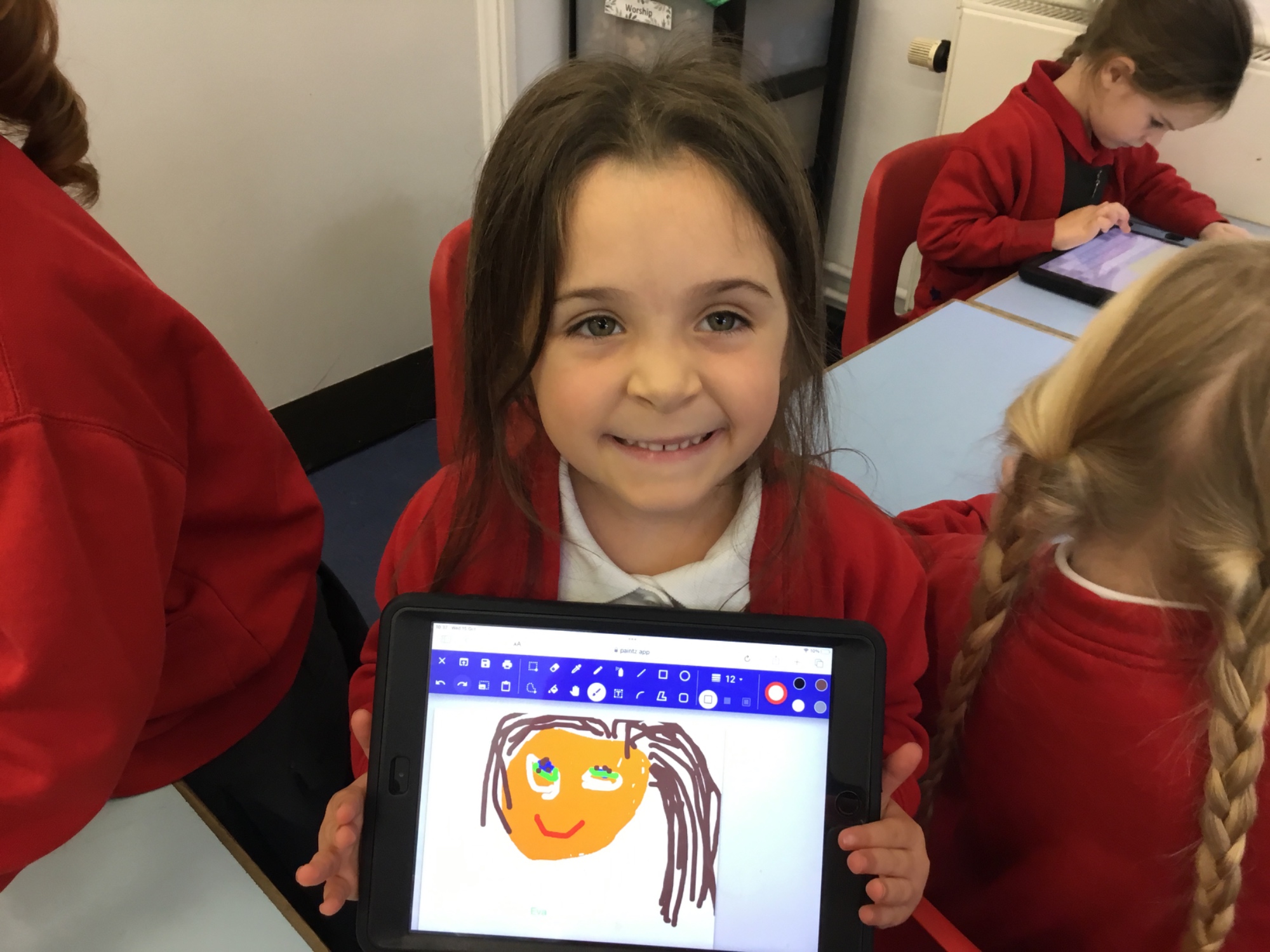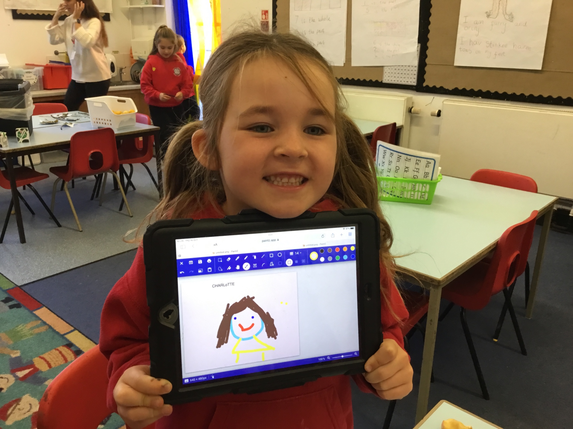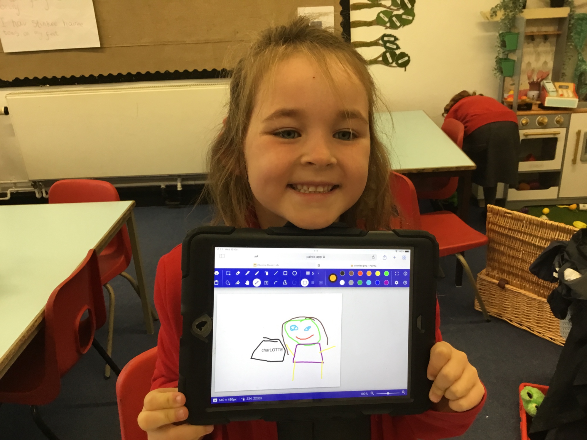 In computing this week, the children were learning to type on a keyboard on the iPads to write their names. They used the app Paintz to first create a text box to type their name into and then they used the shift arrow to write a capital letter to start their names. The children were then asked to draw a picture of themselves to practise using the drawing tools they learnt about last week.