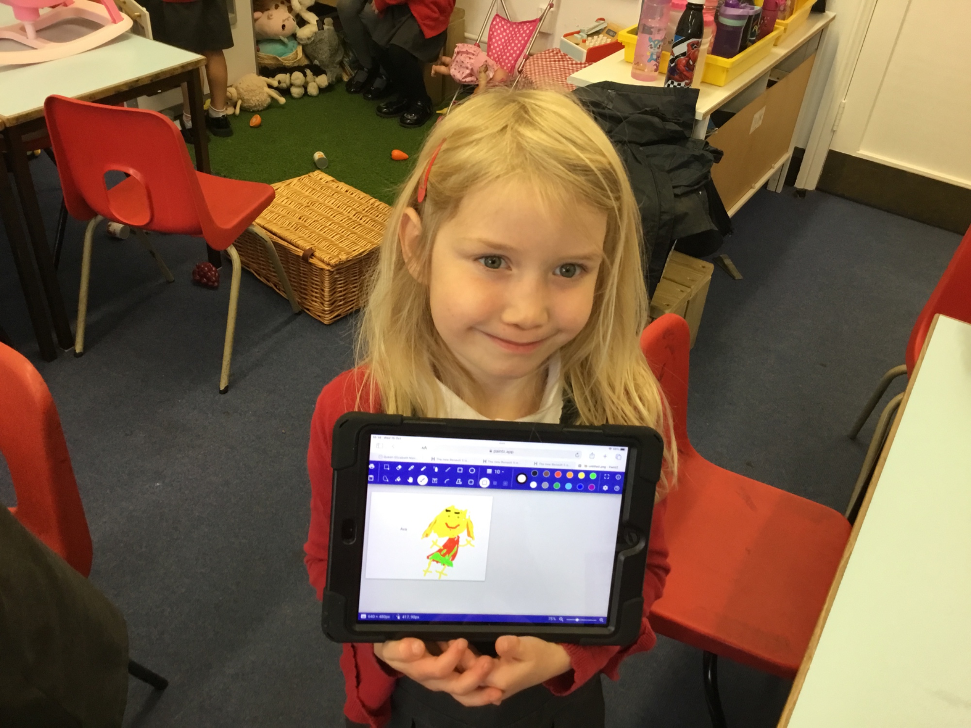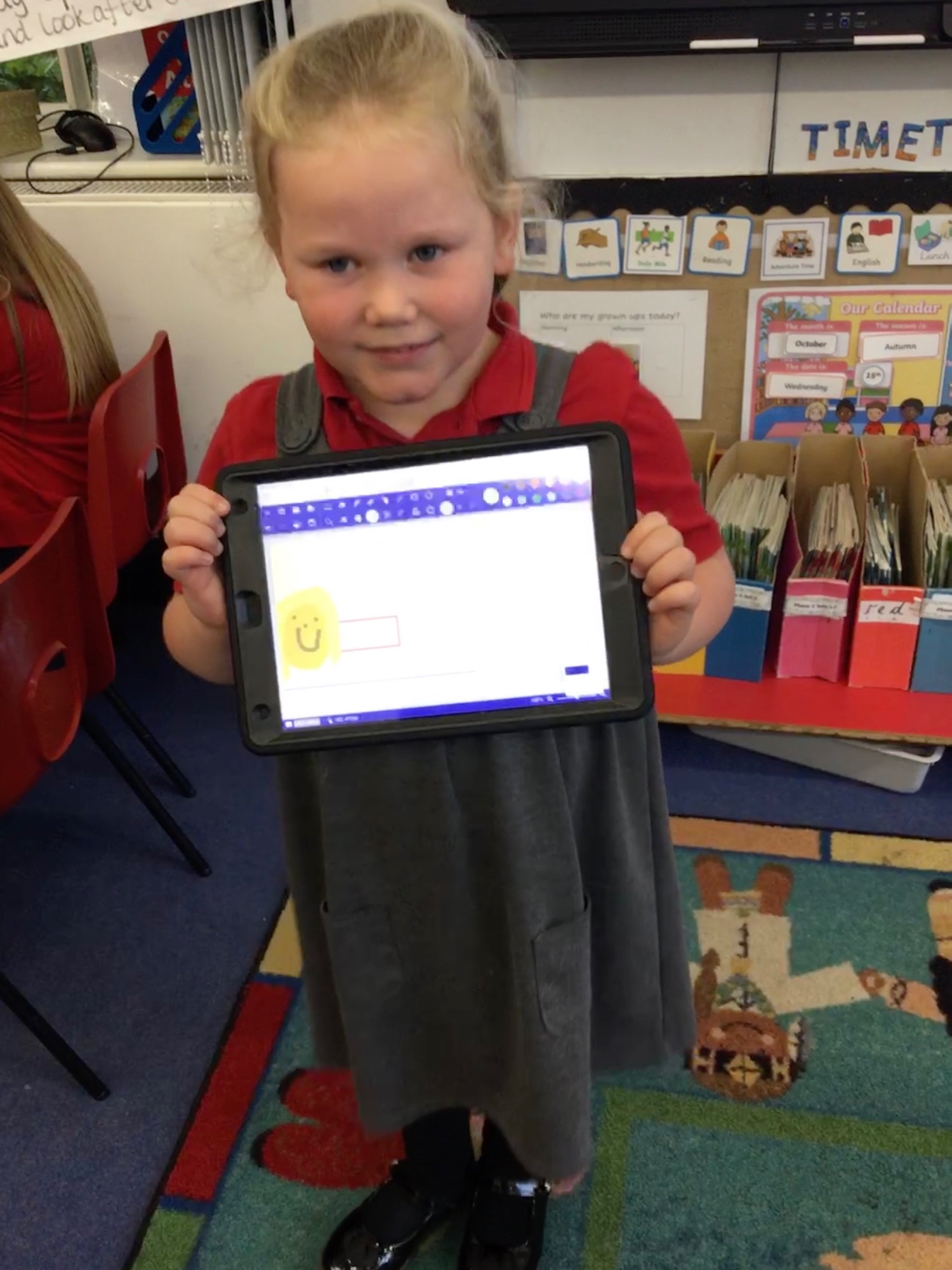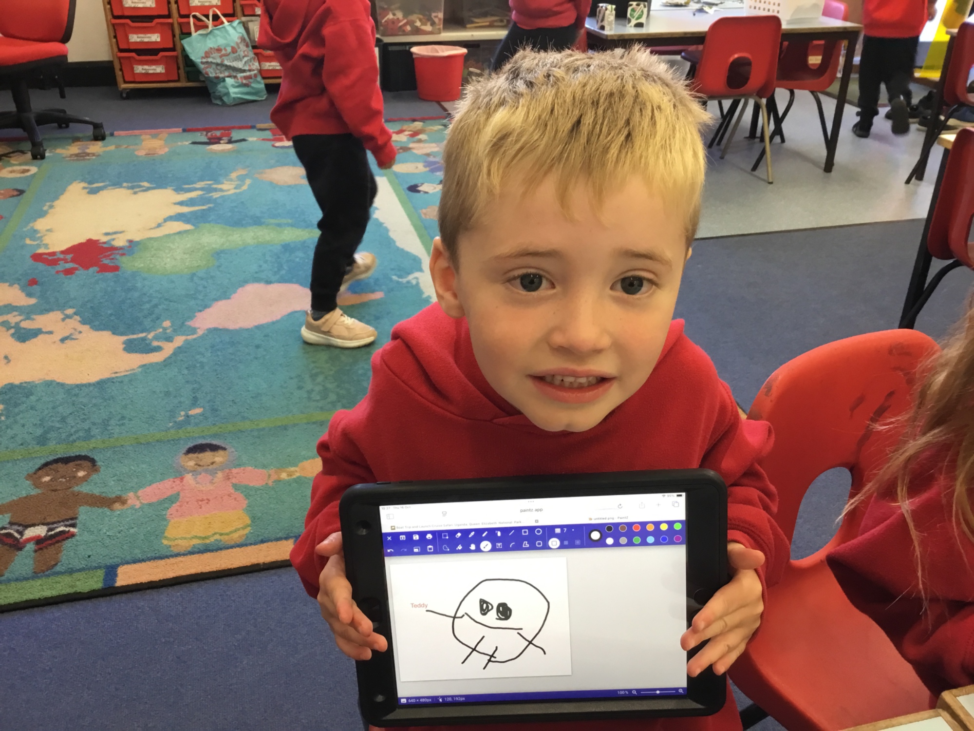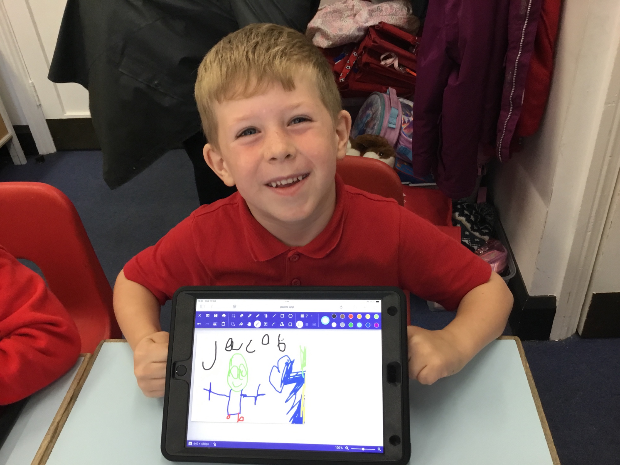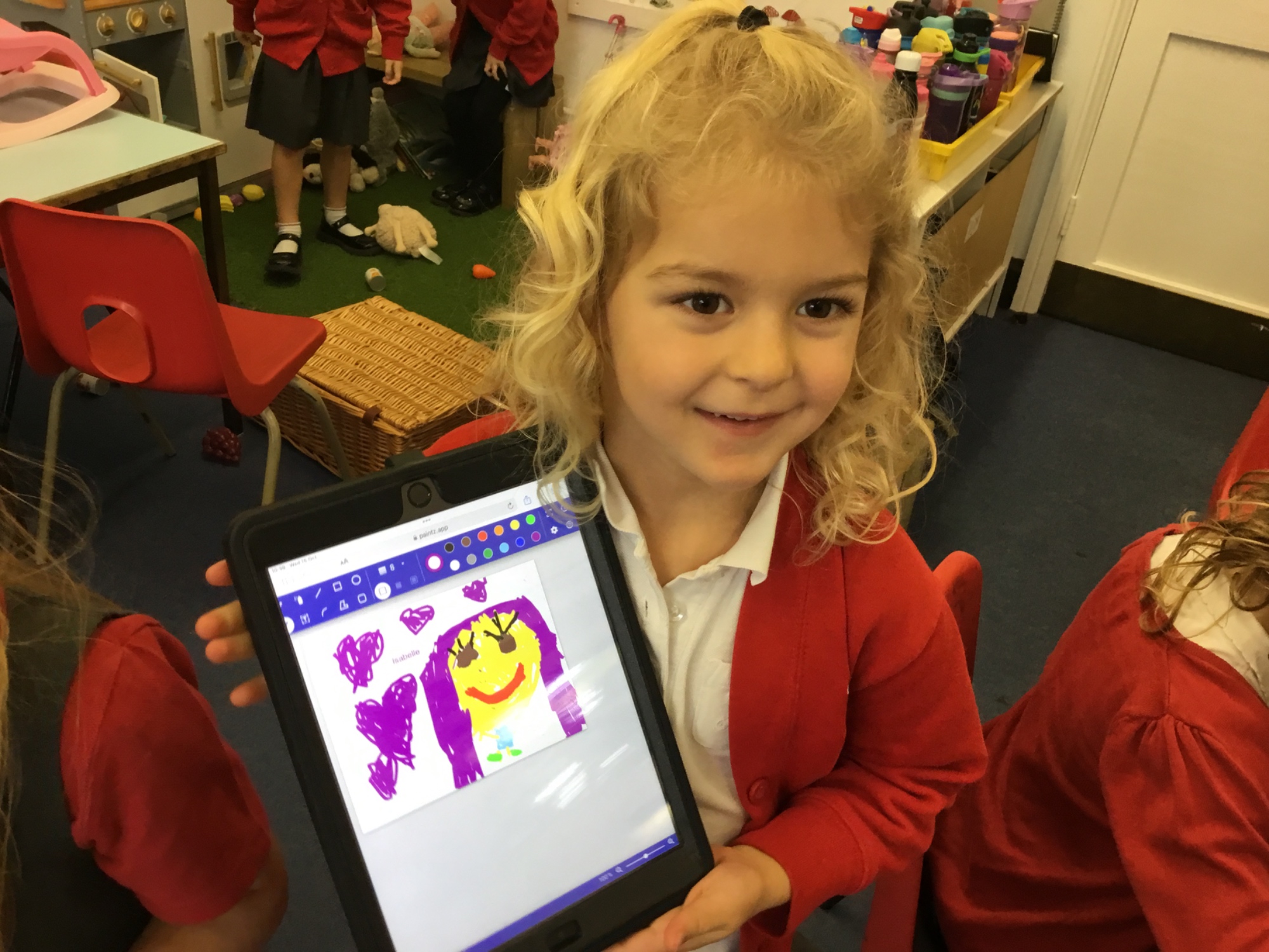 In computing this week, the children were learning to type on a keyboard on the iPads to write their names. They used the app Paintz to first create a text box to type their name into and then they used the shift arrow to write a capital letter to start their names. The children were then asked to draw a picture of themselves to practise using the drawing tools they learnt about last week.