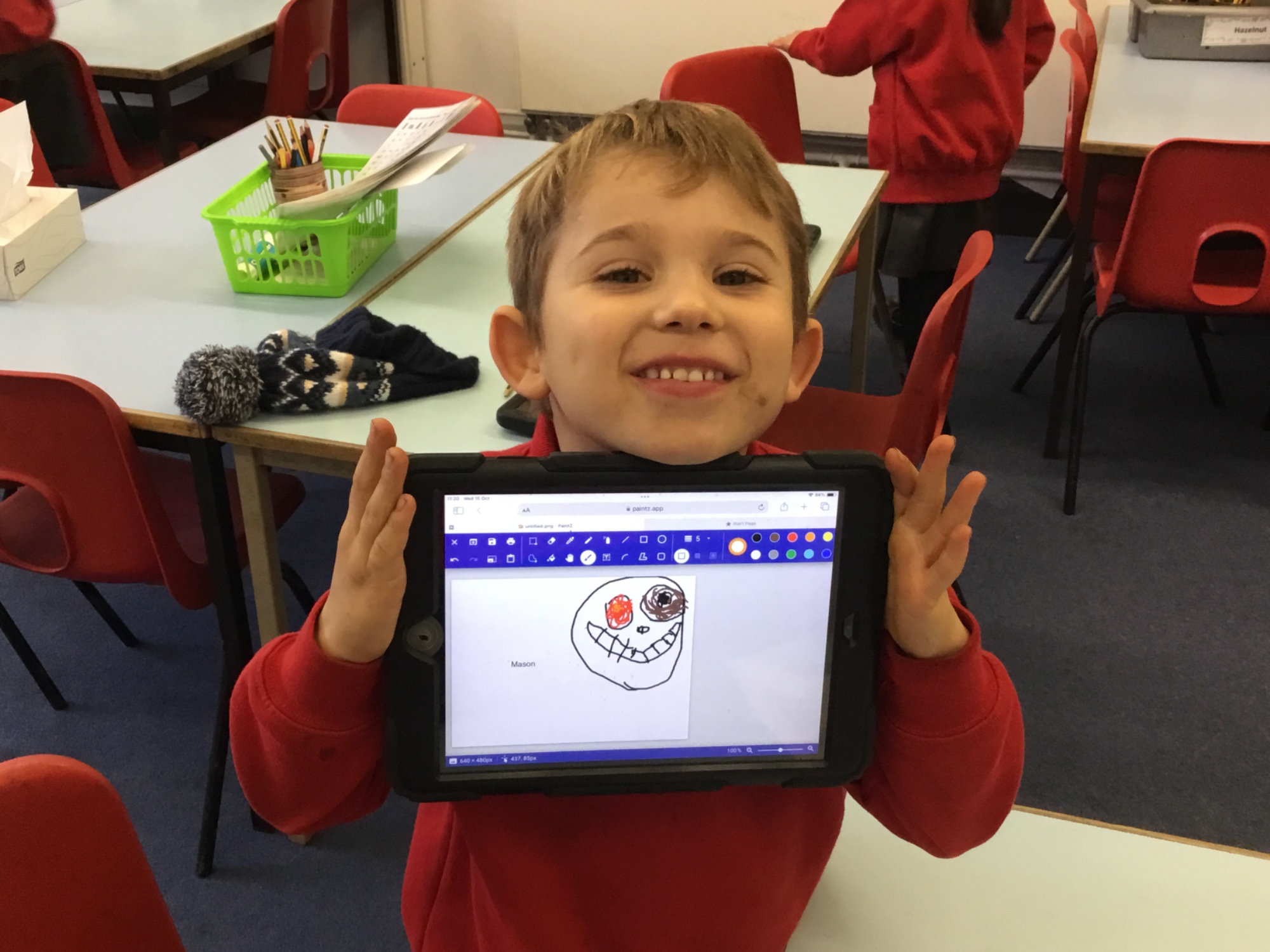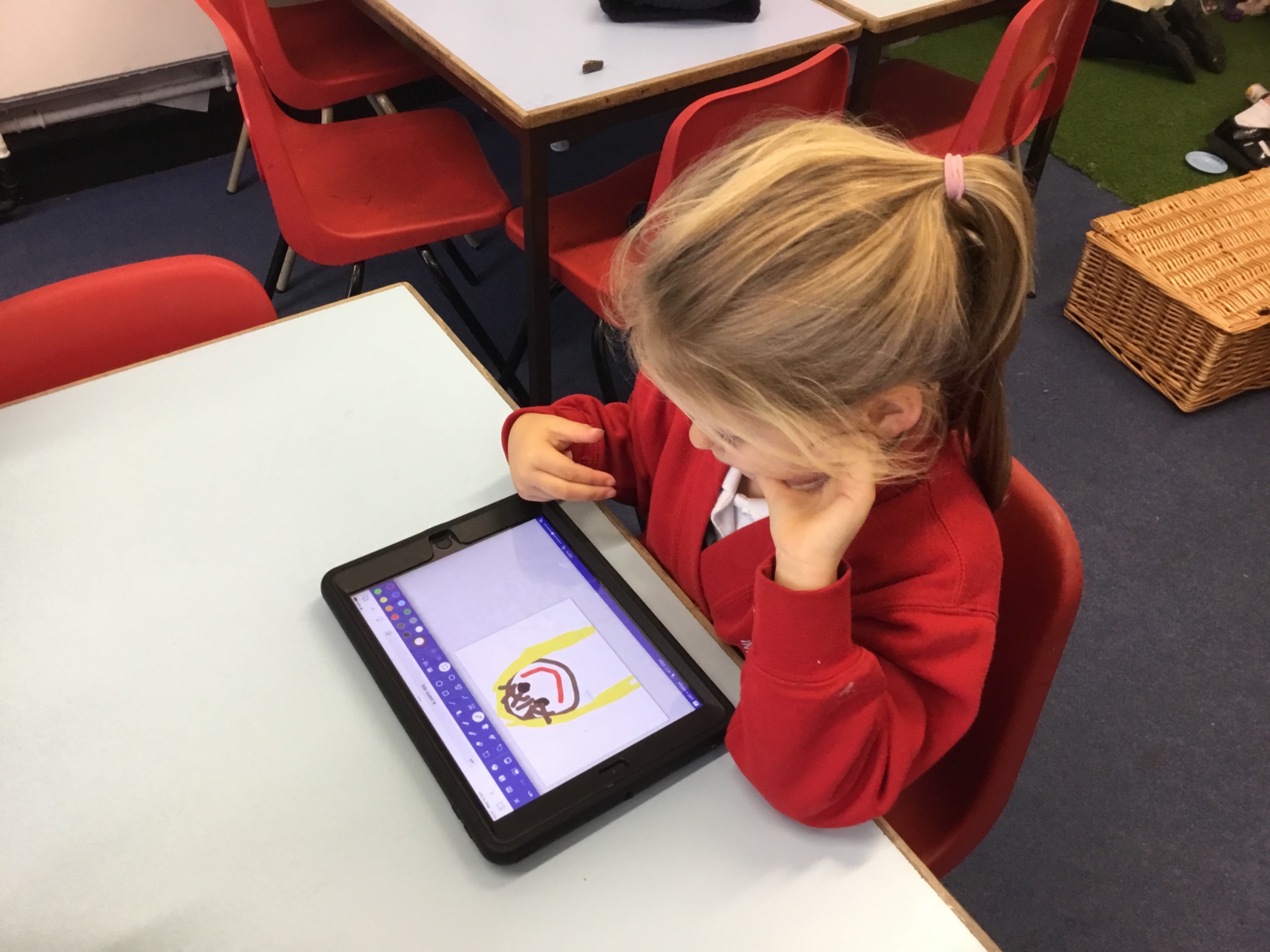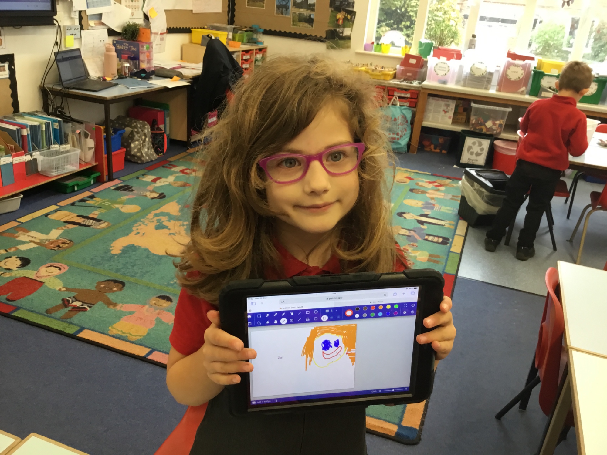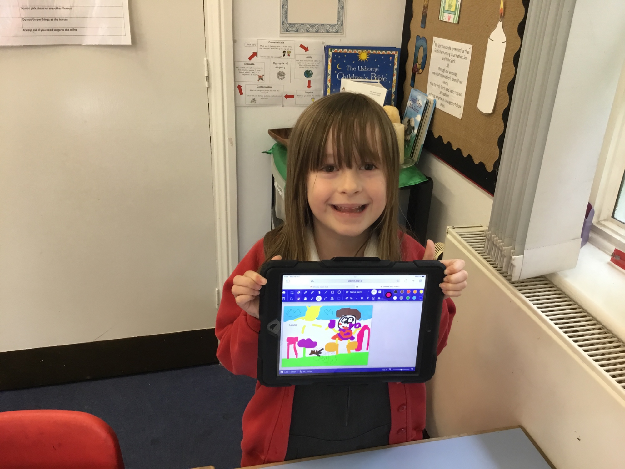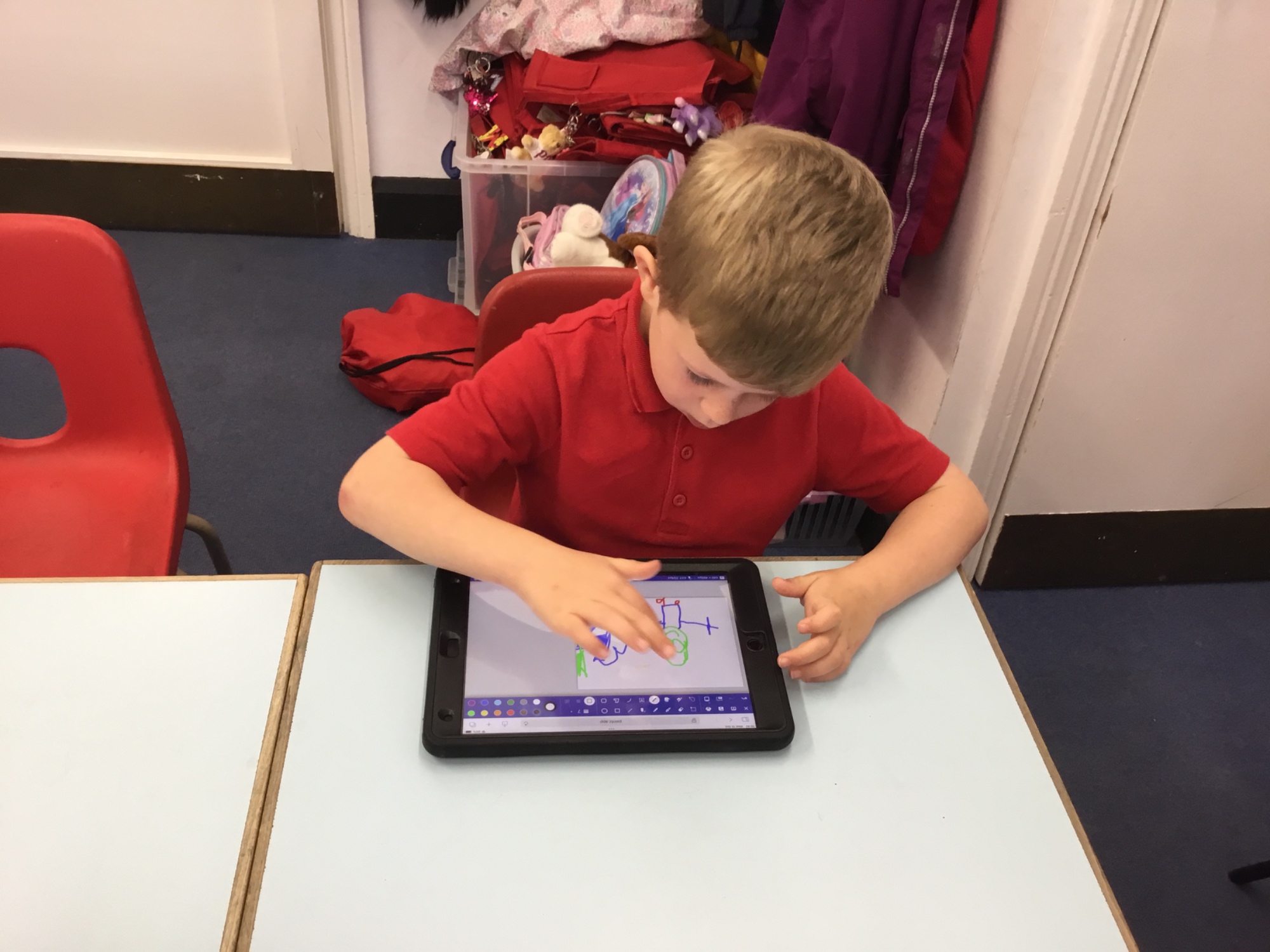 In computing this week, the children were learning to type on a keyboard on the iPads to write their names. They used the app Paintz to first create a text box to type their name into and then they used the shift arrow to write a capital letter to start their names. The children were then asked to draw a picture of themselves to practise using the drawing tools they learnt about last week.
