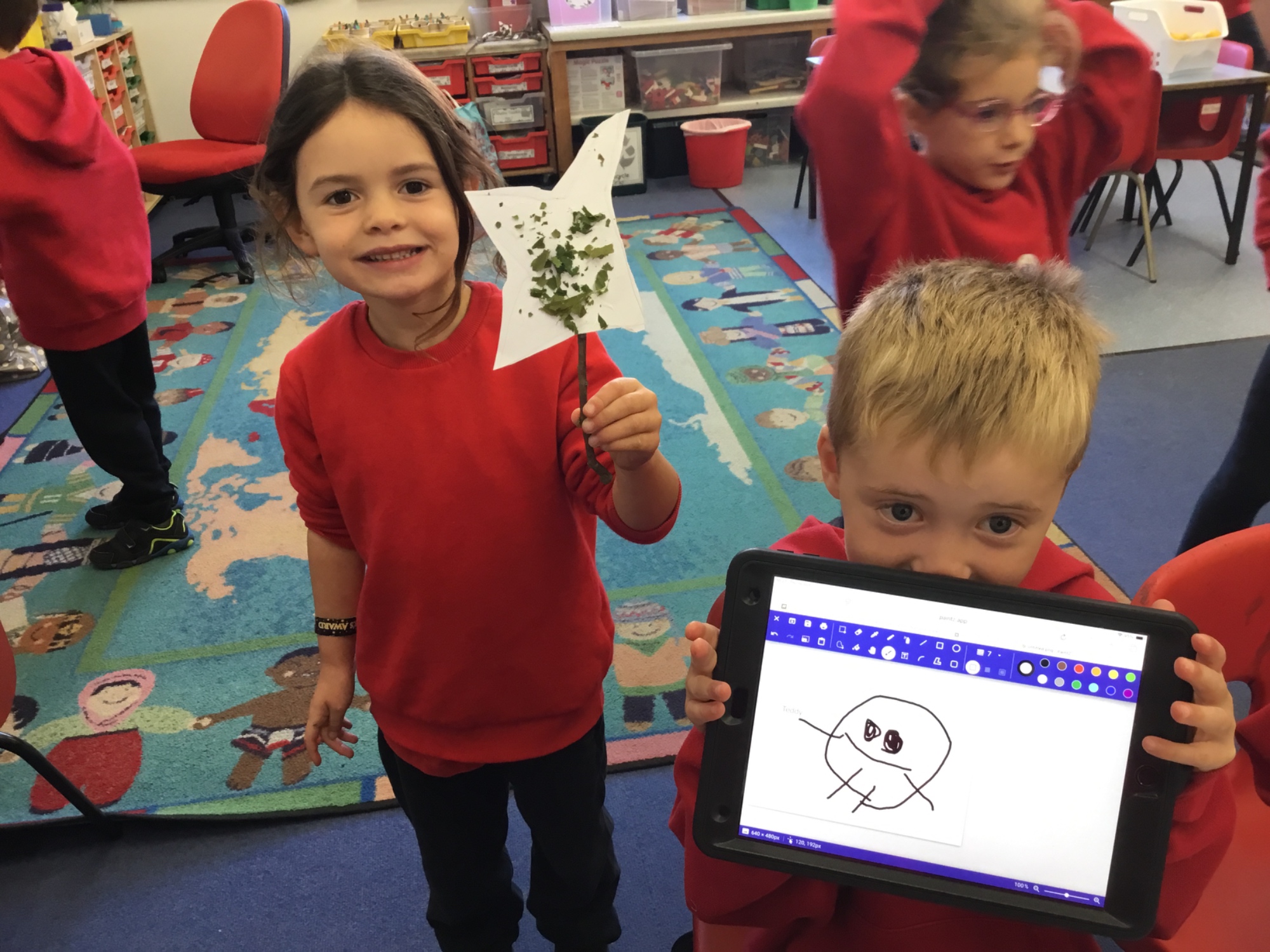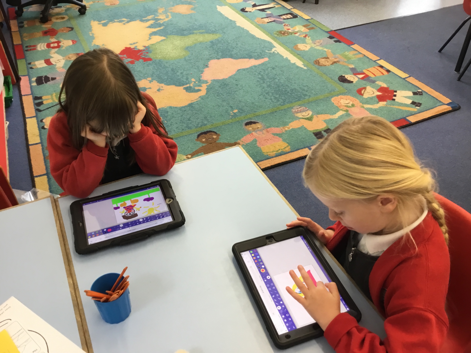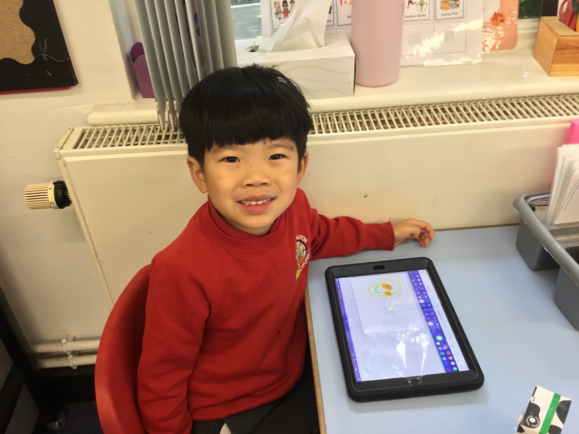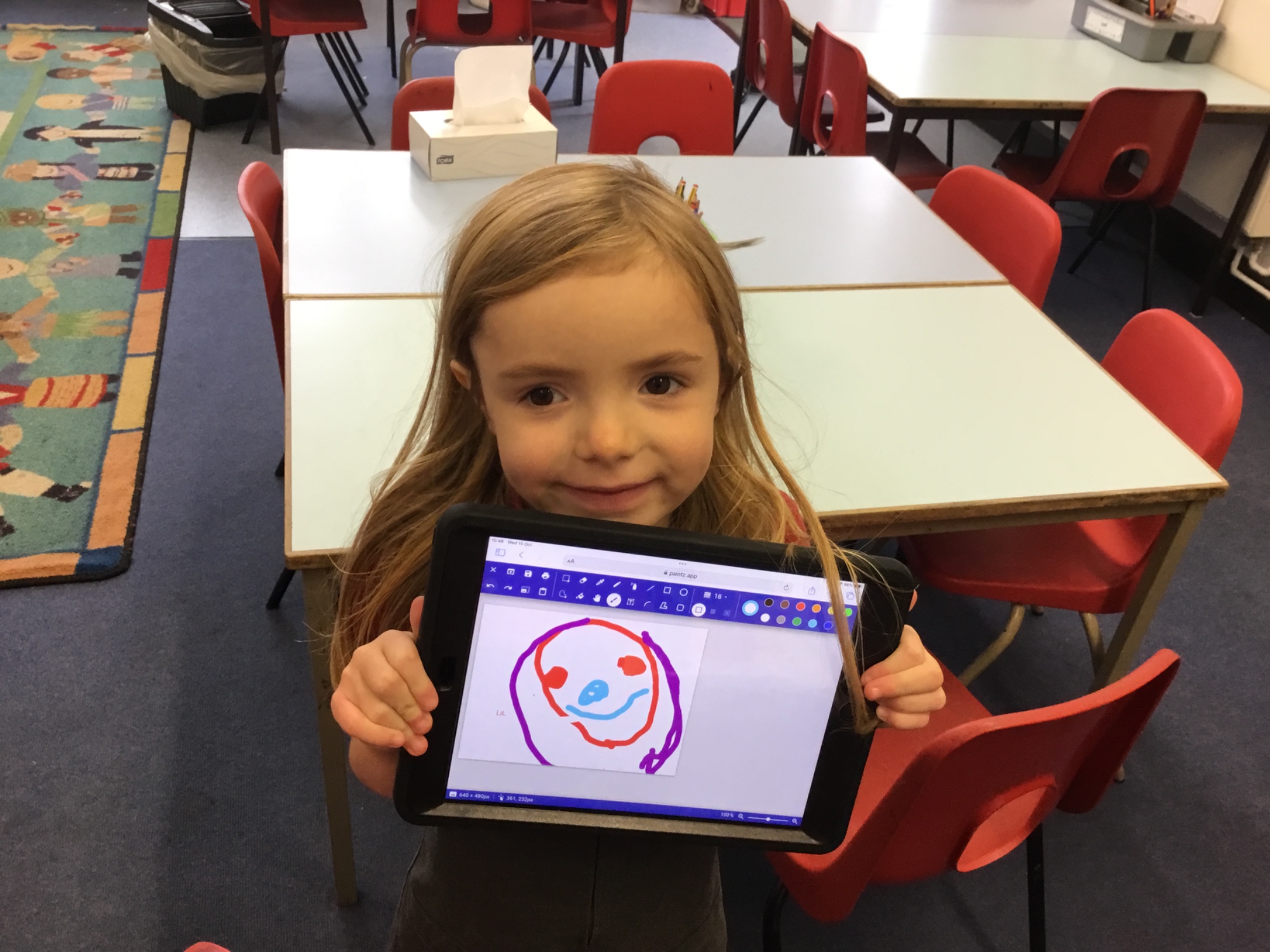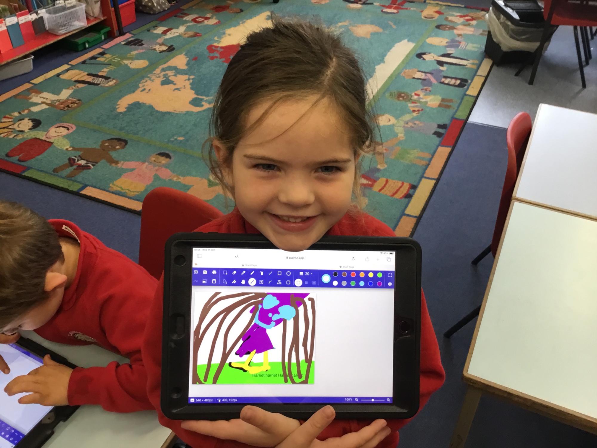 In computing this week, the children were learning to type on a keyboard on the iPads to write their names. They used the app Paintz to first create a text box to type their name into and then they used the shift arrow to write a capital letter to start their names. The children were then asked to draw a picture of themselves to practise using the drawing tools they learnt about last week.