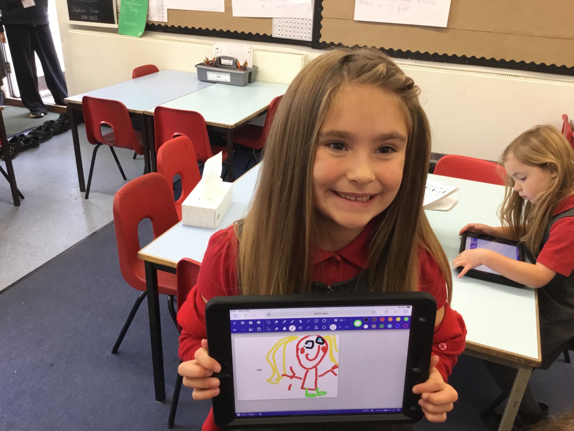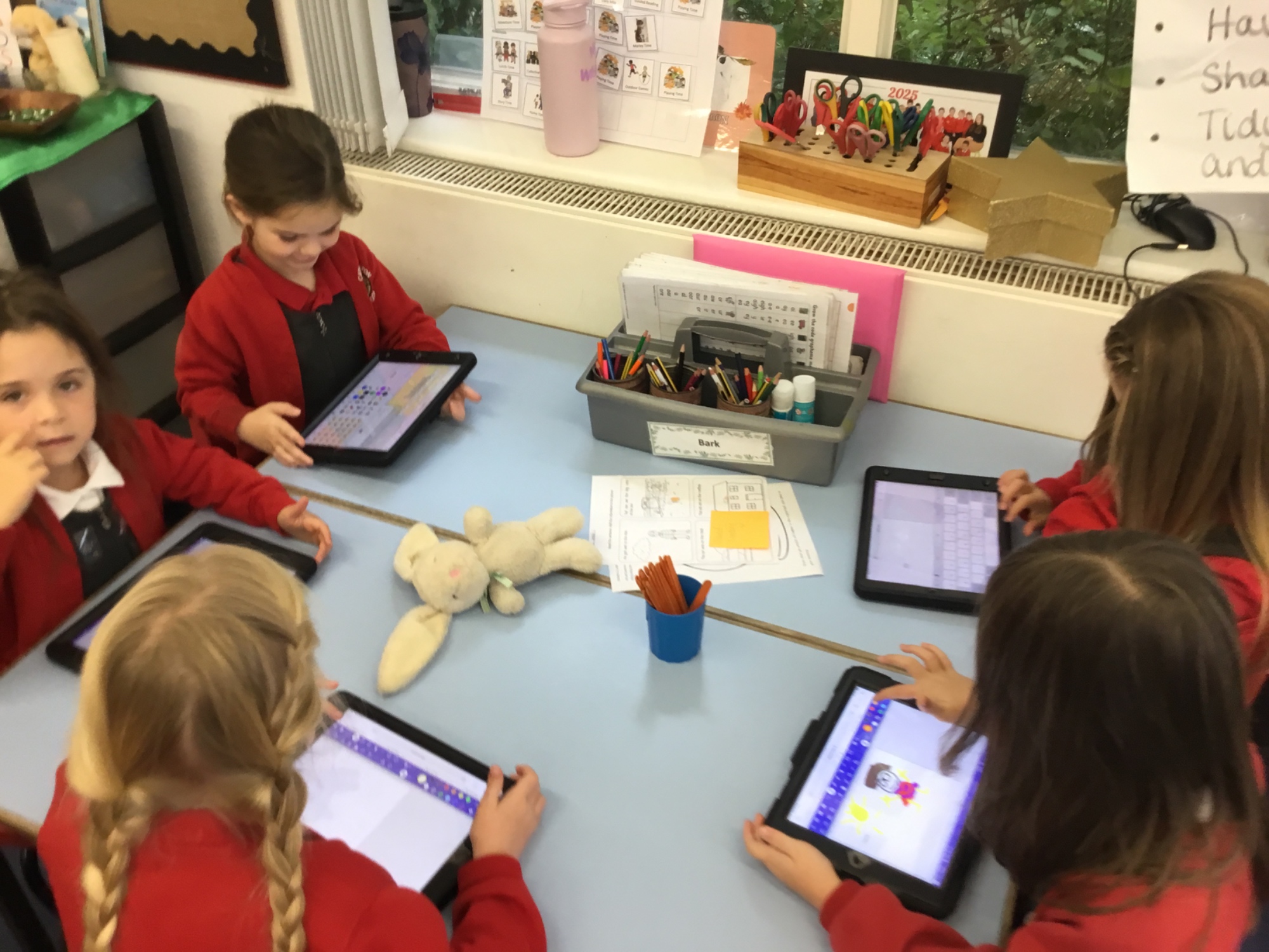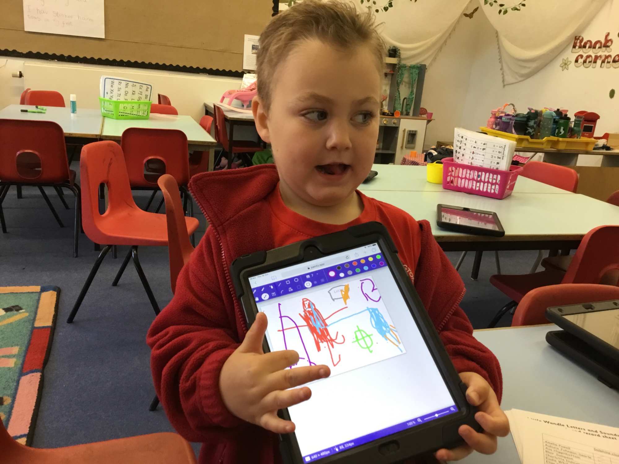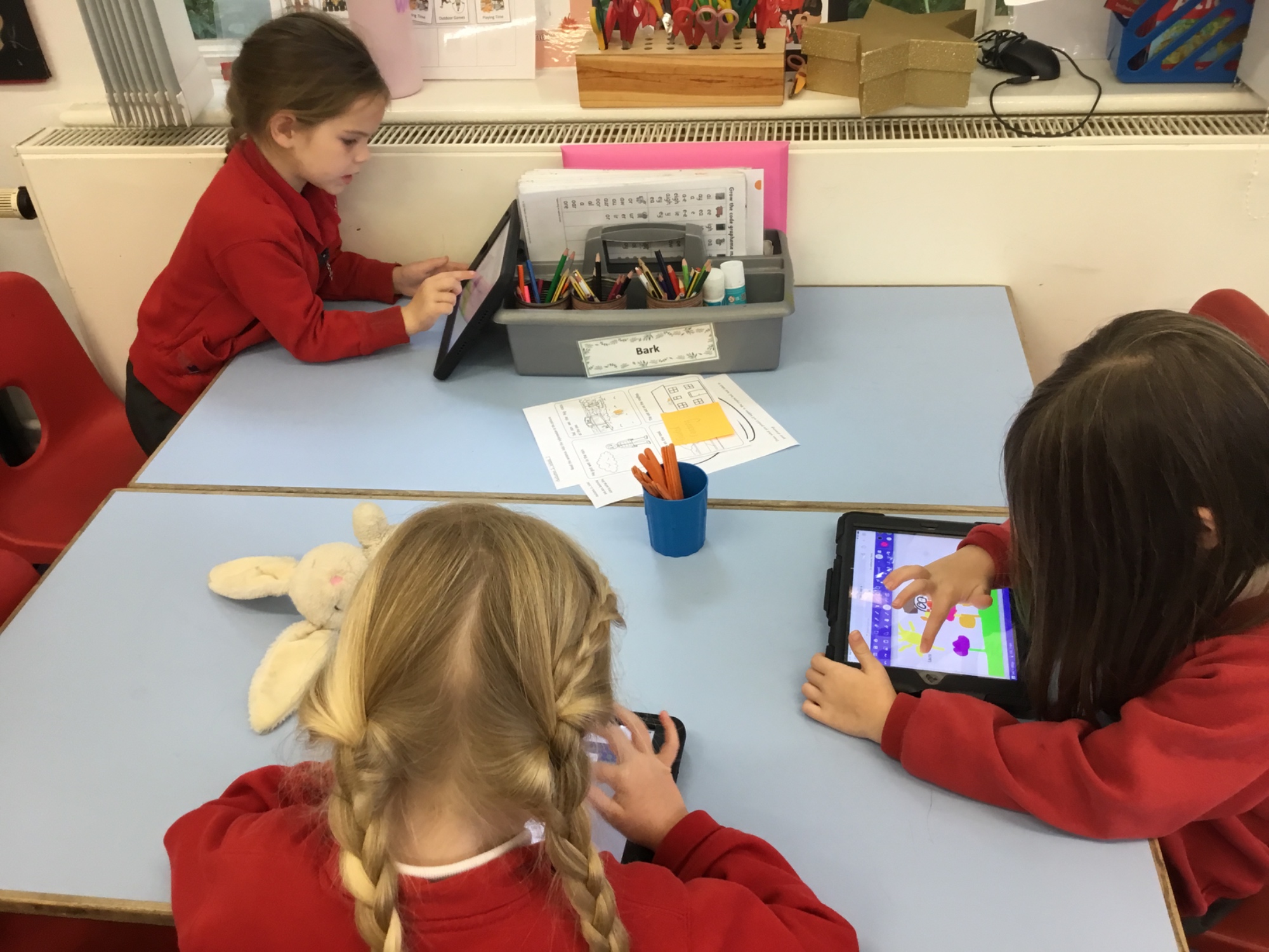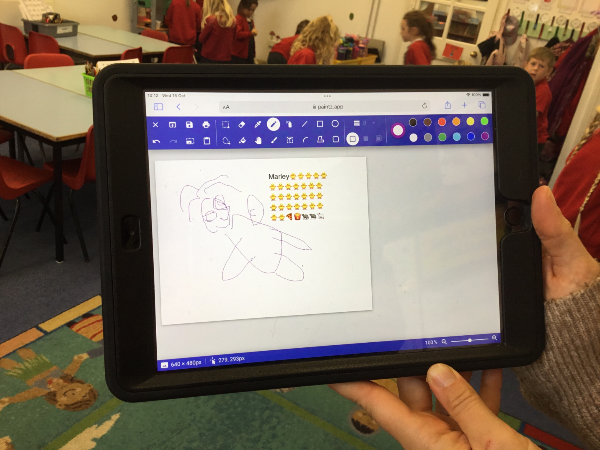 In computing this week, the children were learning to type on a keyboard on the iPads to write their names. They used the app Paintz to first create a text box to type their name into and then they used the shift arrow to write a capital letter to start their names. The children were then asked to draw a picture of themselves to practise using the drawing tools they learnt about last week.