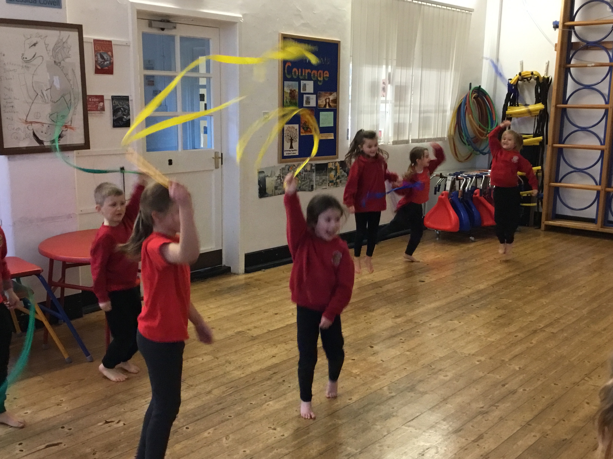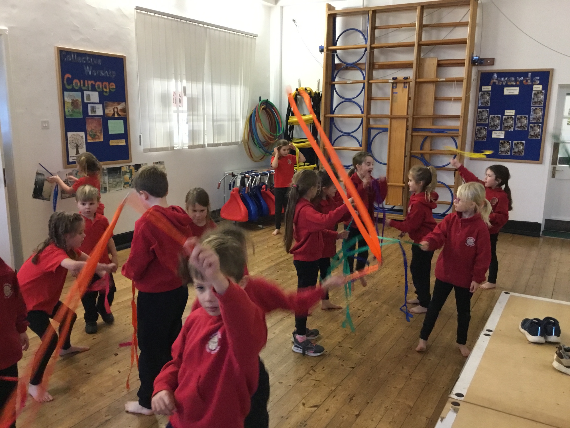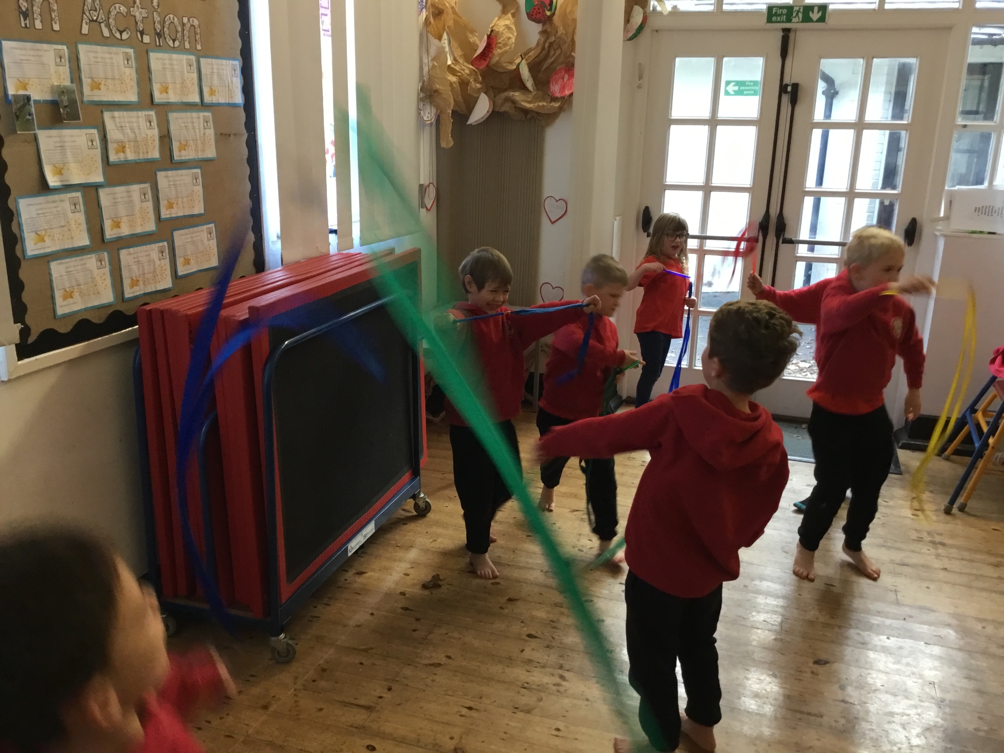 This week the children learnt the need to make their dance moves bigger when introducing the use of rhythmic ribbons. The children created their own dance movements to represent the fire and smoke from the Great Fire of London and worked together to create a choreographed dance with the ribbons.