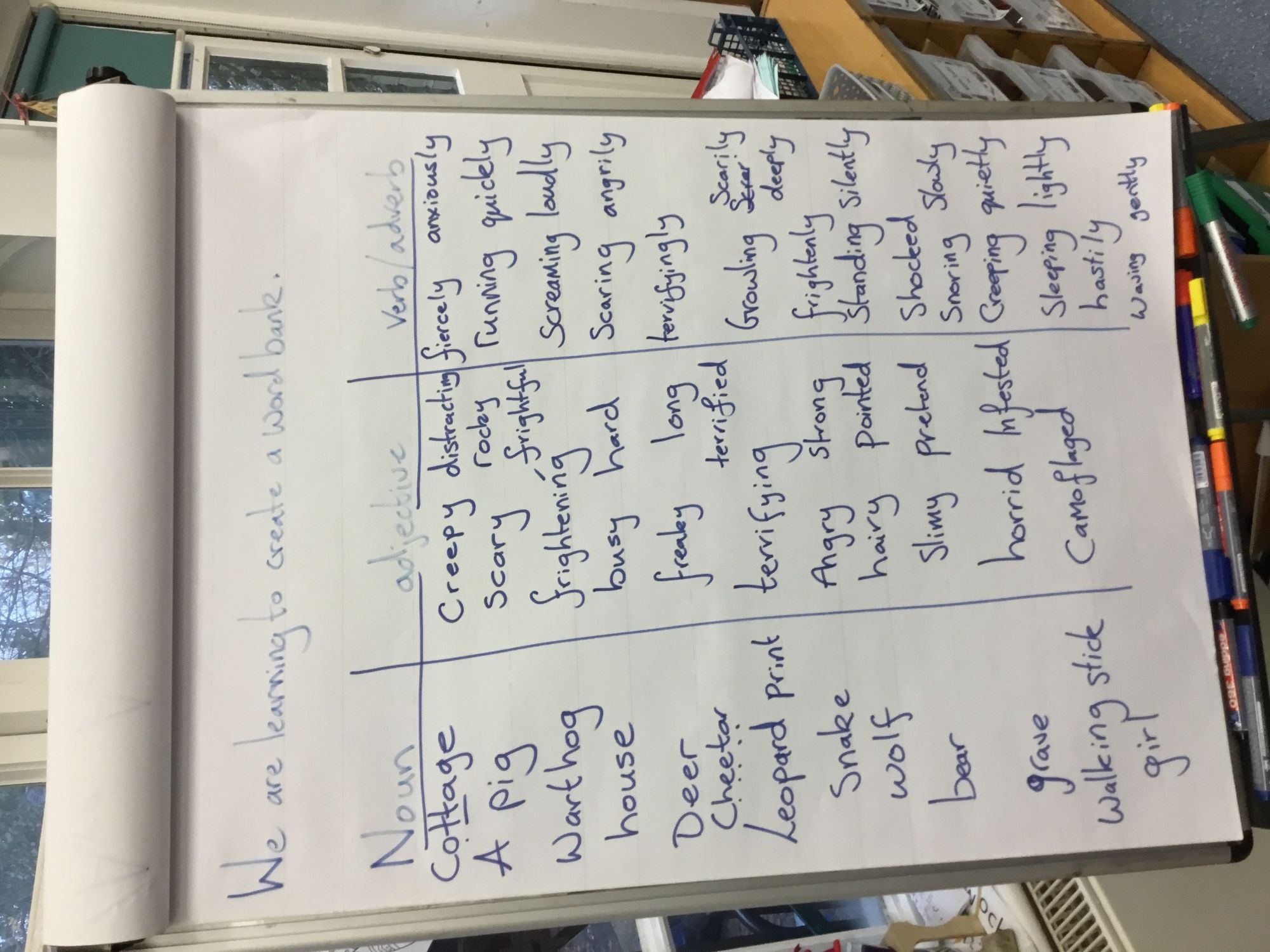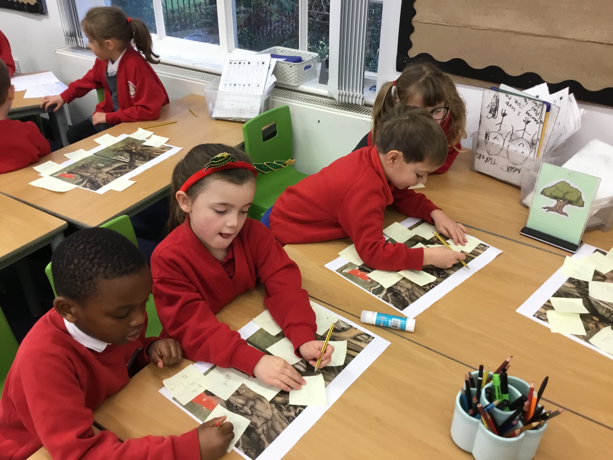 This week we used the illustrations of Anthony Browne's The Tunnel to label nouns and think about appropriate adjectives, verbs, and adverbs to make complex sentences to describe Rose's journey through the forest.
