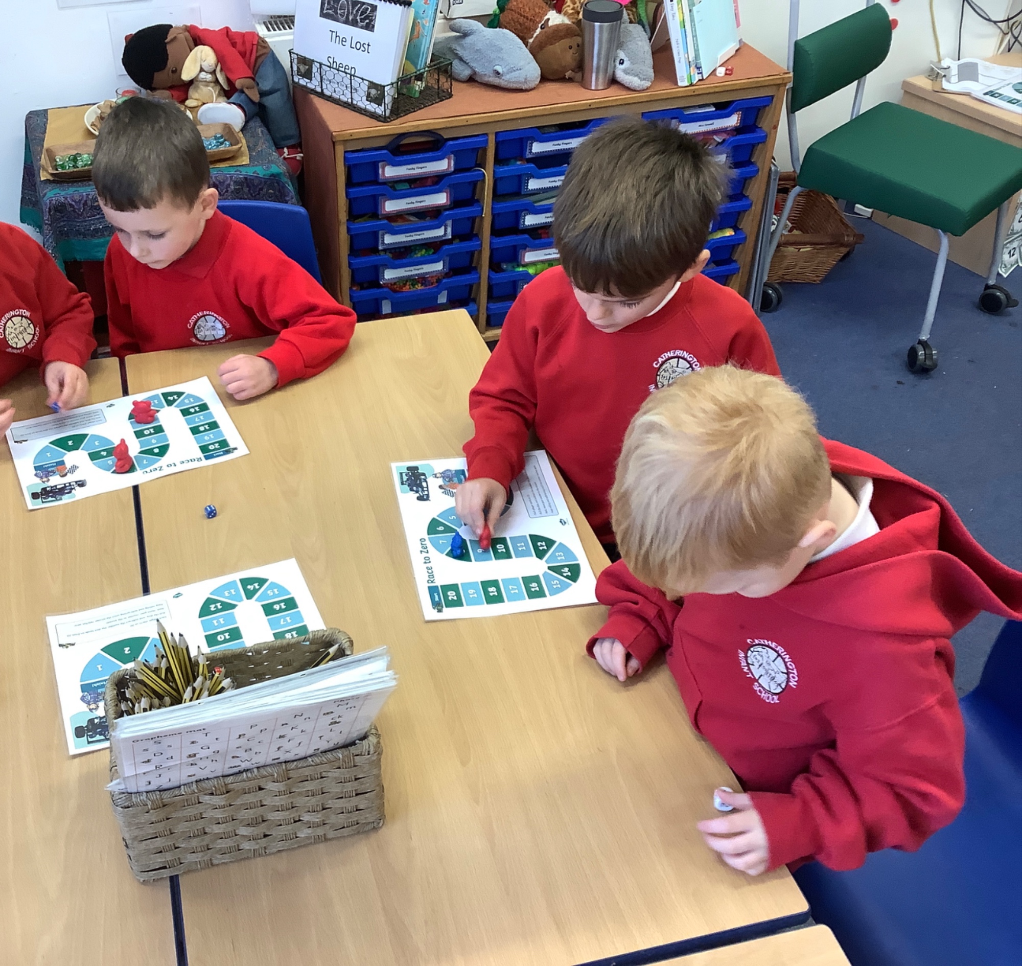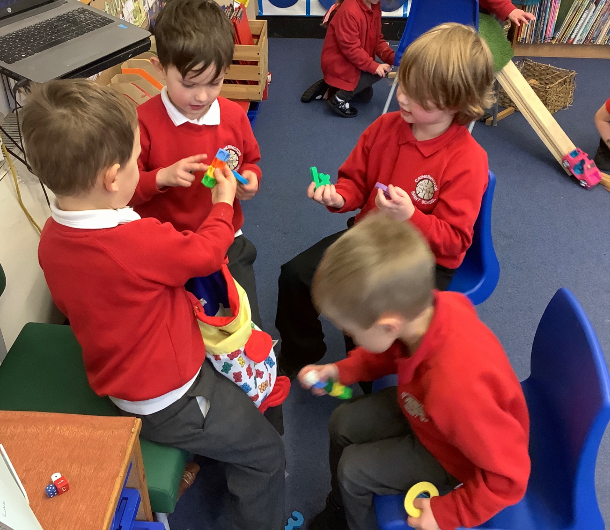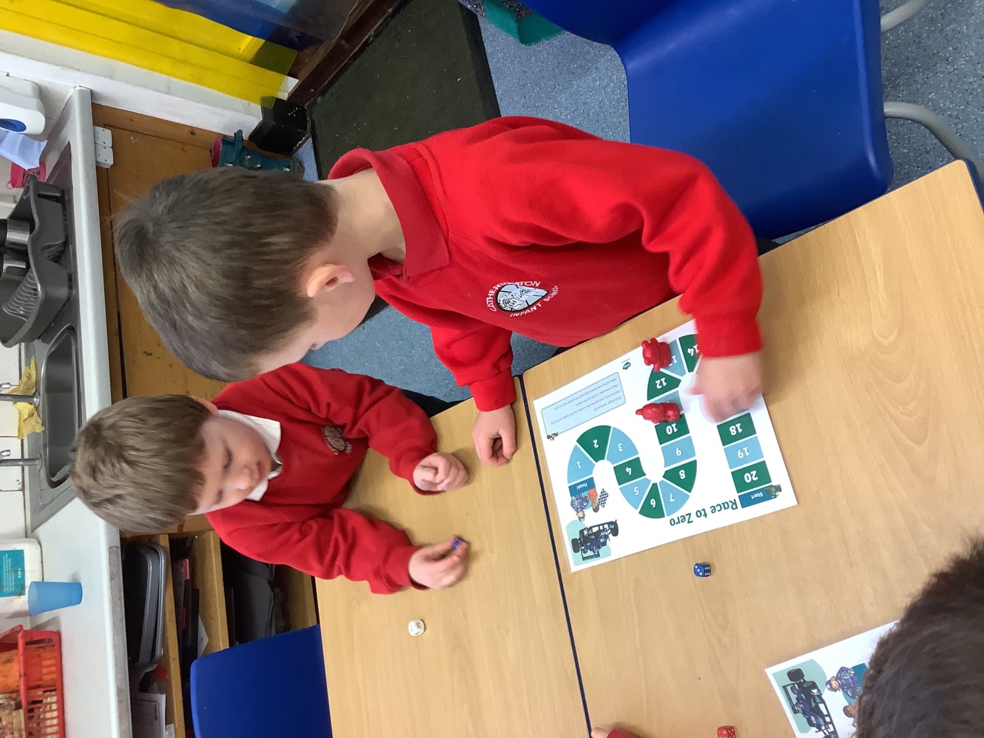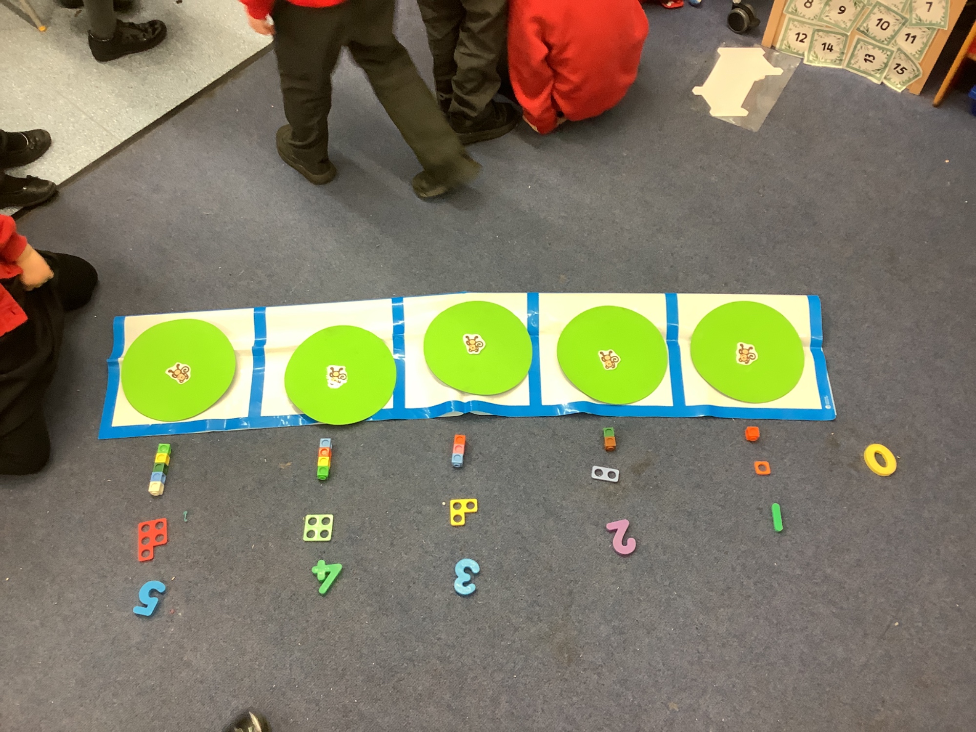 In maths we looked at the number 0. We remembered that zero means 'nothing' and that it is 'one less than one'. We played games with dice and number tracks, matched numerals to towers, sang about five little monkeys and explored different representations of 0.