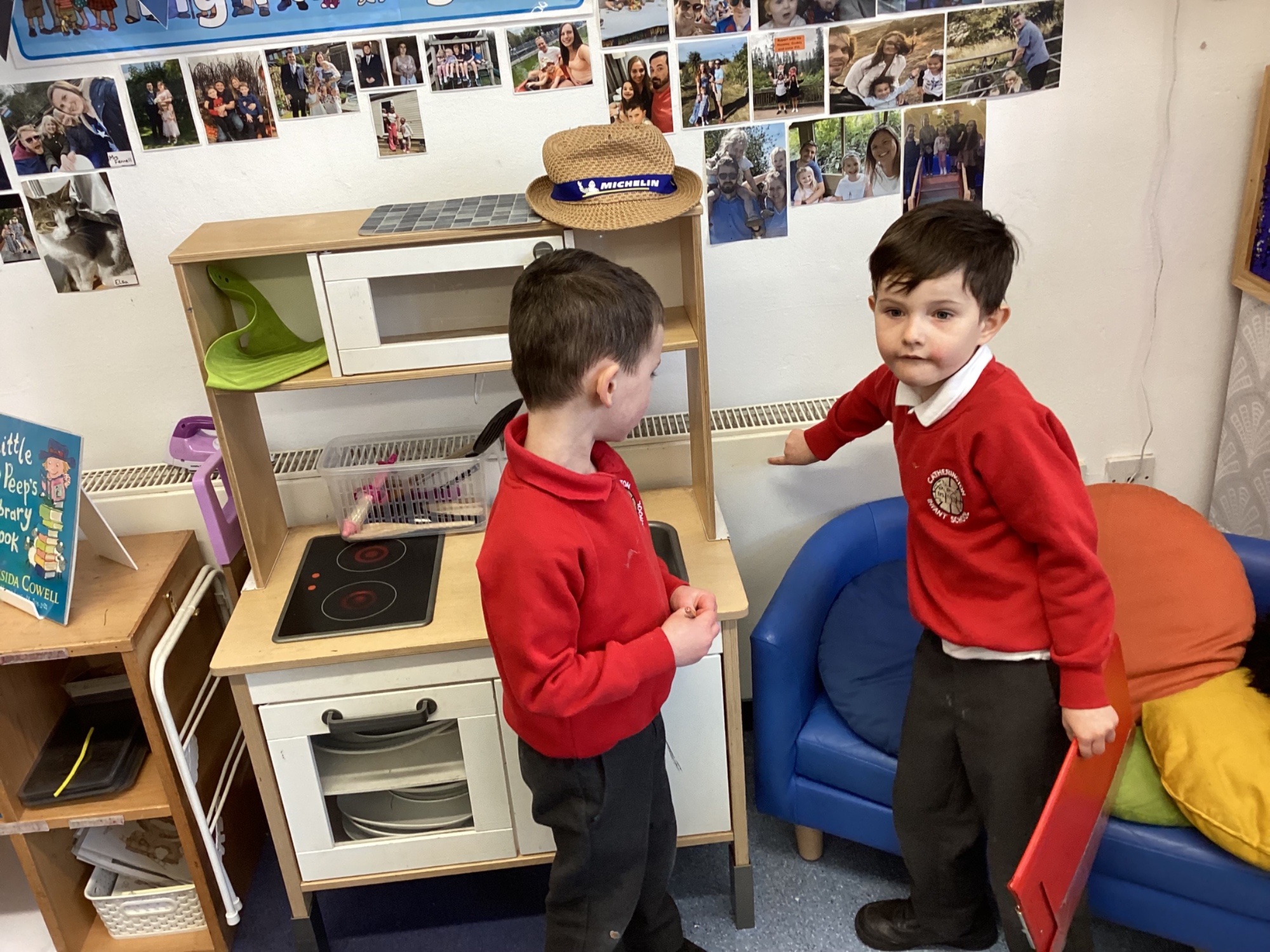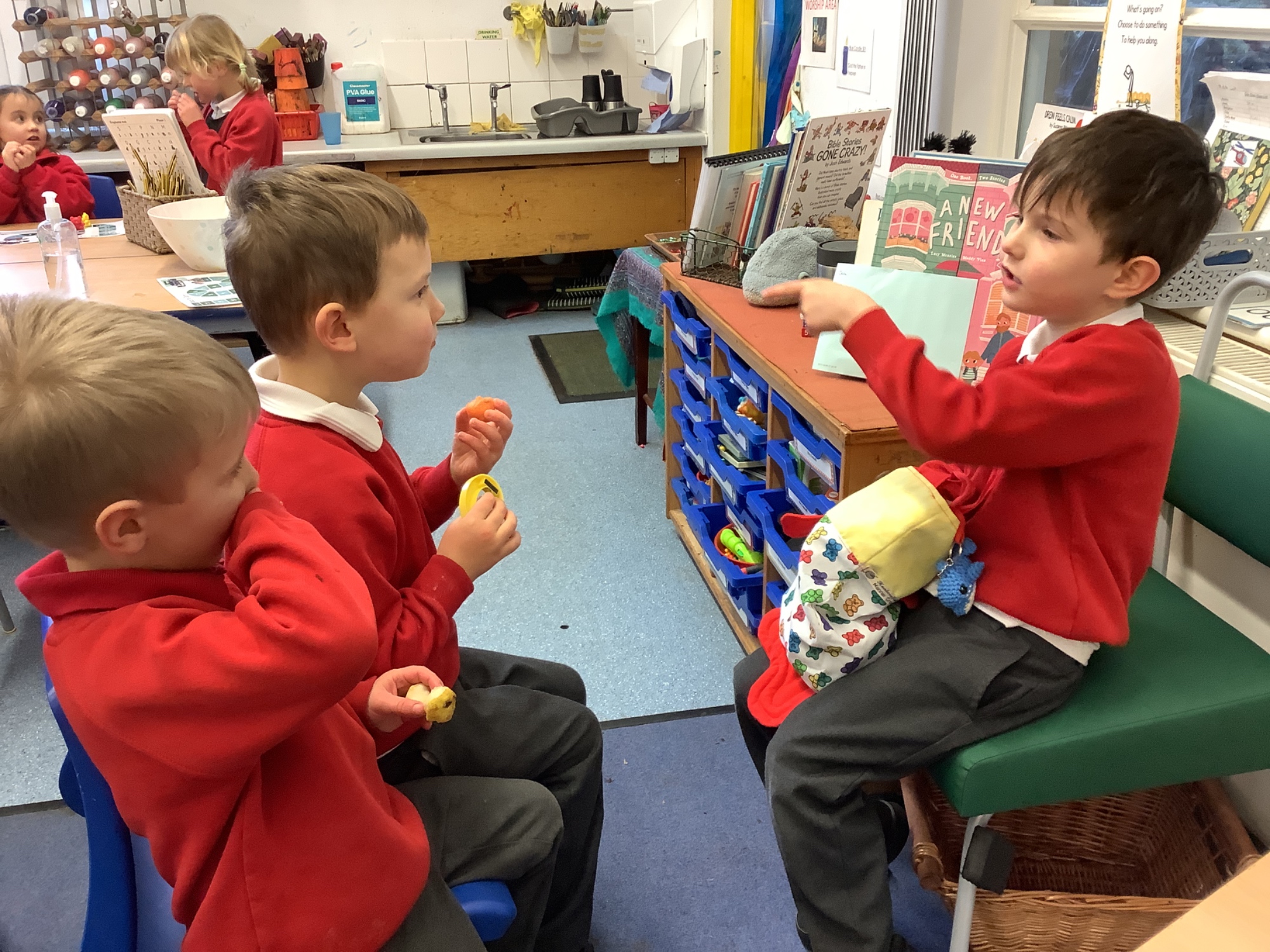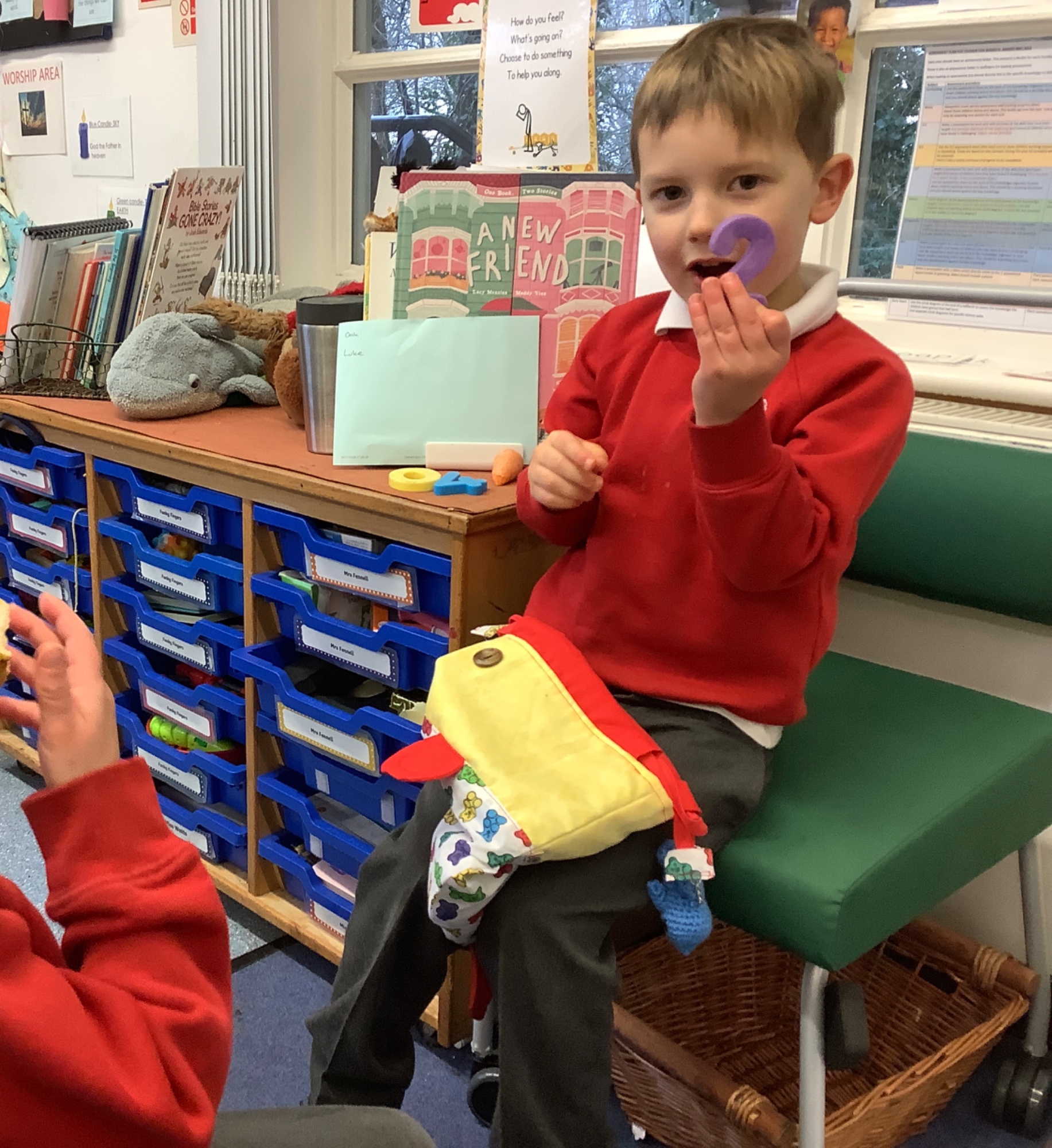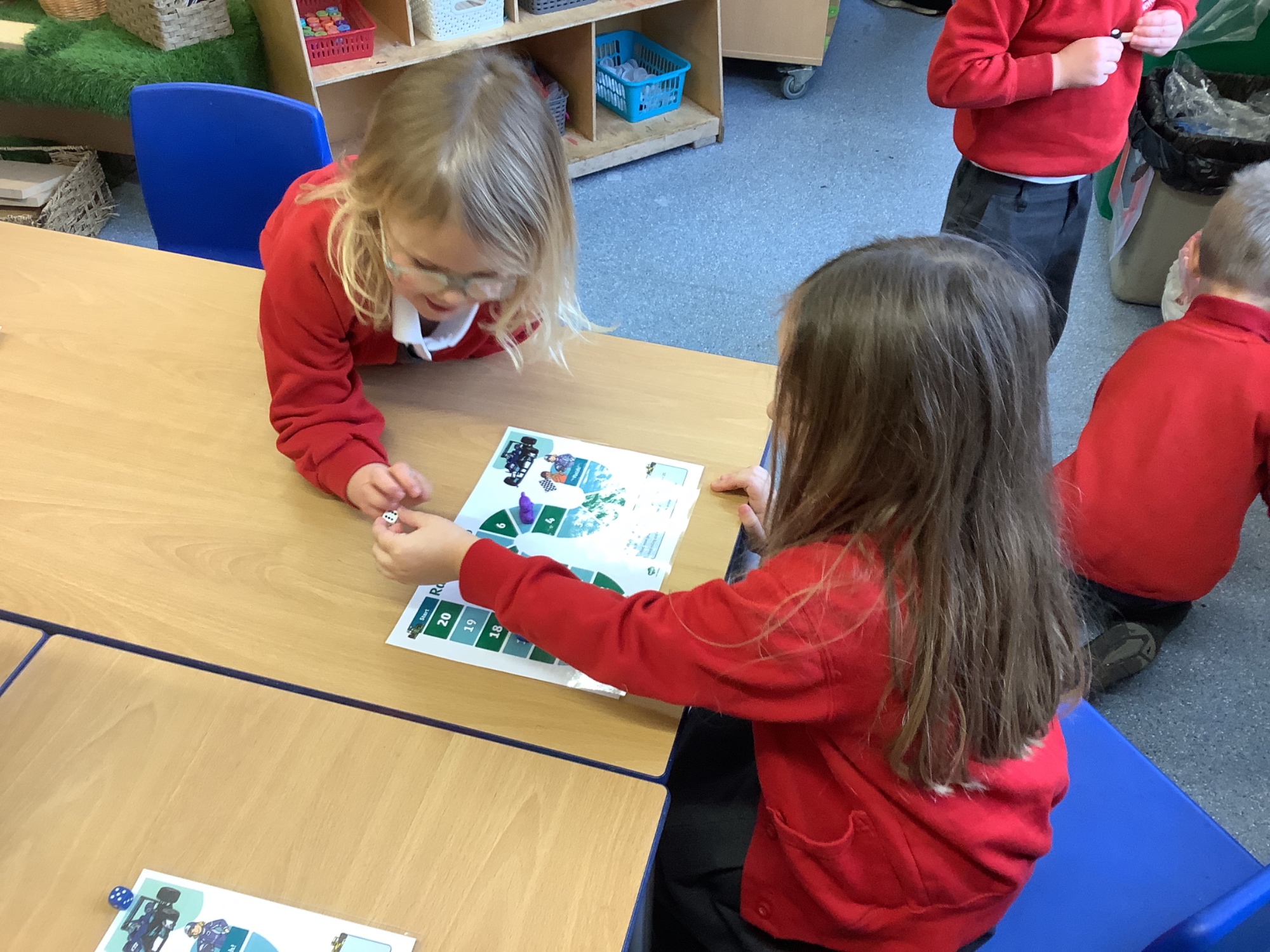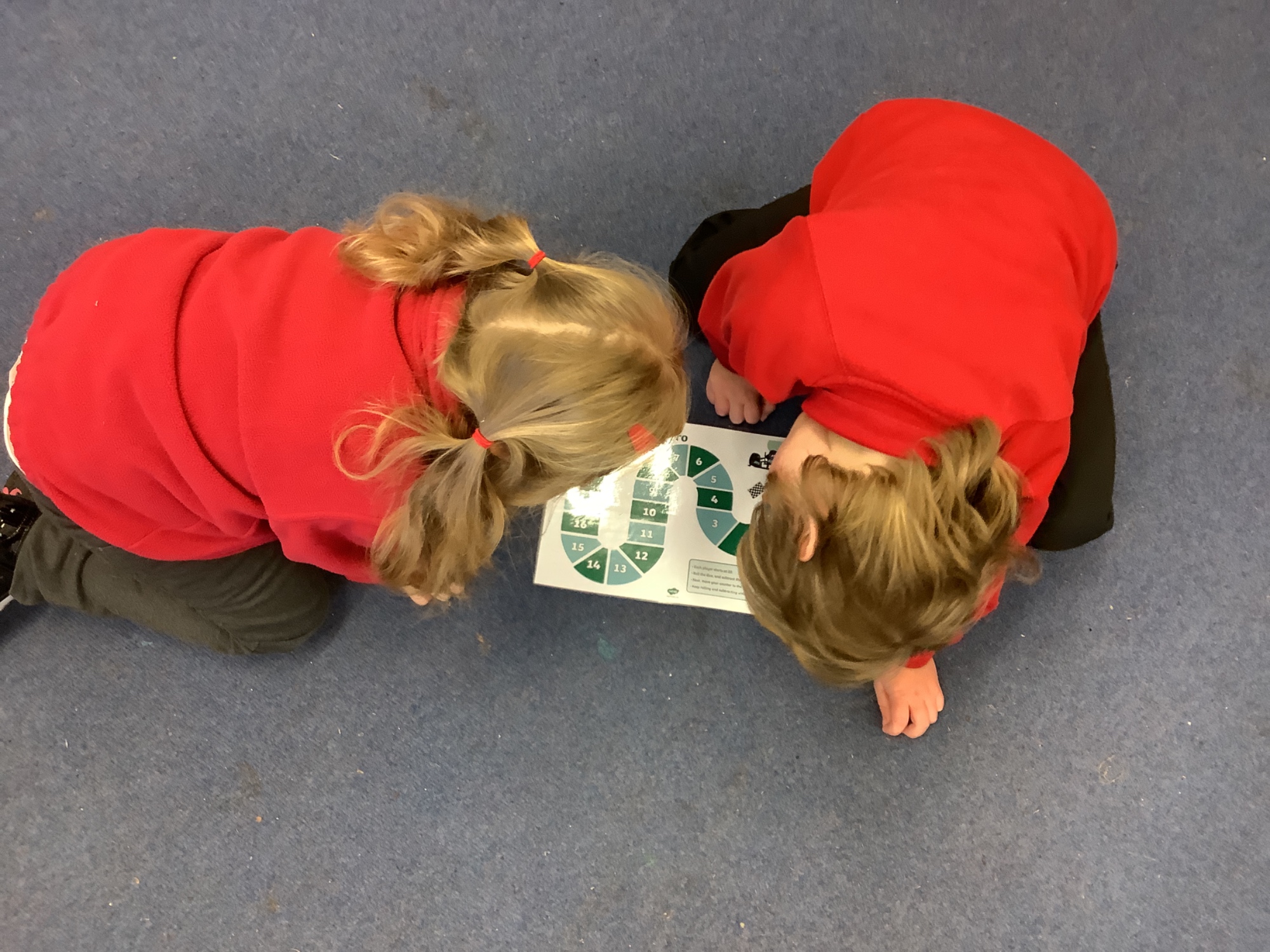 In maths we looked at the number 0. We remembered that zero means 'nothing' and that it is 'one less than one'. We played games with dice and number tracks, matched numerals to towers, sang about five little monkeys and explored different representations of 0.