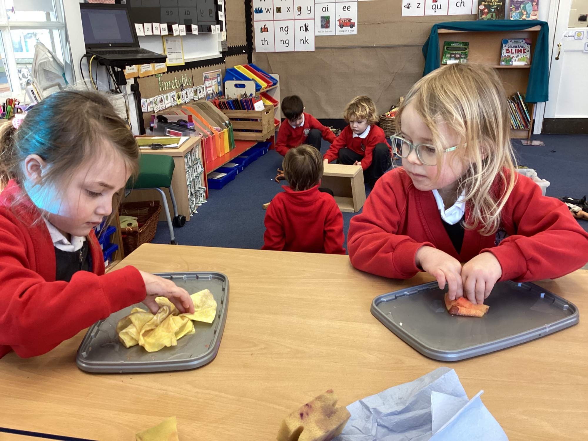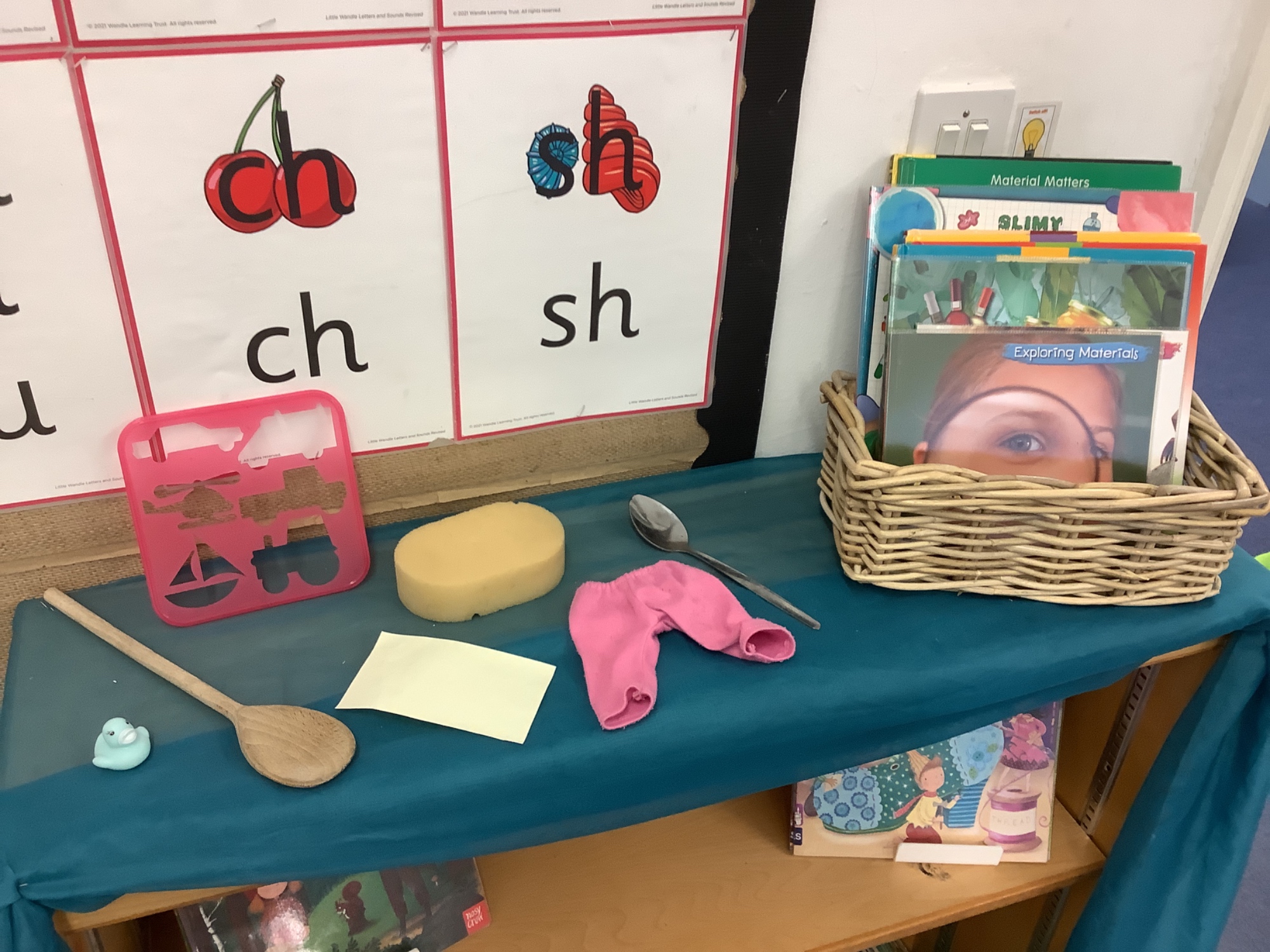 We began to learn about different materials and went on a hunt around the school. We found a lot of wood, plastic, metal and glass. In Discovery Time we put different materials in water to see what would happen. We found out that sponges, paper towels and cloths are absorbent.