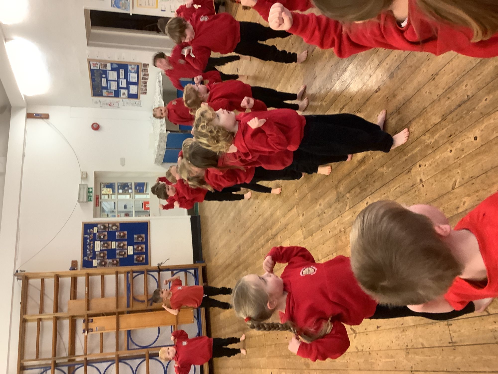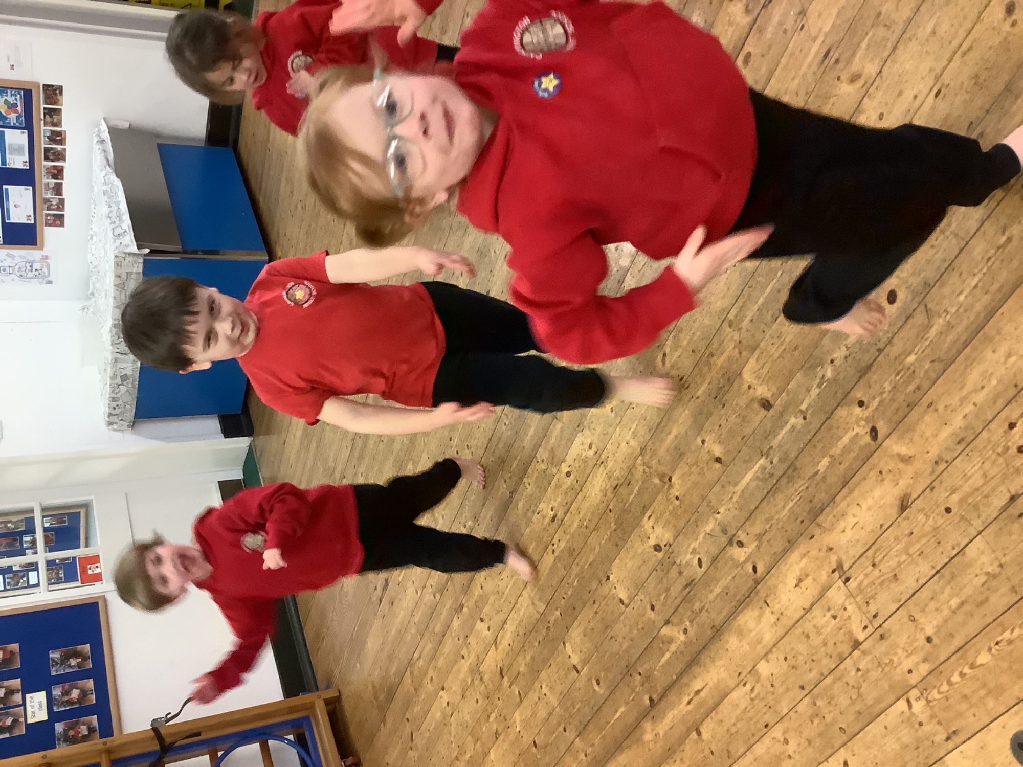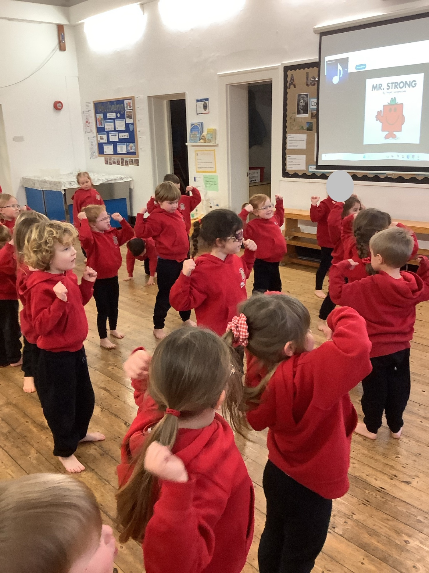 In PE we made a new dance routine using movements we thought Mr Strong might make with his square body. It was fun to compare our jelly movements to our strong movements - they were very different!