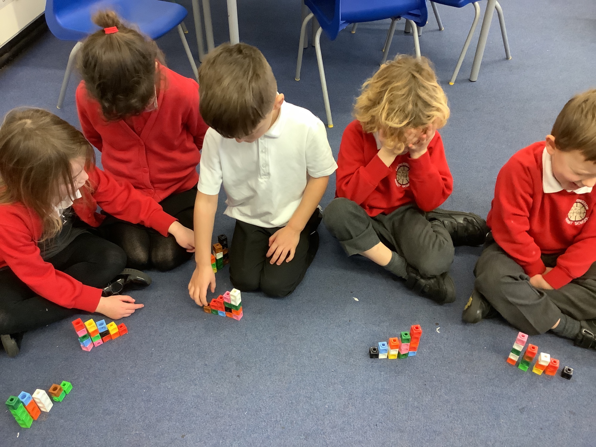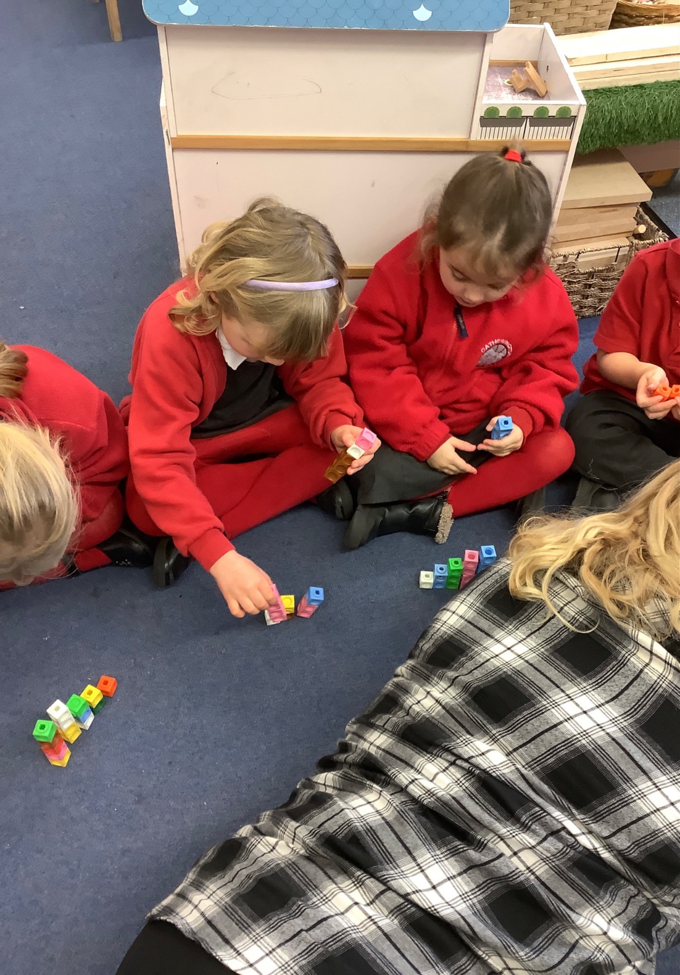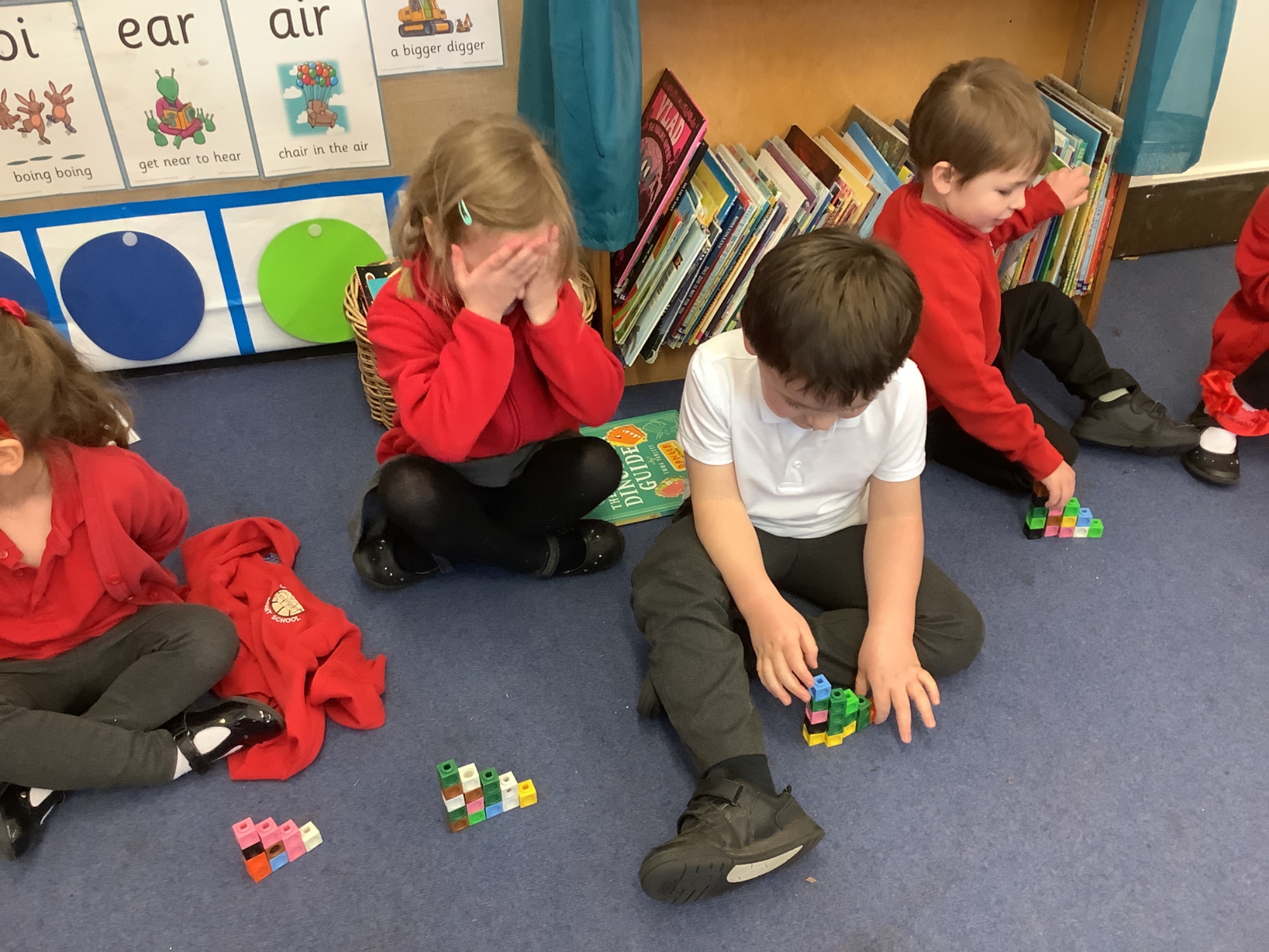 In maths we made towers using cubes and noticed that they made a staircase pattern when we put them in the right order. We played a game of 'Who's Hiding?' with our friends by hiding one of the towers and asking them which one was missing.