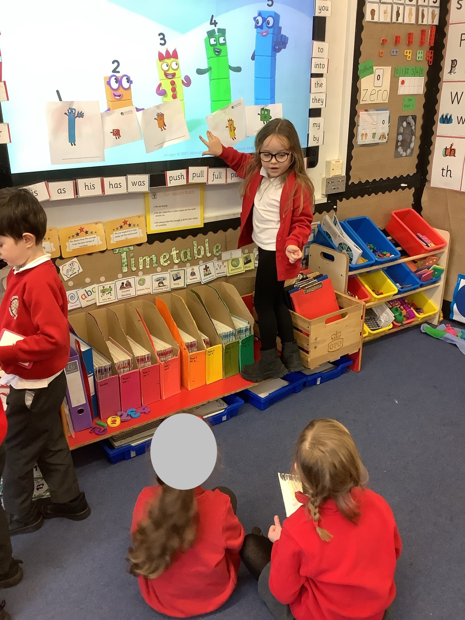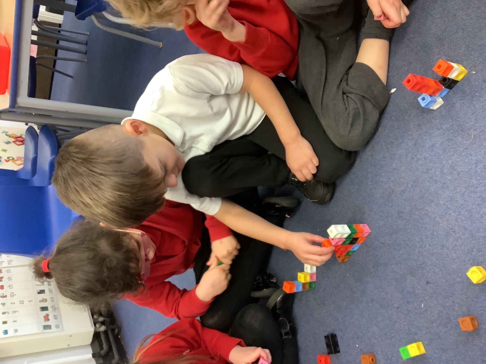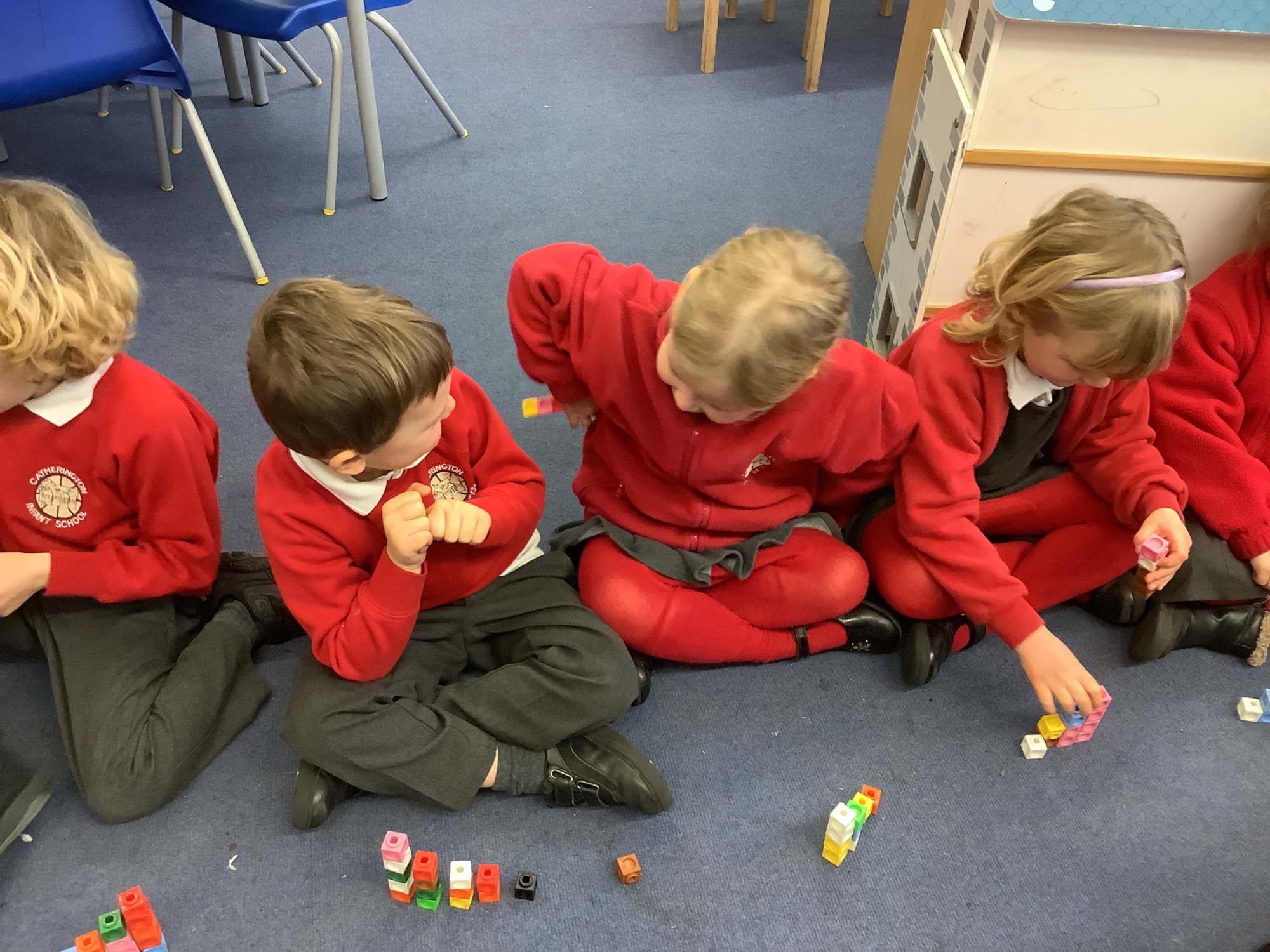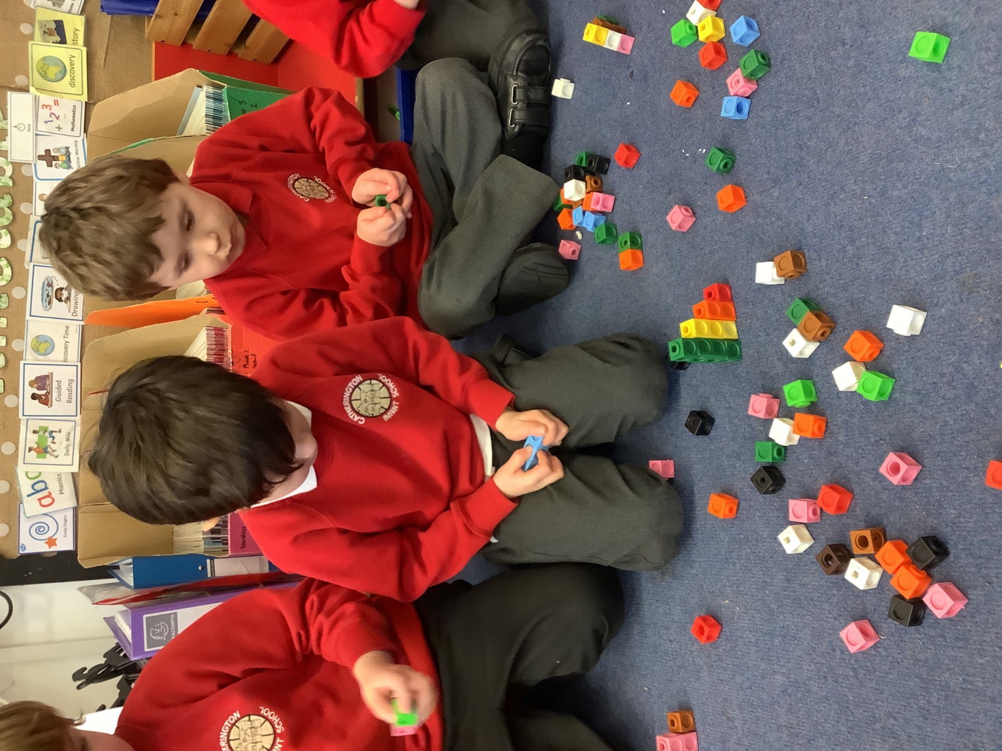 In maths we made towers using cubes and noticed that they made a staircase pattern when we put them in the right order. We played a game of 'Who's Hiding?' with our friends by hiding one of the towers and asking them which one was missing.