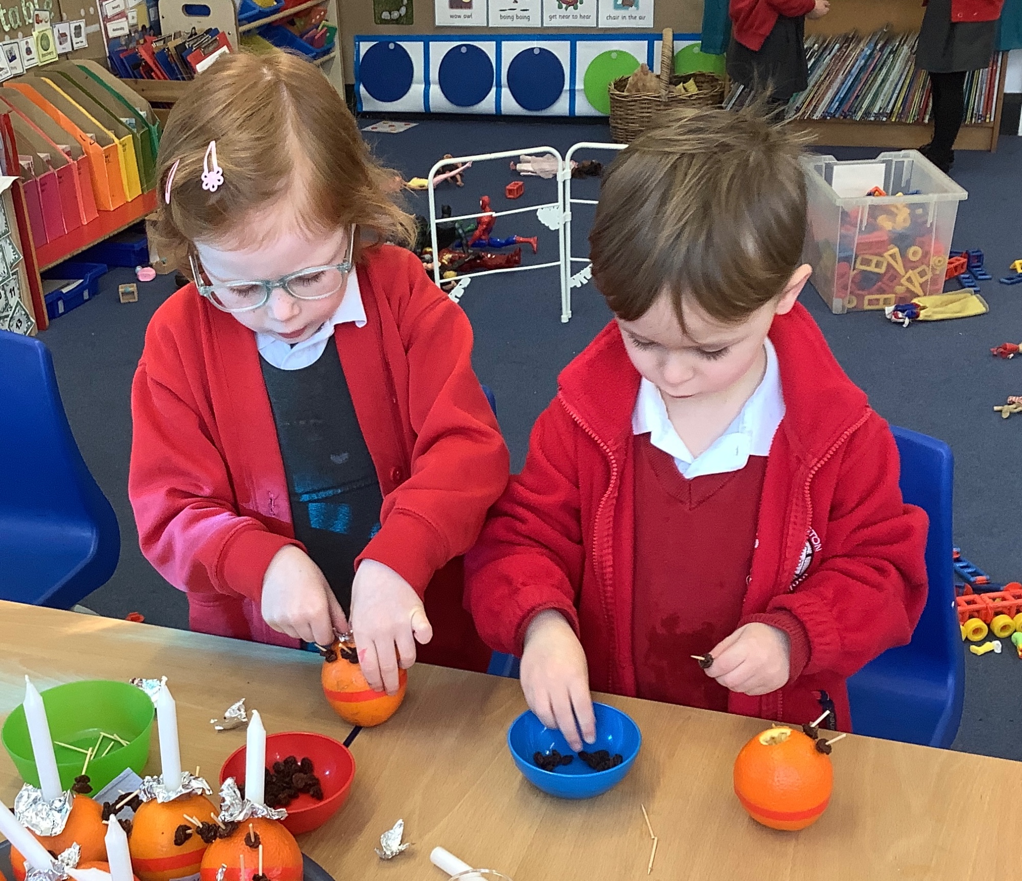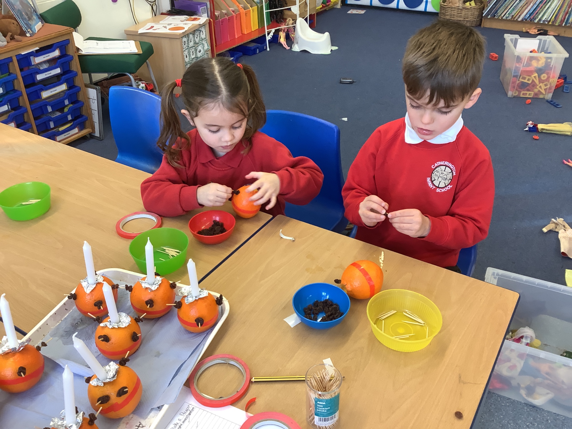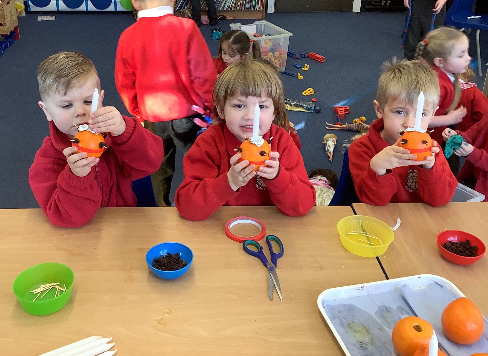 On Wednesday we learned about Christingle. We made our own Christingles using oranges, candles, raisins and a red ribbon, then took them to the church to enjoy a special service.