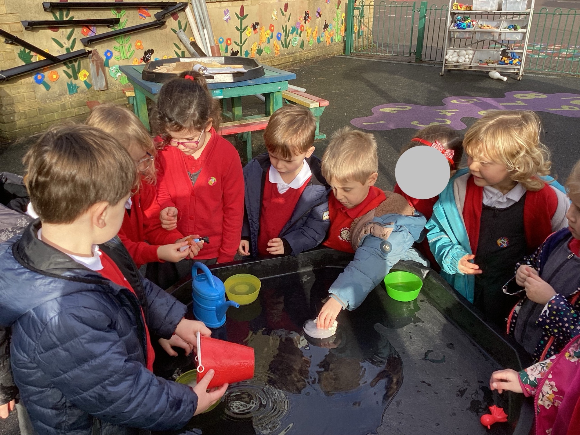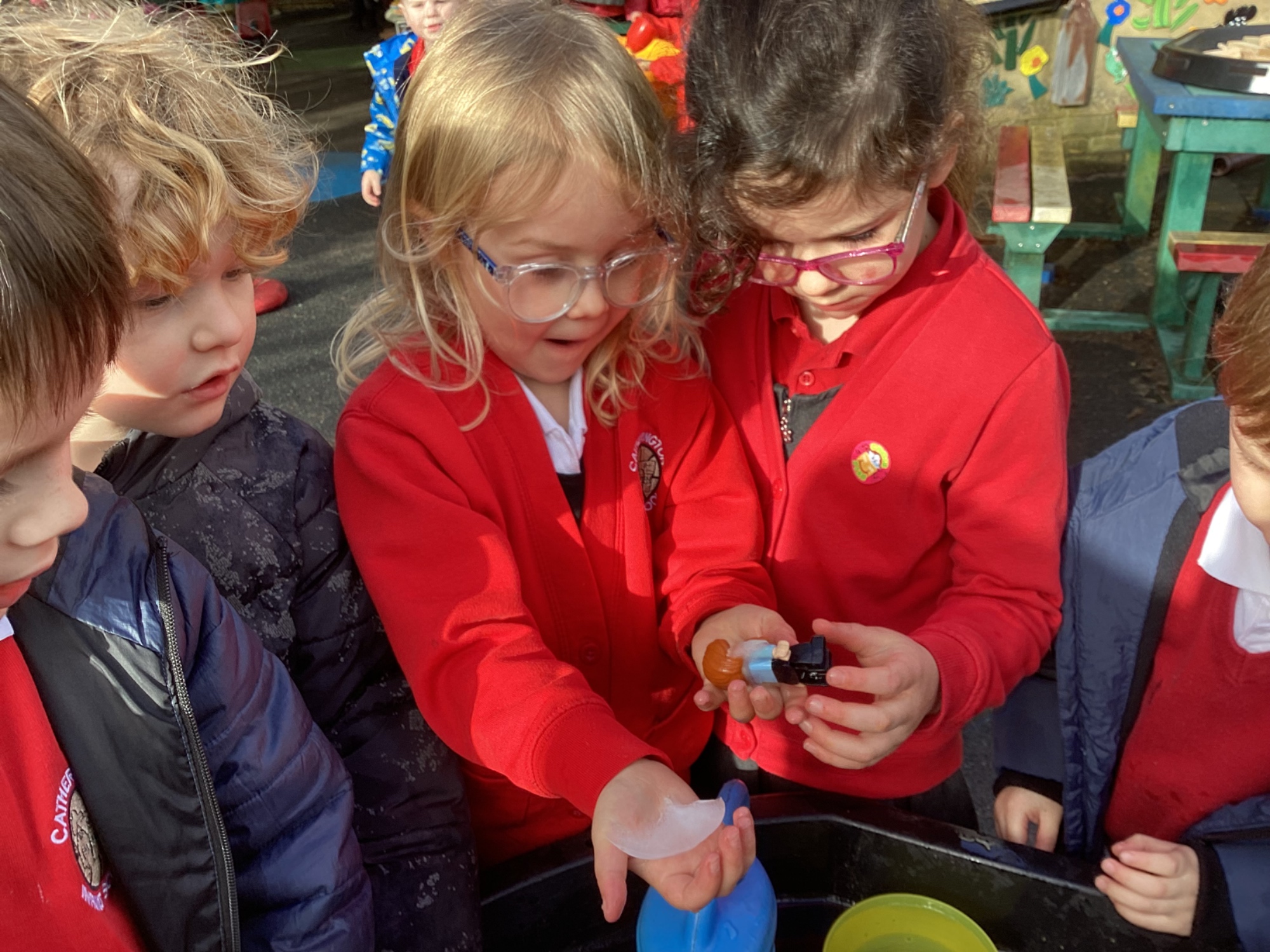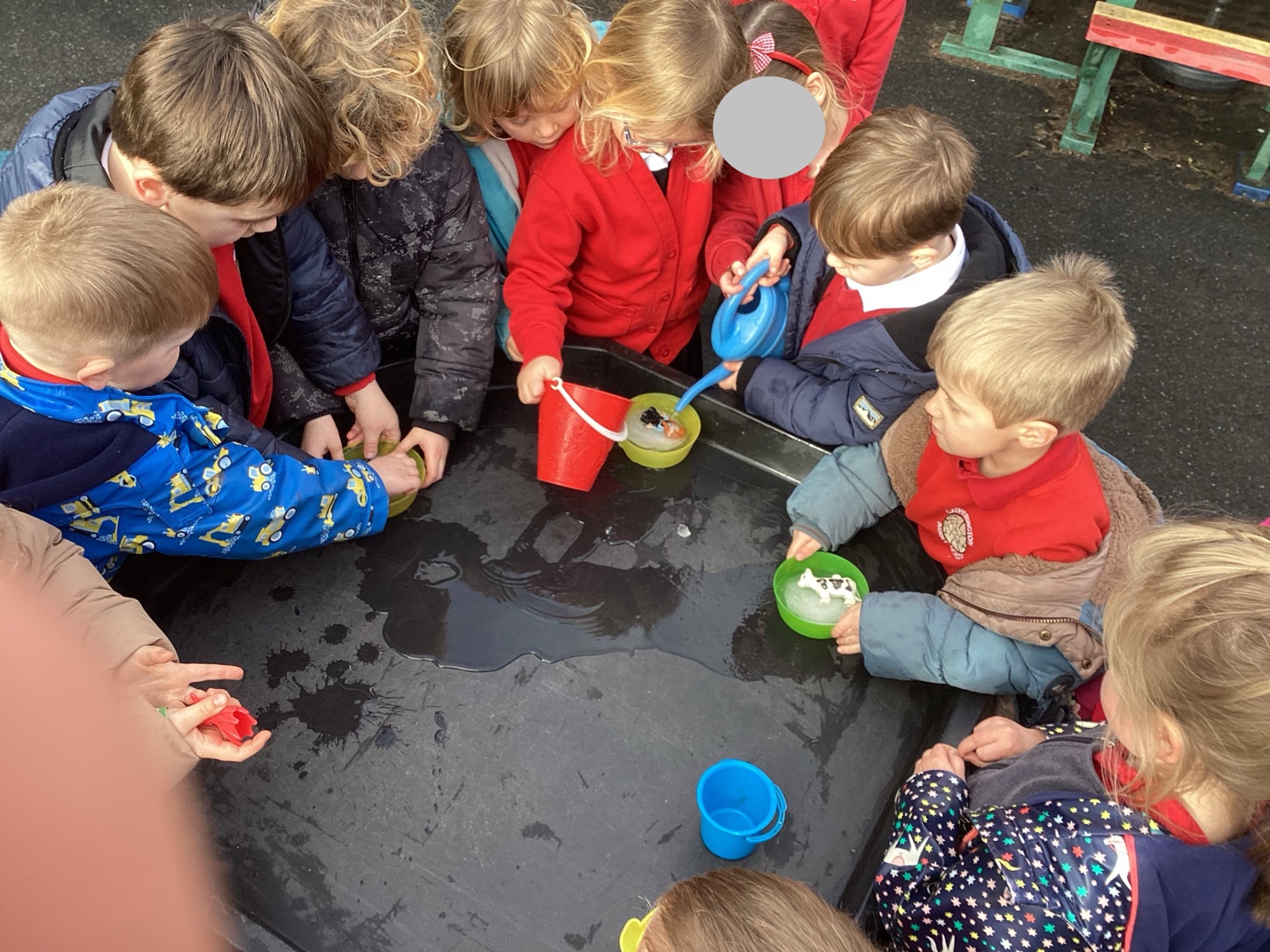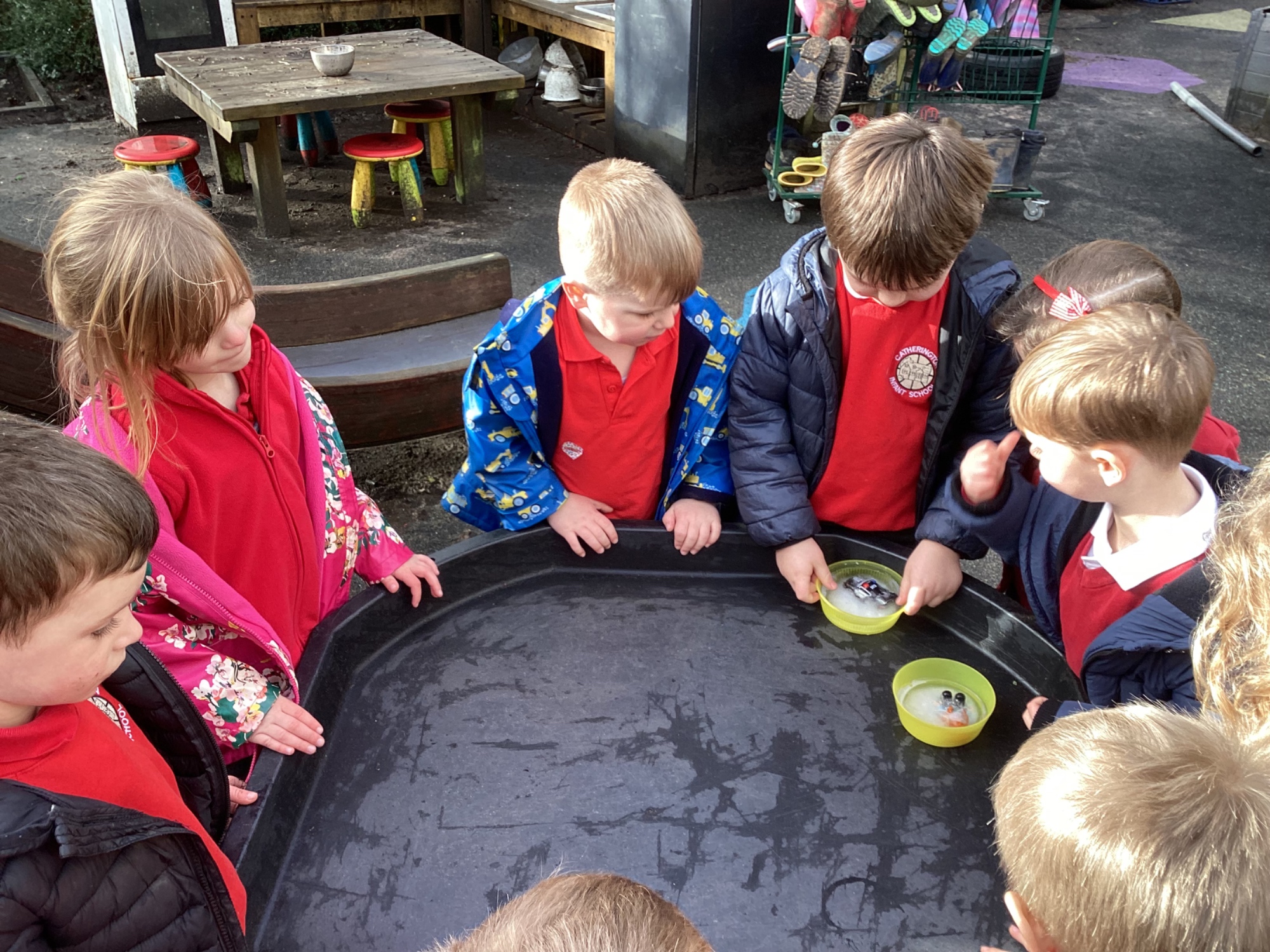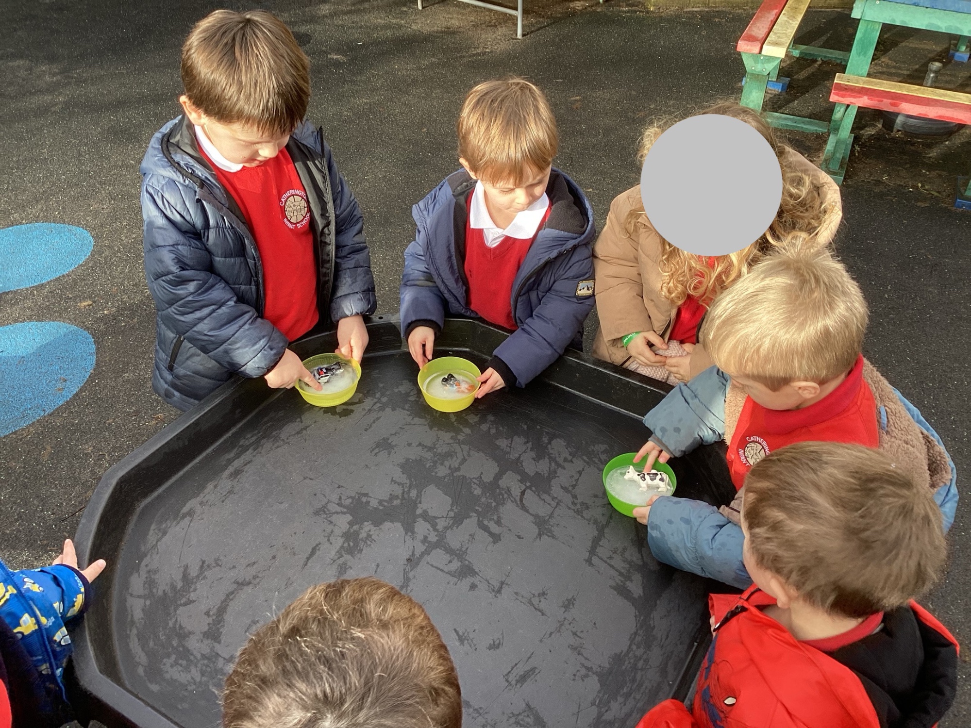 We enjoyed putting our knowledge of freezing and melting to the test by rescuing some frozen toys... we had to figure out how to get the toys out of the ice without smashing it. We used warm water, watering cans and our warm hands to get them out.