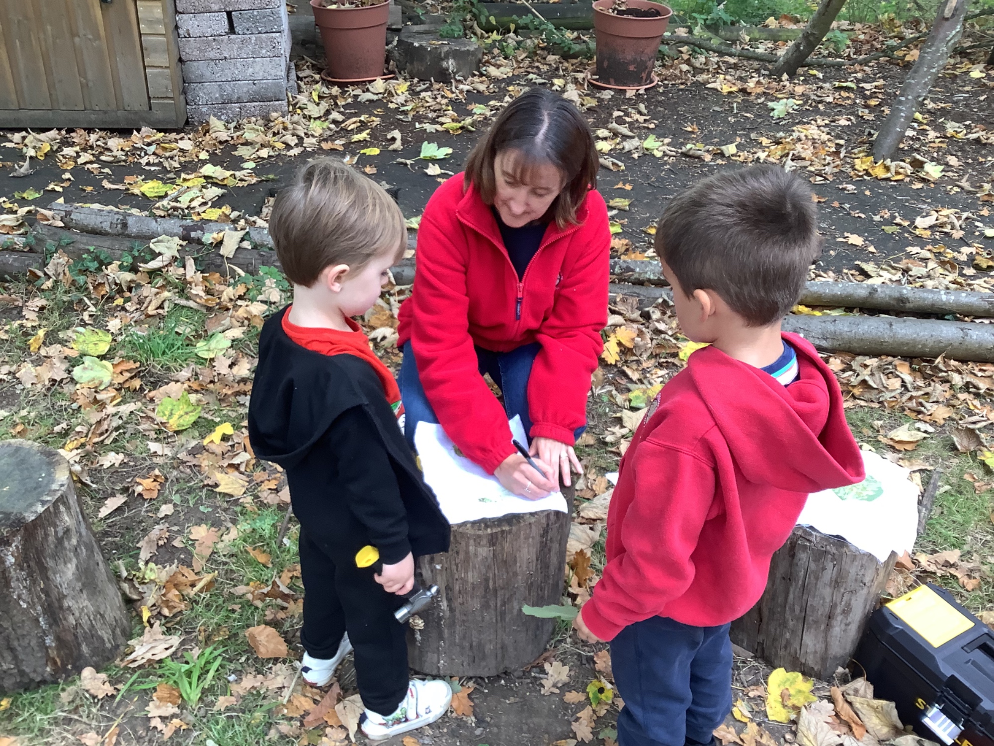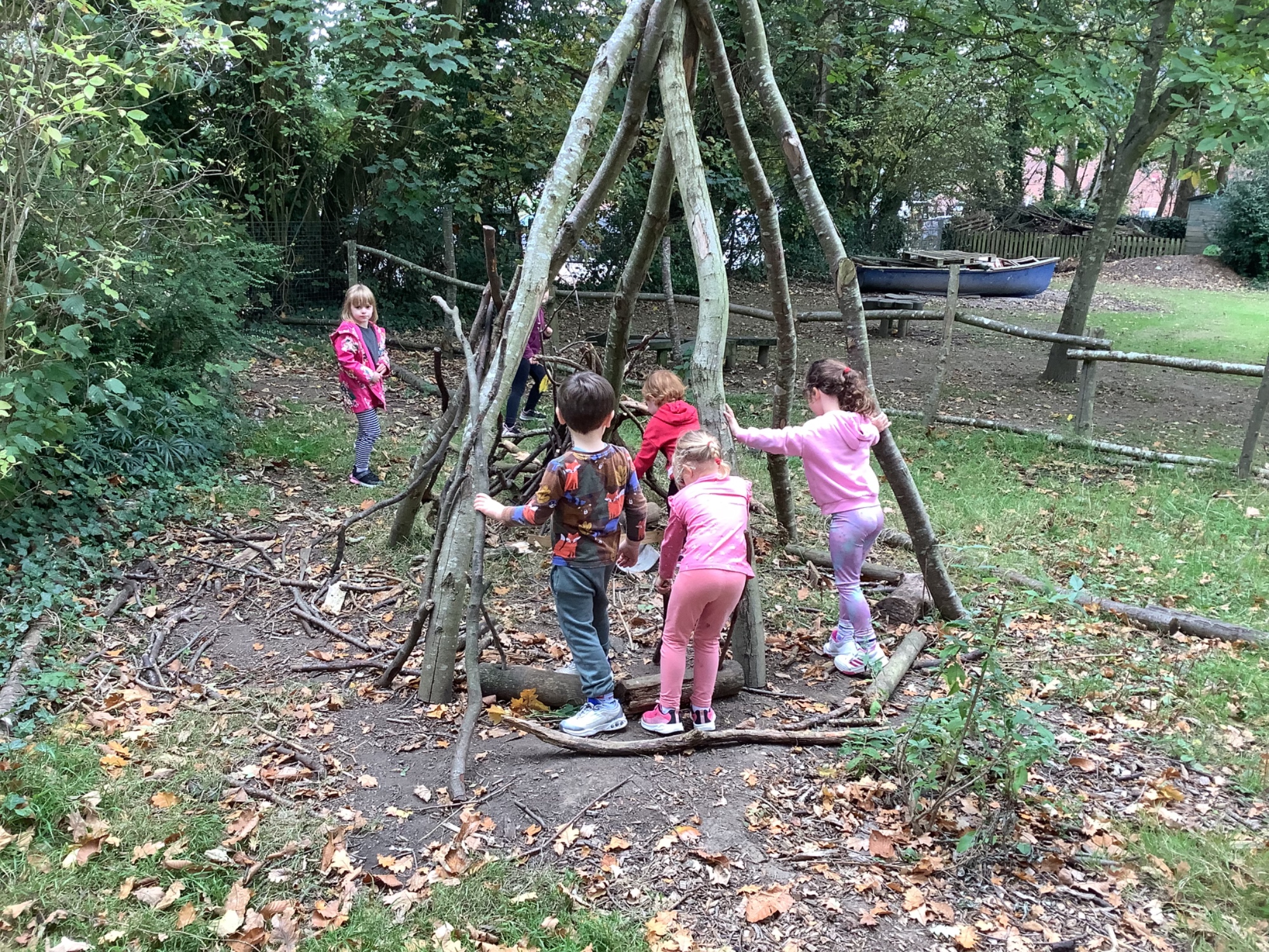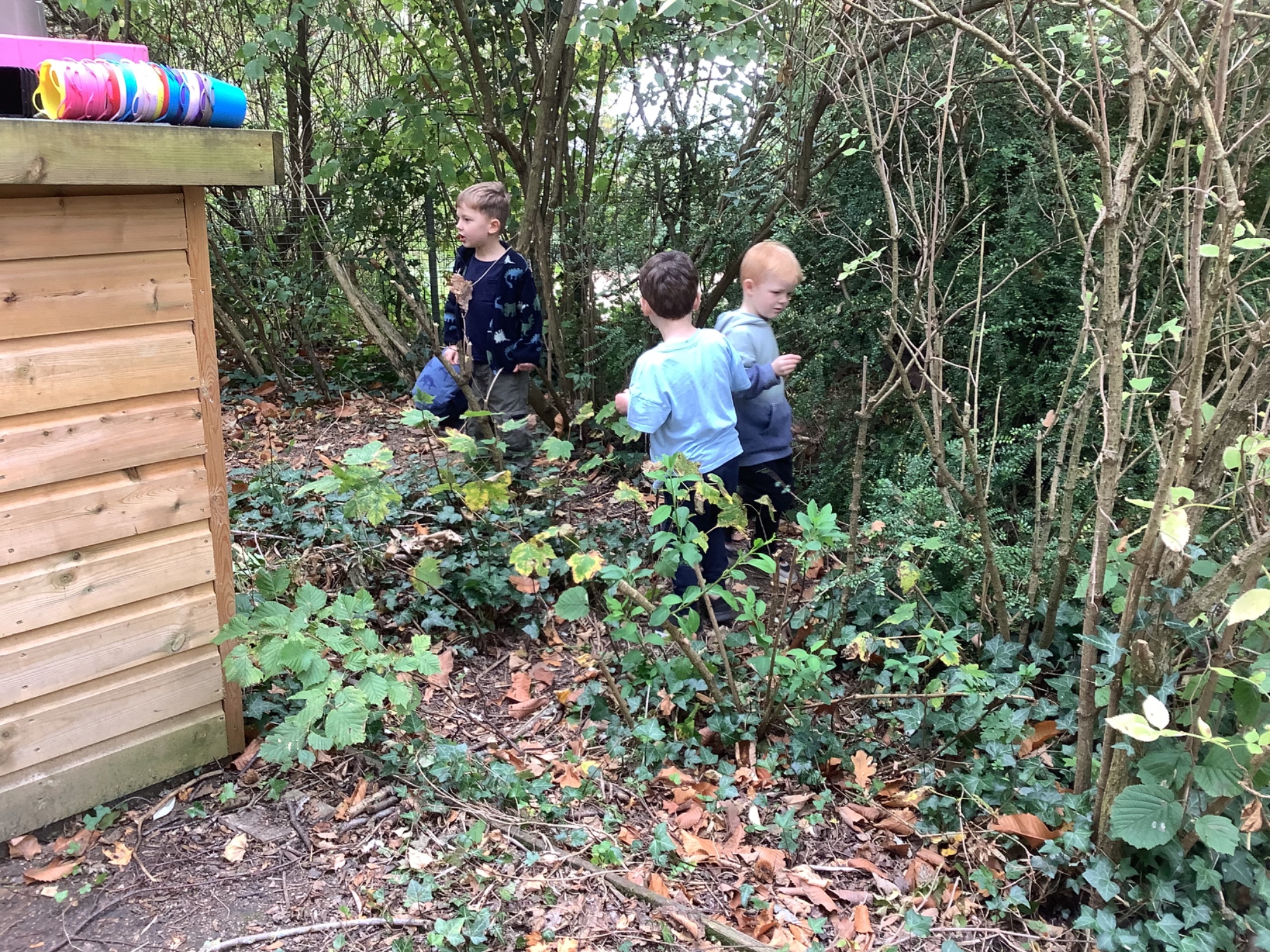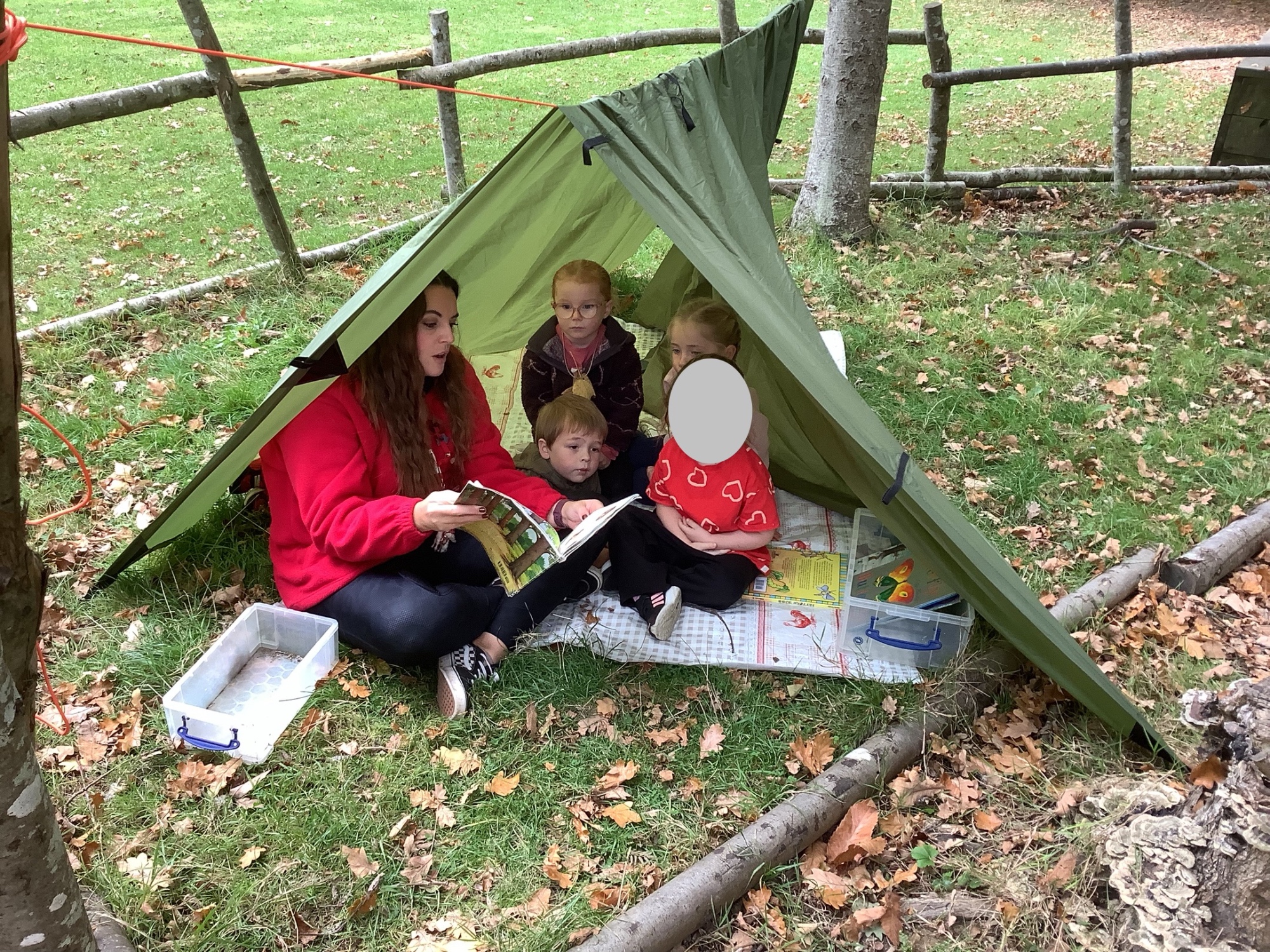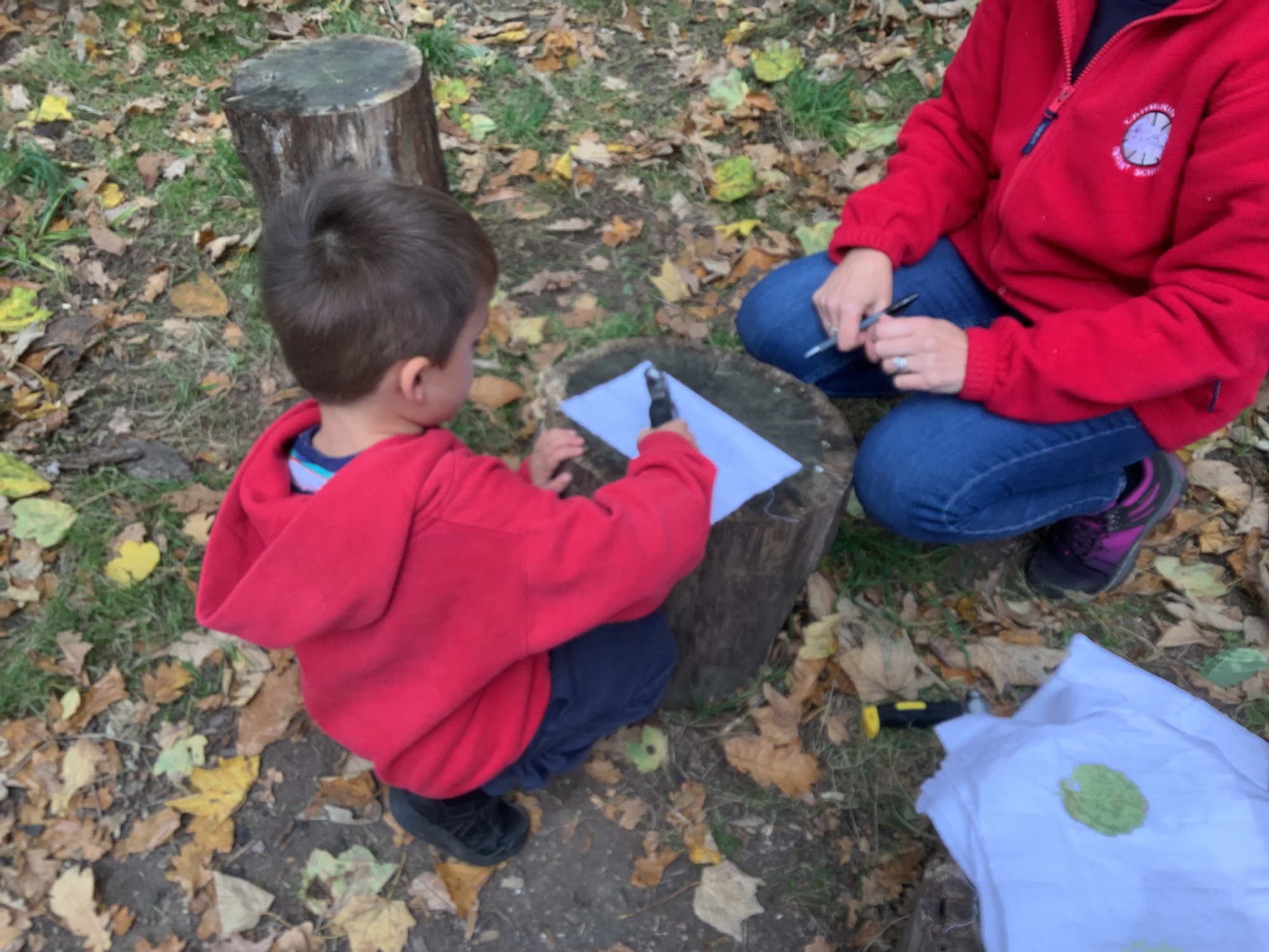 In Forest School we listened to stories, made leaf prints, built dens and made leaf necklaces.