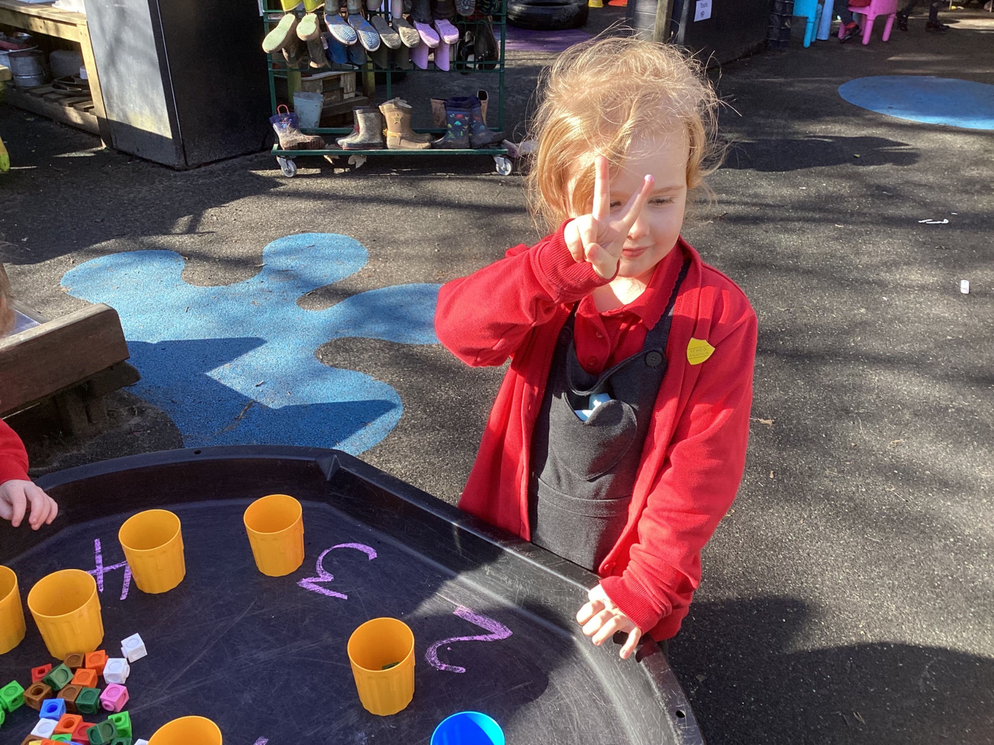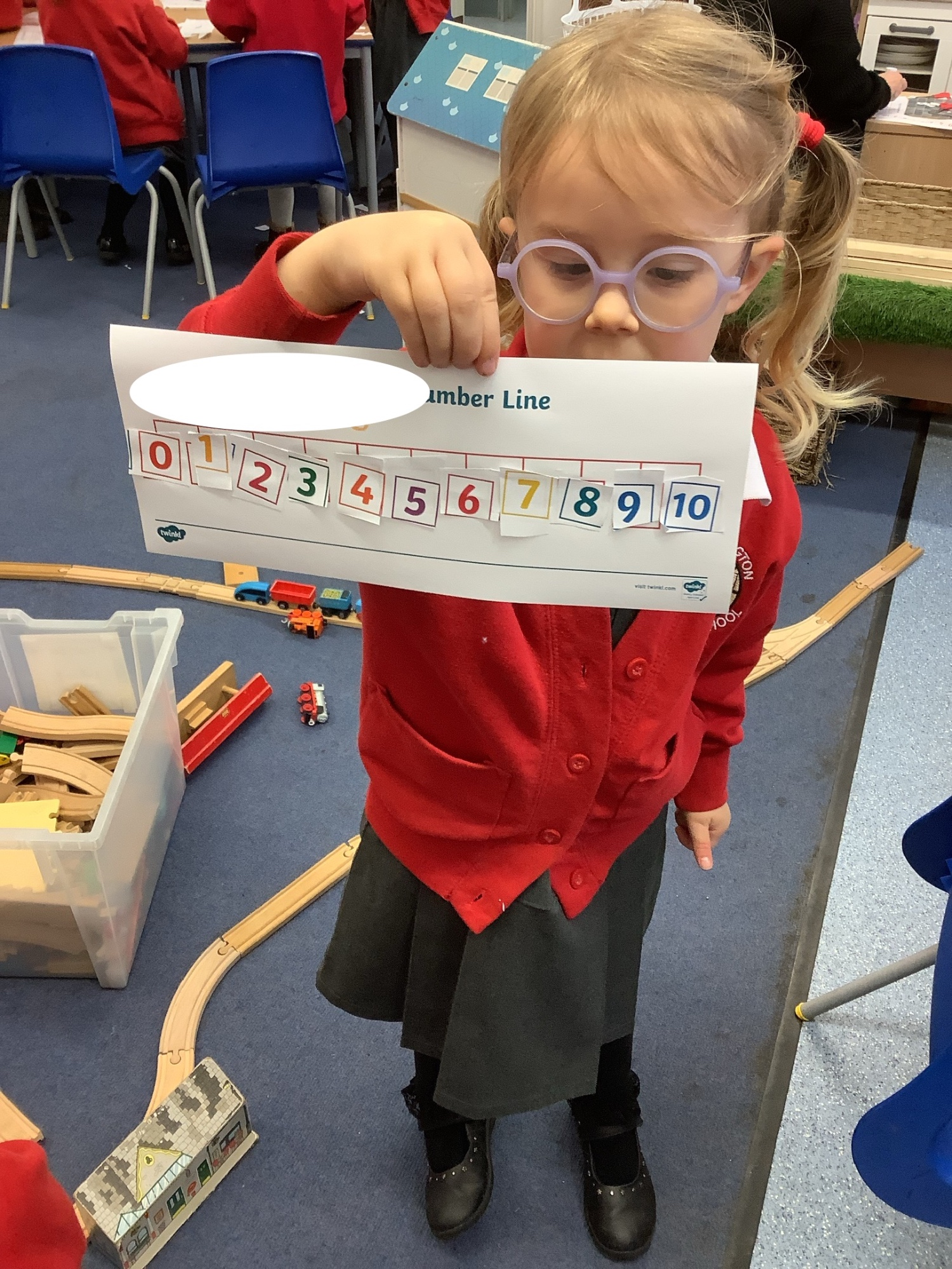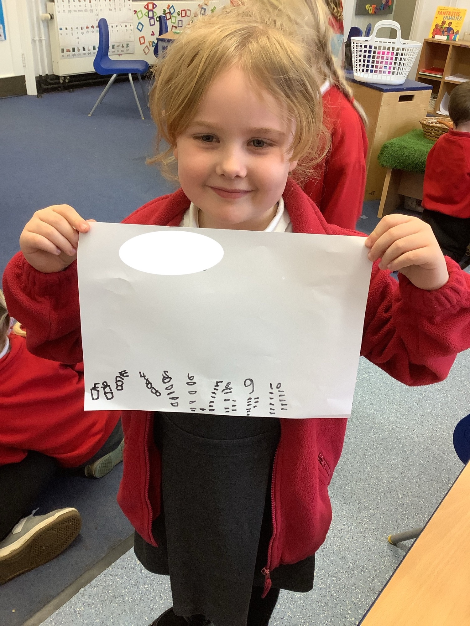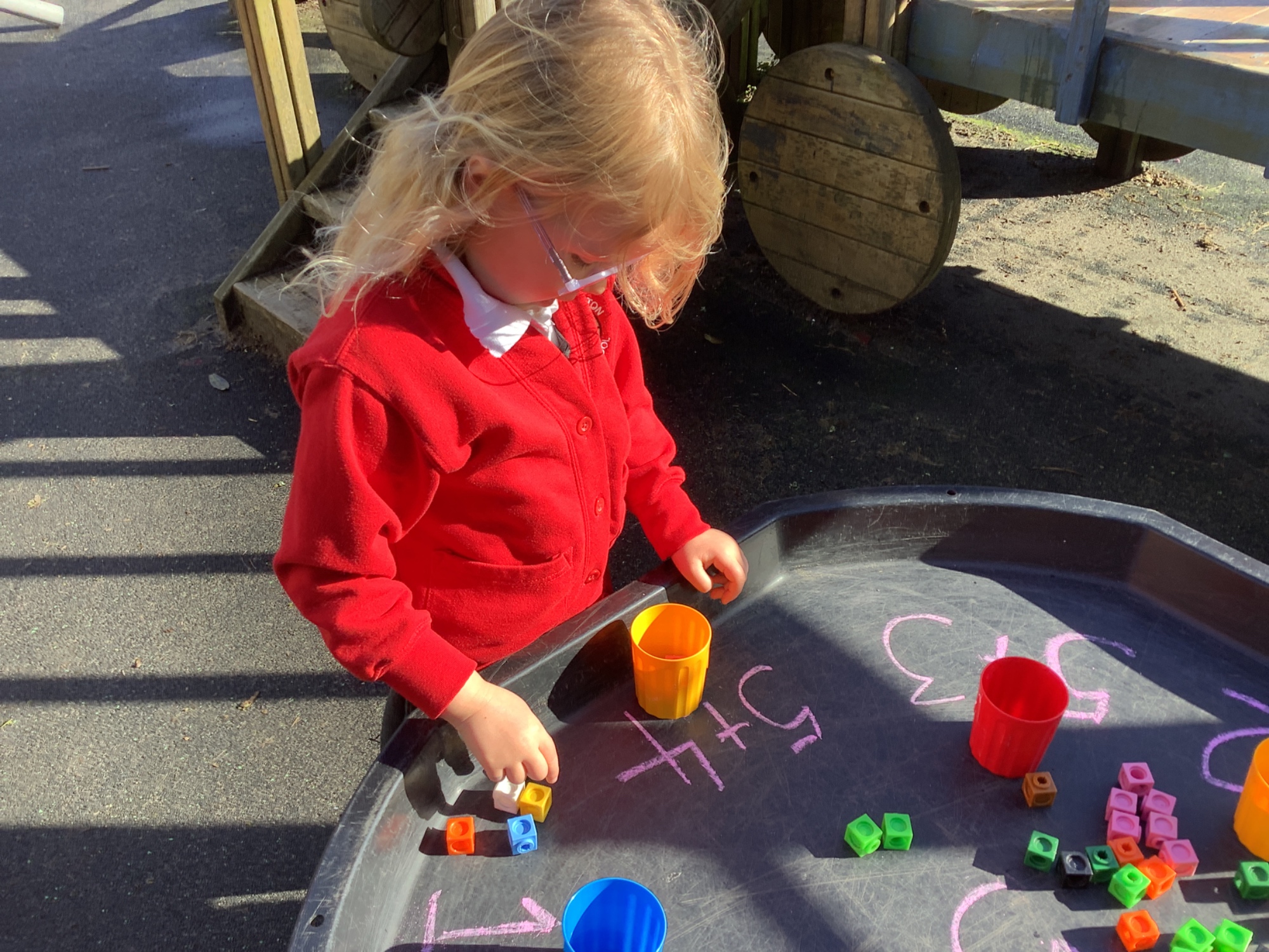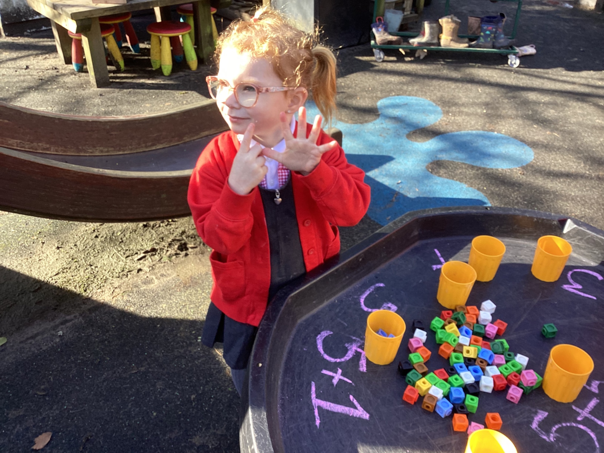 In maths we worked on ordering numbers. We ordered towers and placed them on number lines. We also used our knowledge of '5 and a bit' to put the correct number of cubes into cups in Discovery Time.
