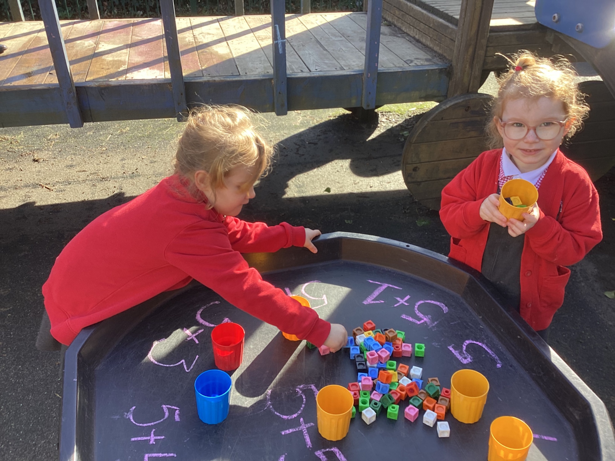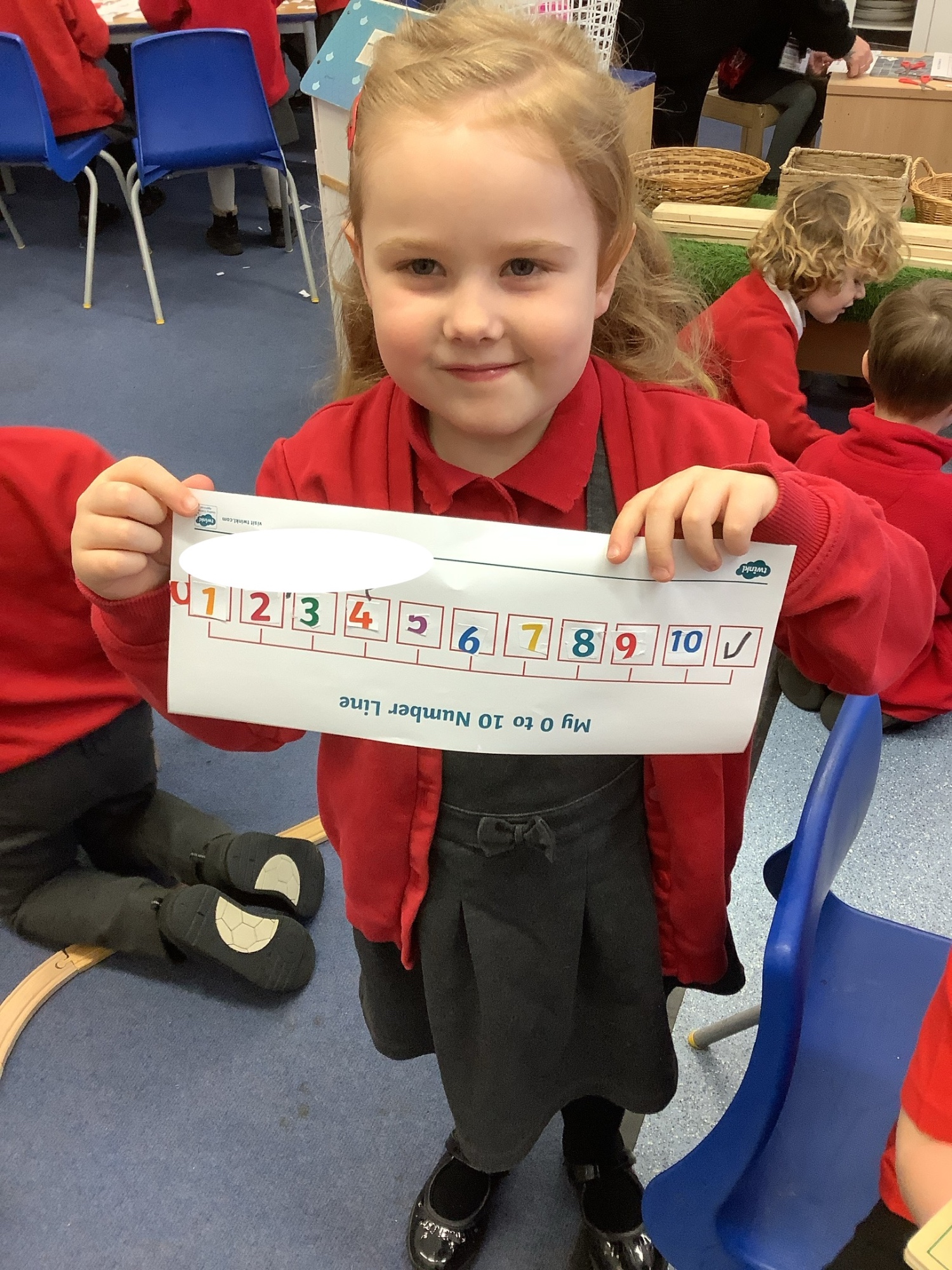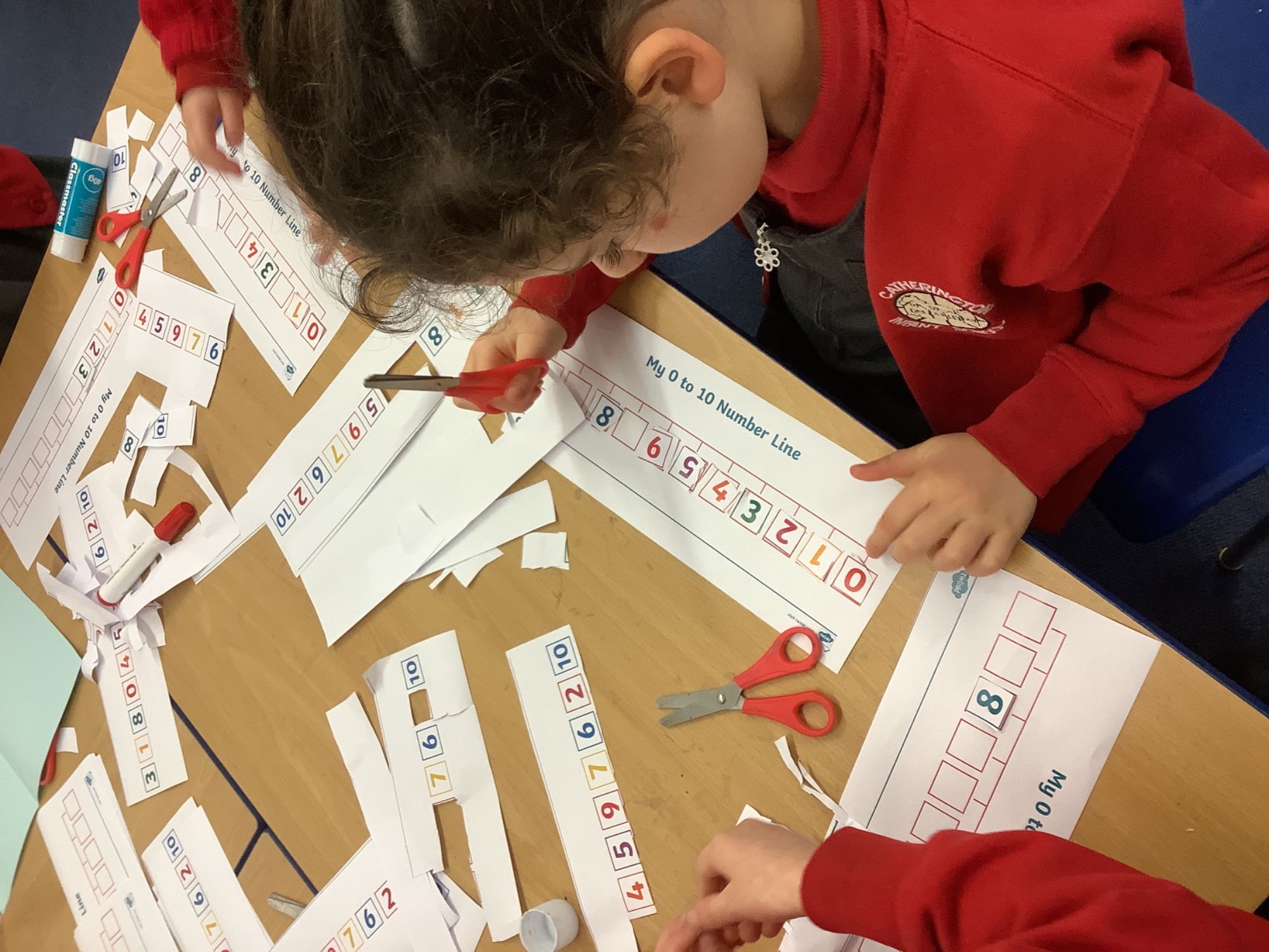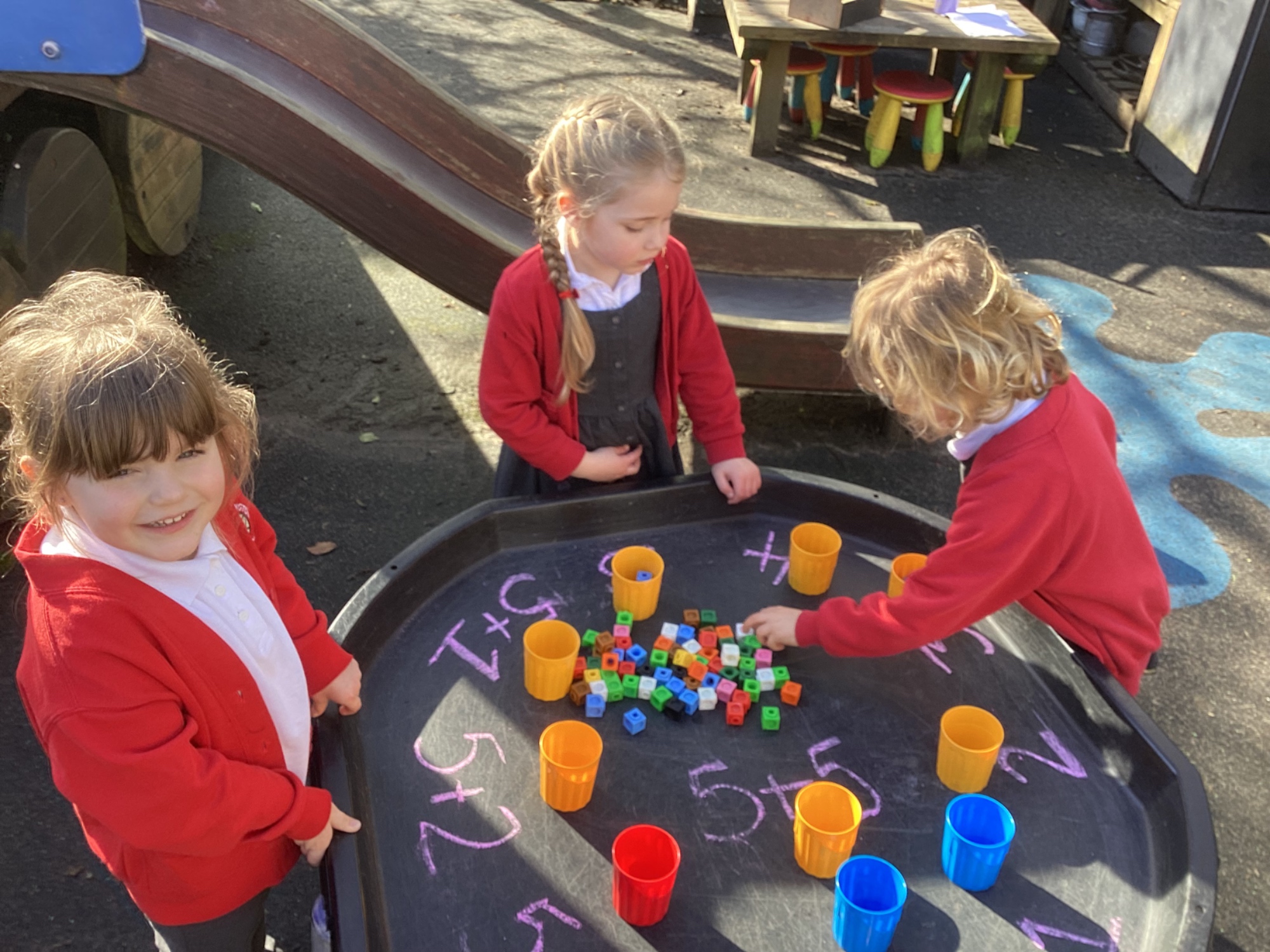 In maths we worked on ordering numbers. We ordered towers and placed them on number lines. We also used our knowledge of '5 and a bit' to put the correct number of cubes into cups in Discovery Time.