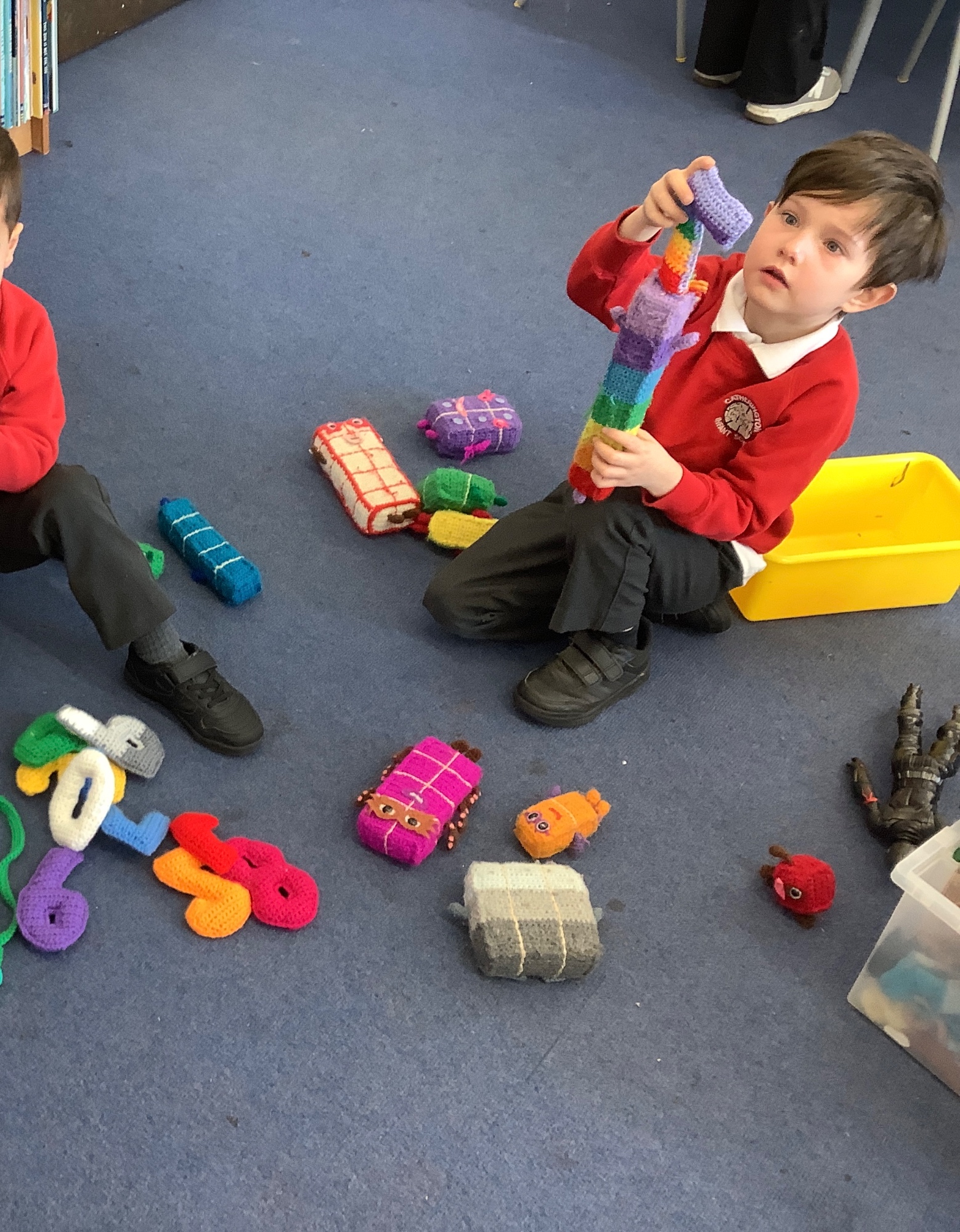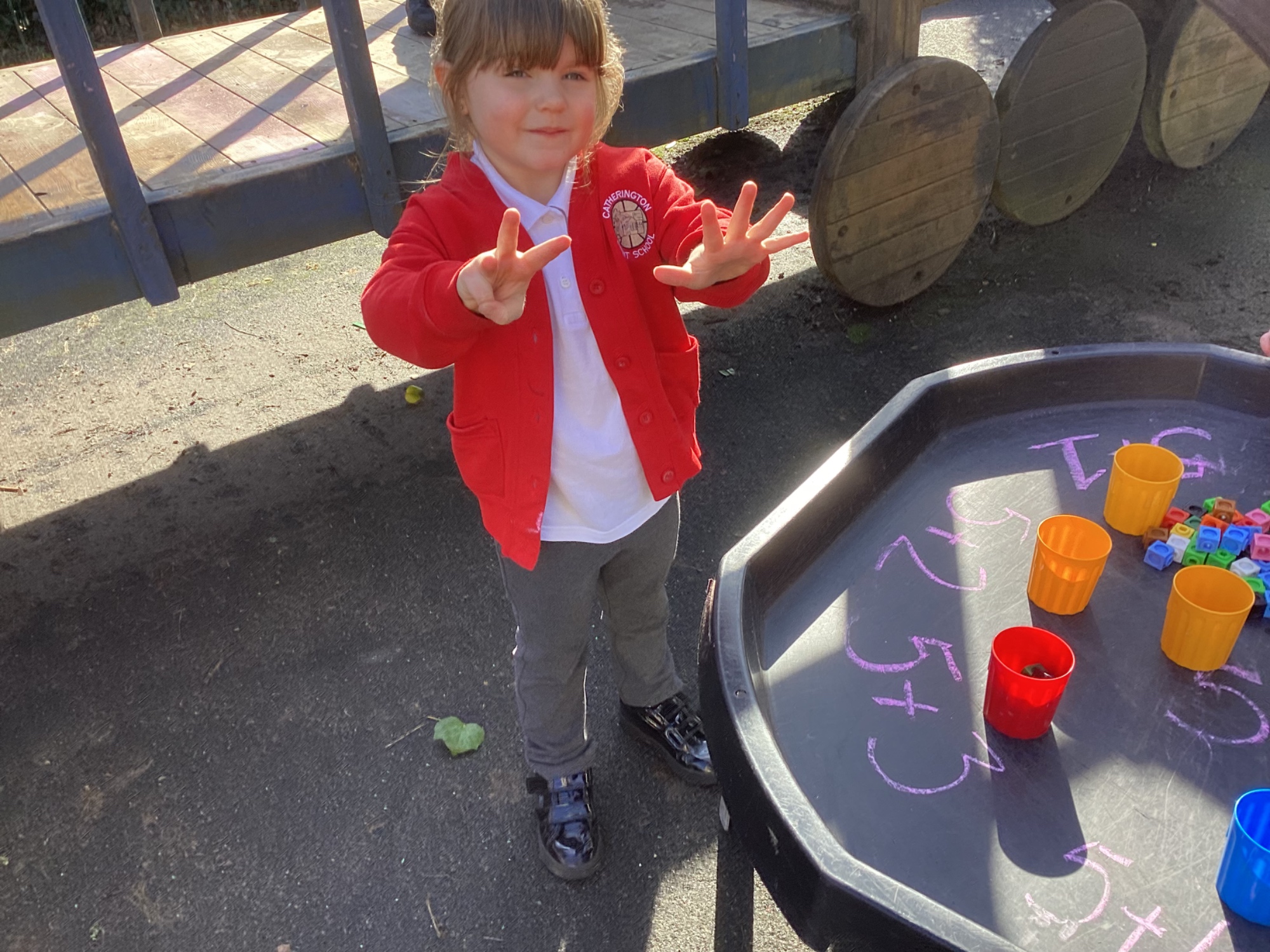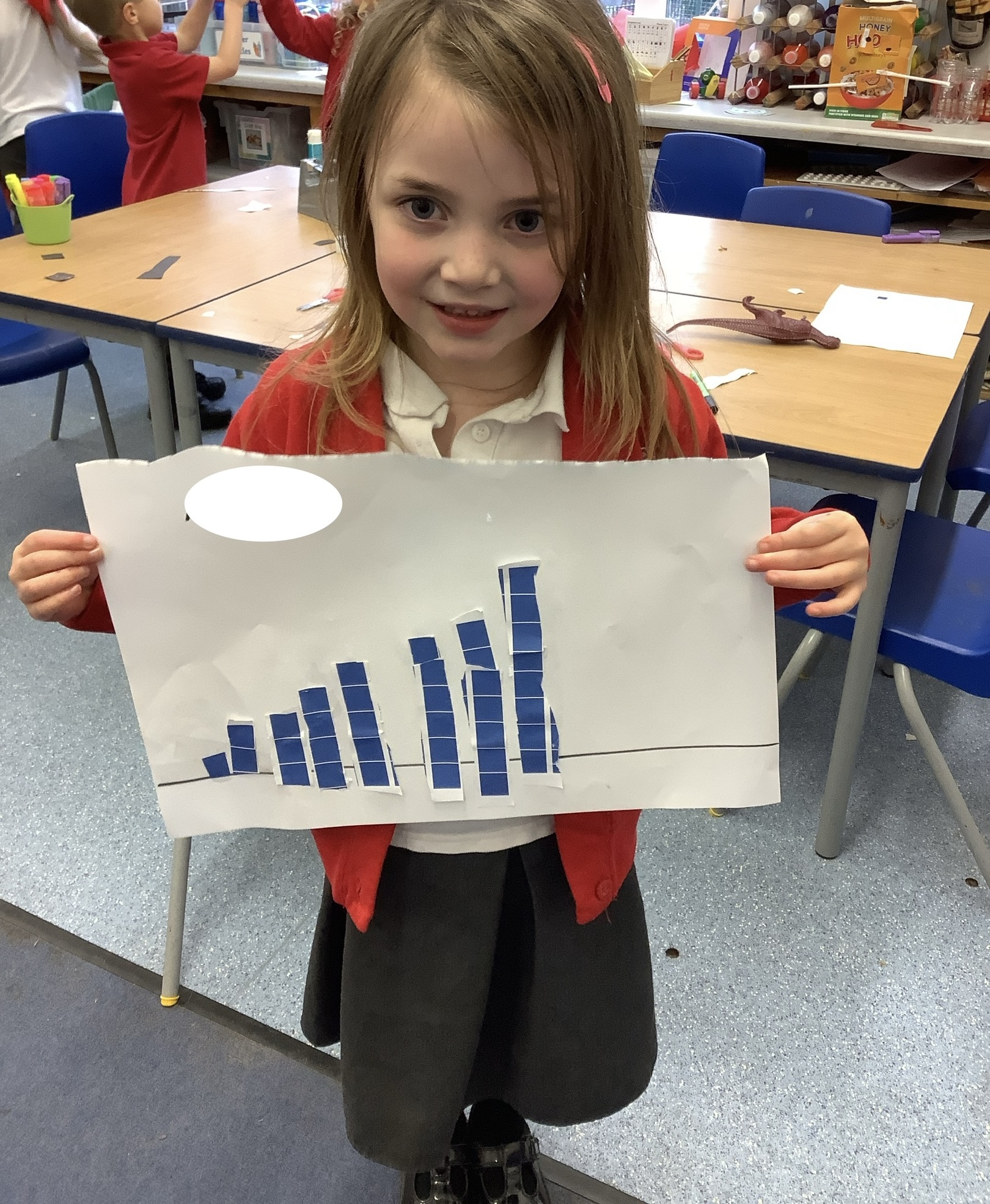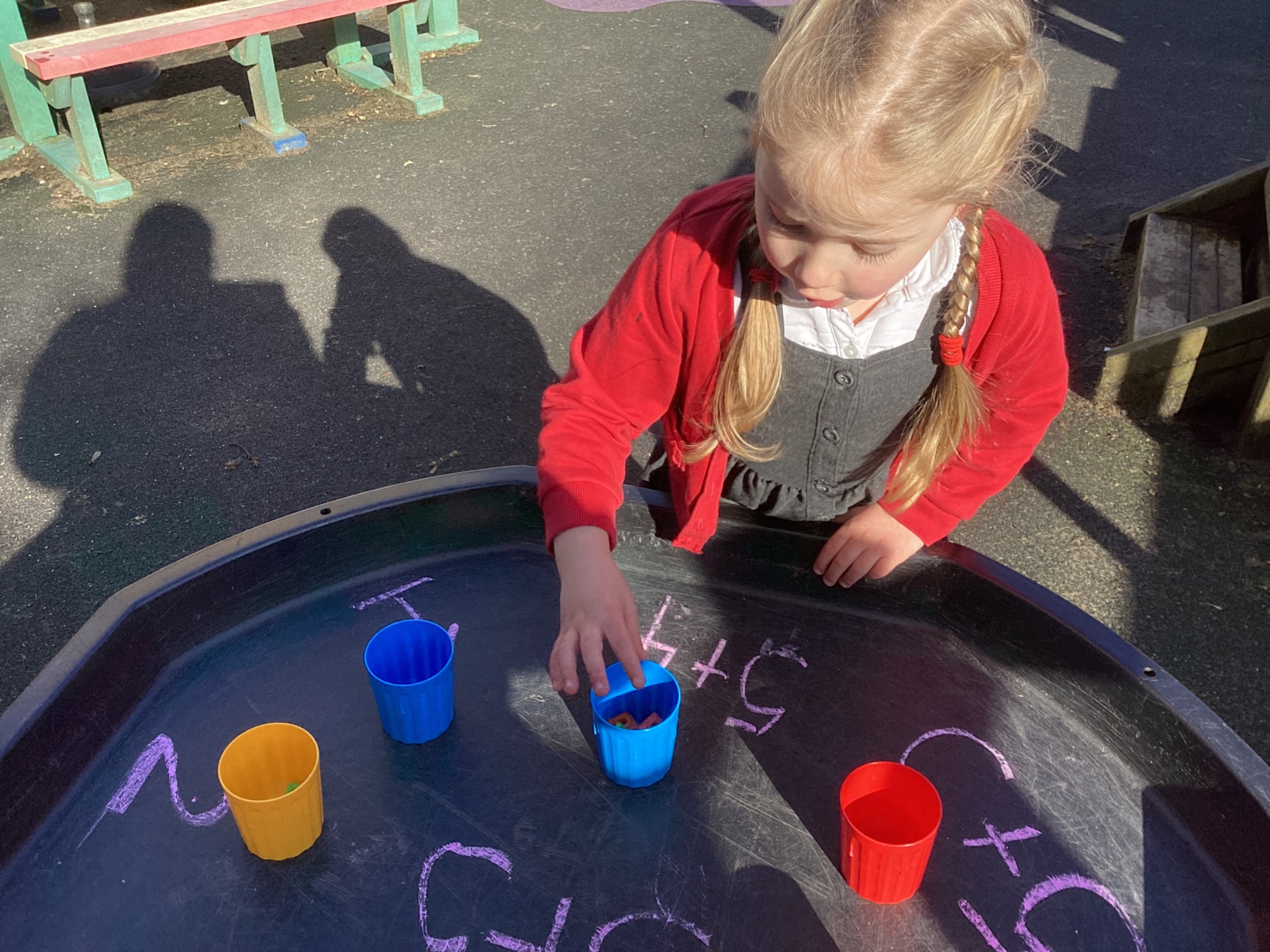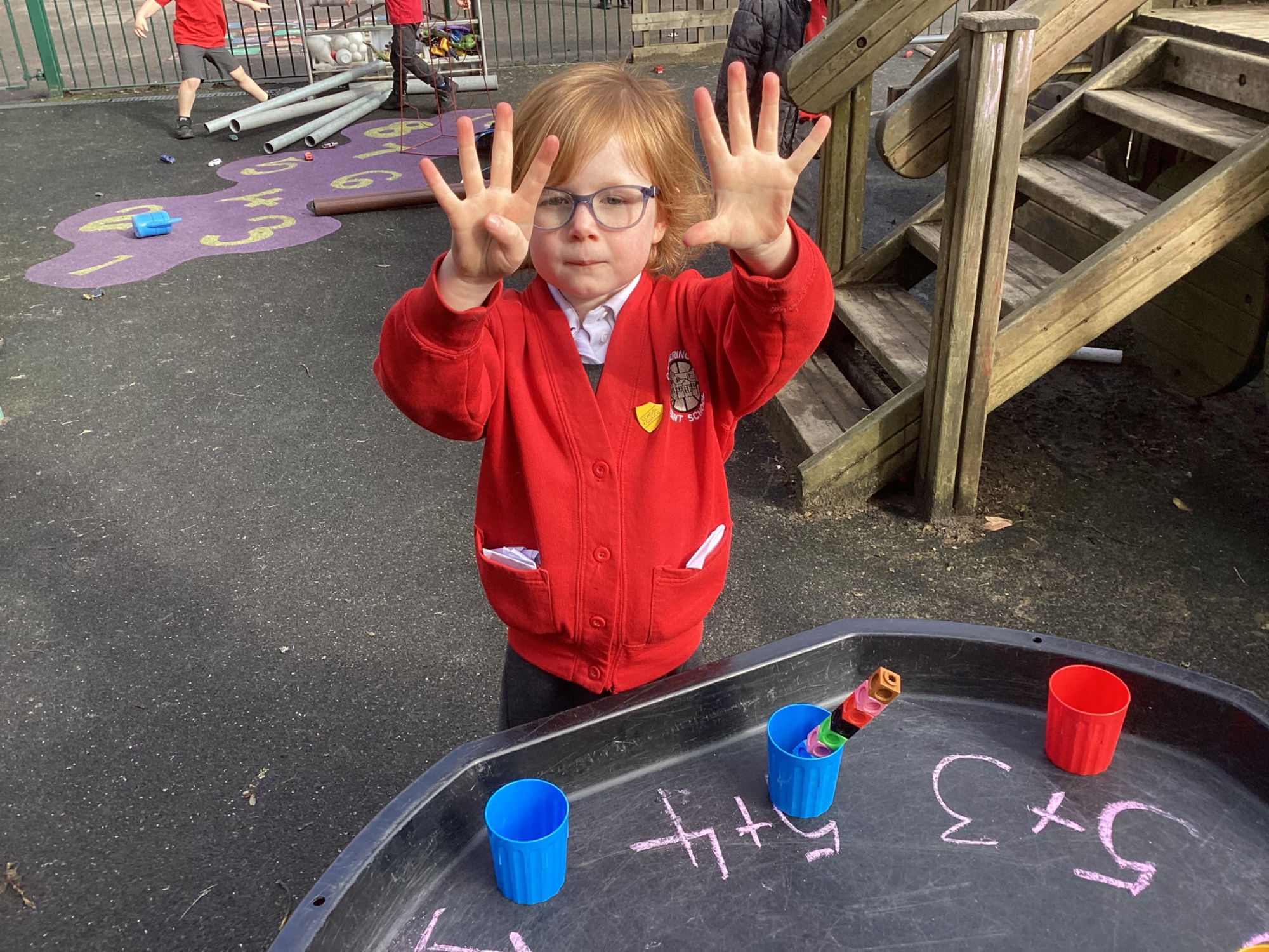 In maths we worked on ordering numbers. We ordered towers and placed them on number lines. We also used our knowledge of '5 and a bit' to put the correct number of cubes into cups in Discovery Time.