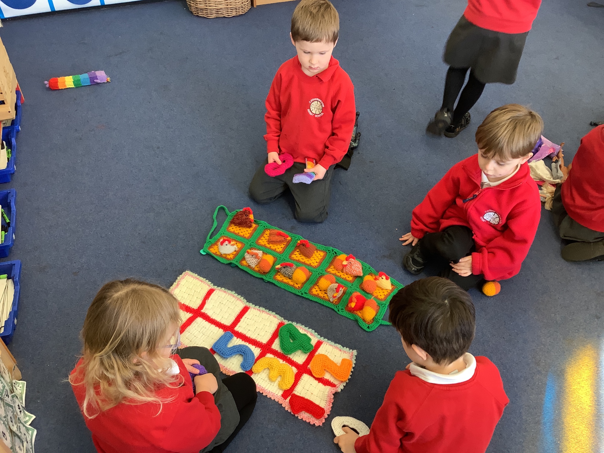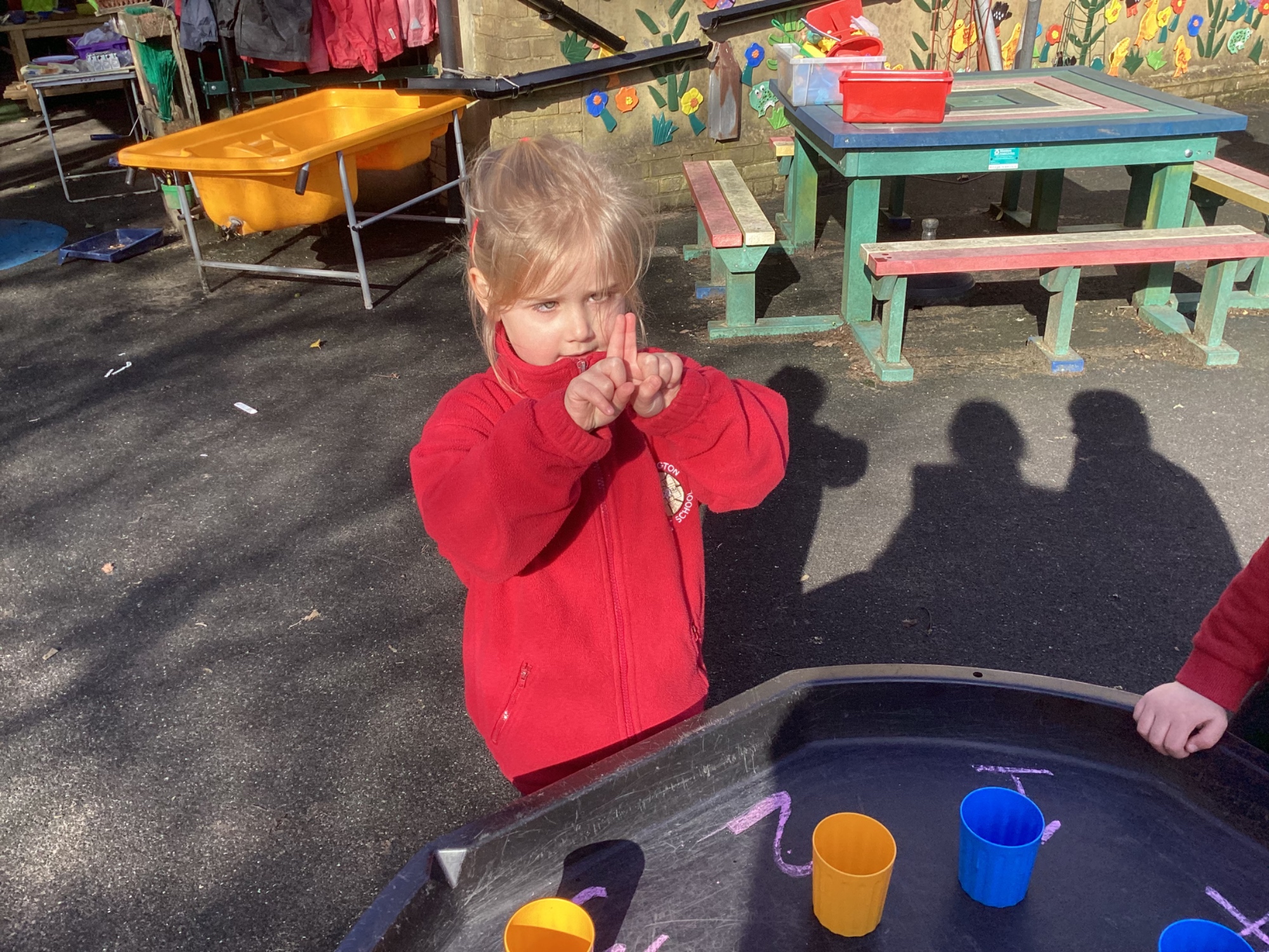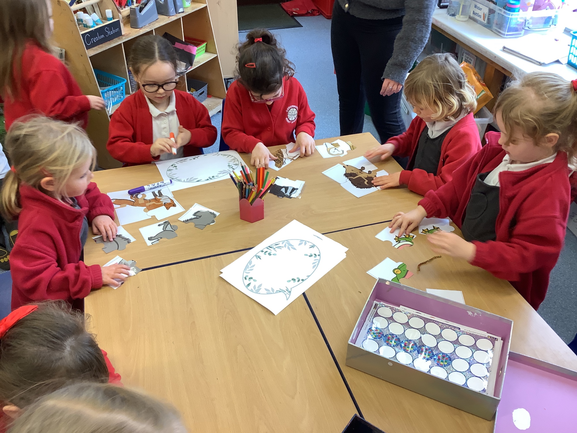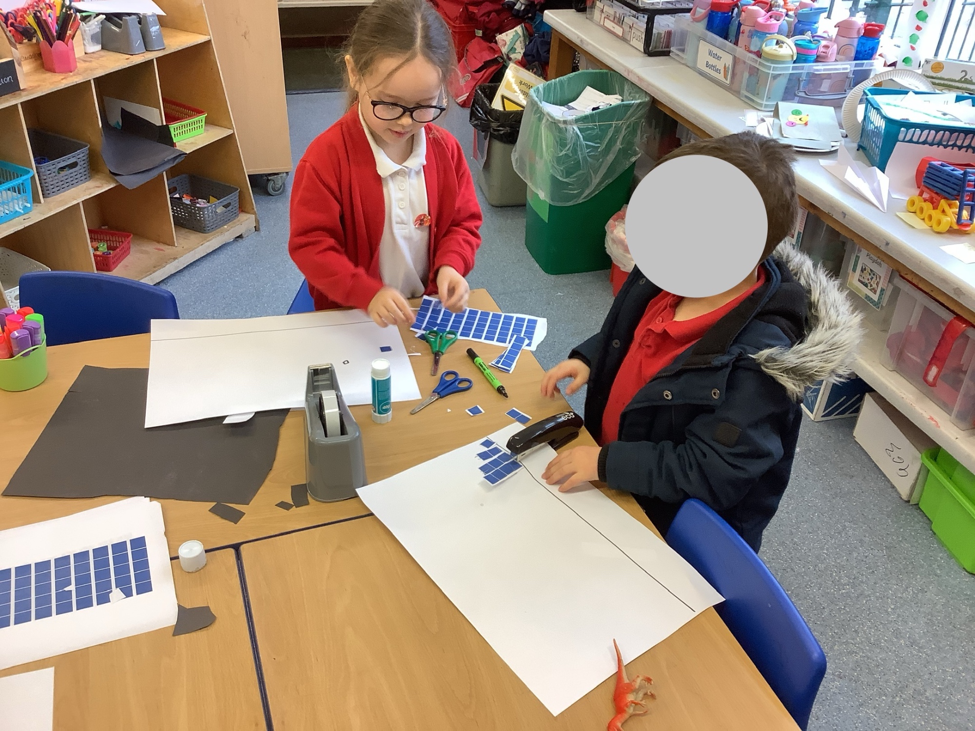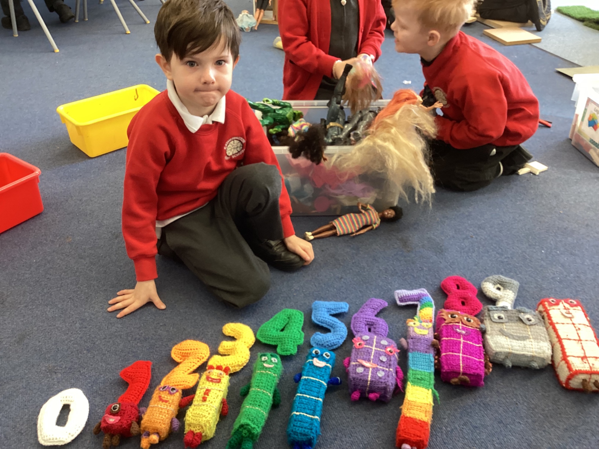 In maths we worked on ordering numbers. We ordered towers and placed them on number lines. We also used our knowledge of '5 and a bit' to put the correct number of cubes into cups in Discovery Time.