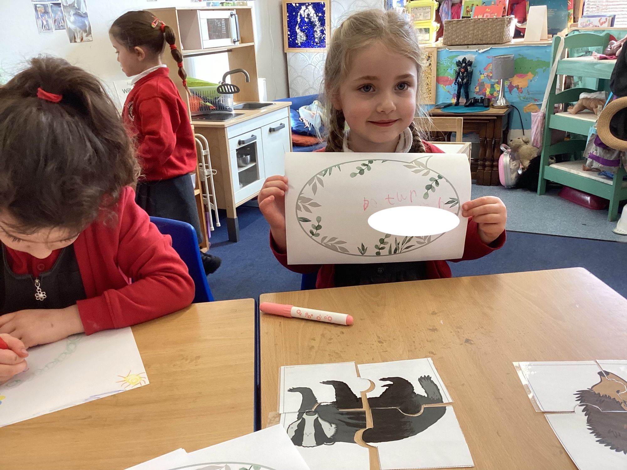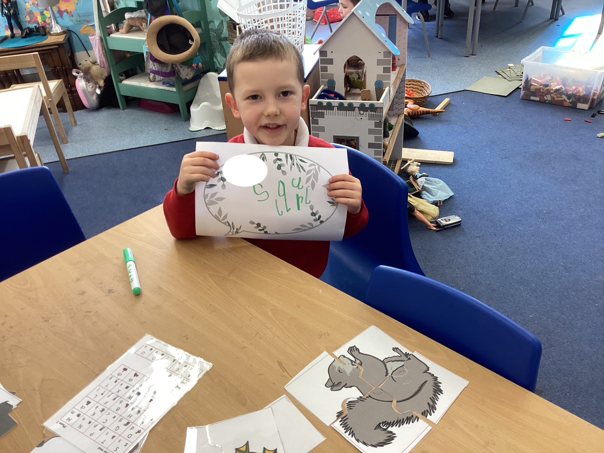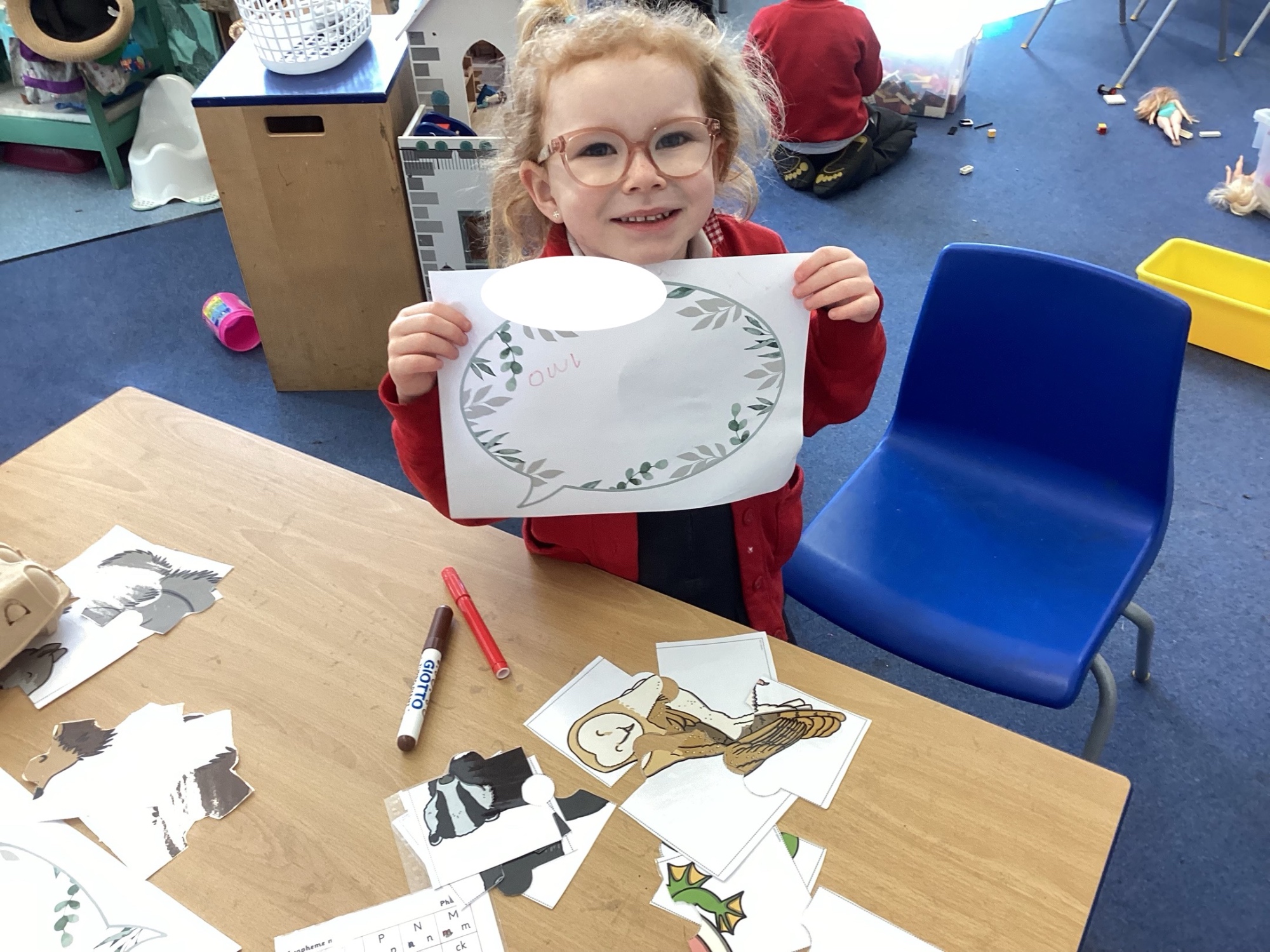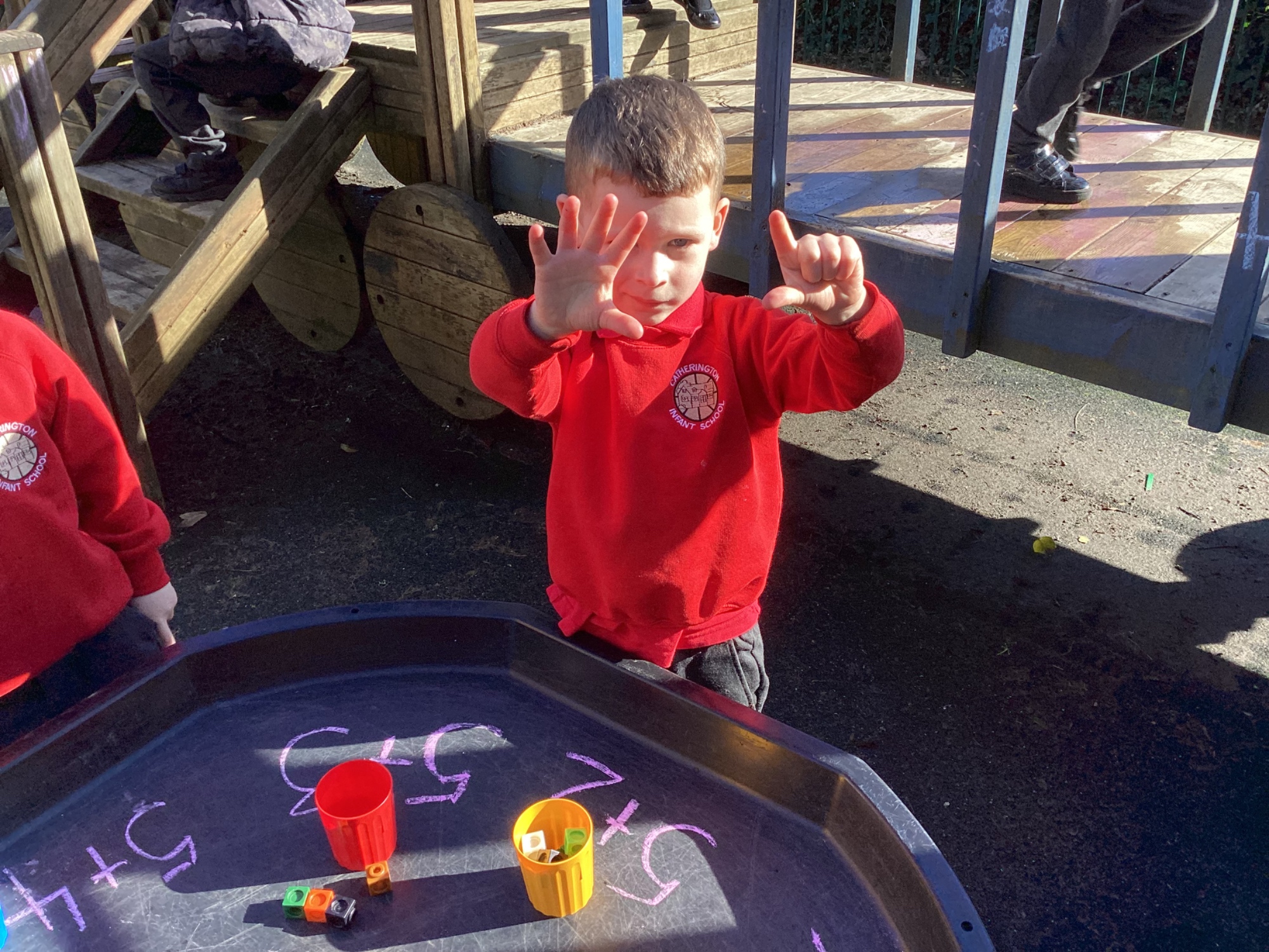 In Discovery Time we solved puzzles to find woodland animals and then wrote about the creature we found, made and sold pancakes in a Pancake Cafe, built dens, made car ramps, wrote with chalk, designed and made things with junk modelling materials and played with numbers (a lot!).