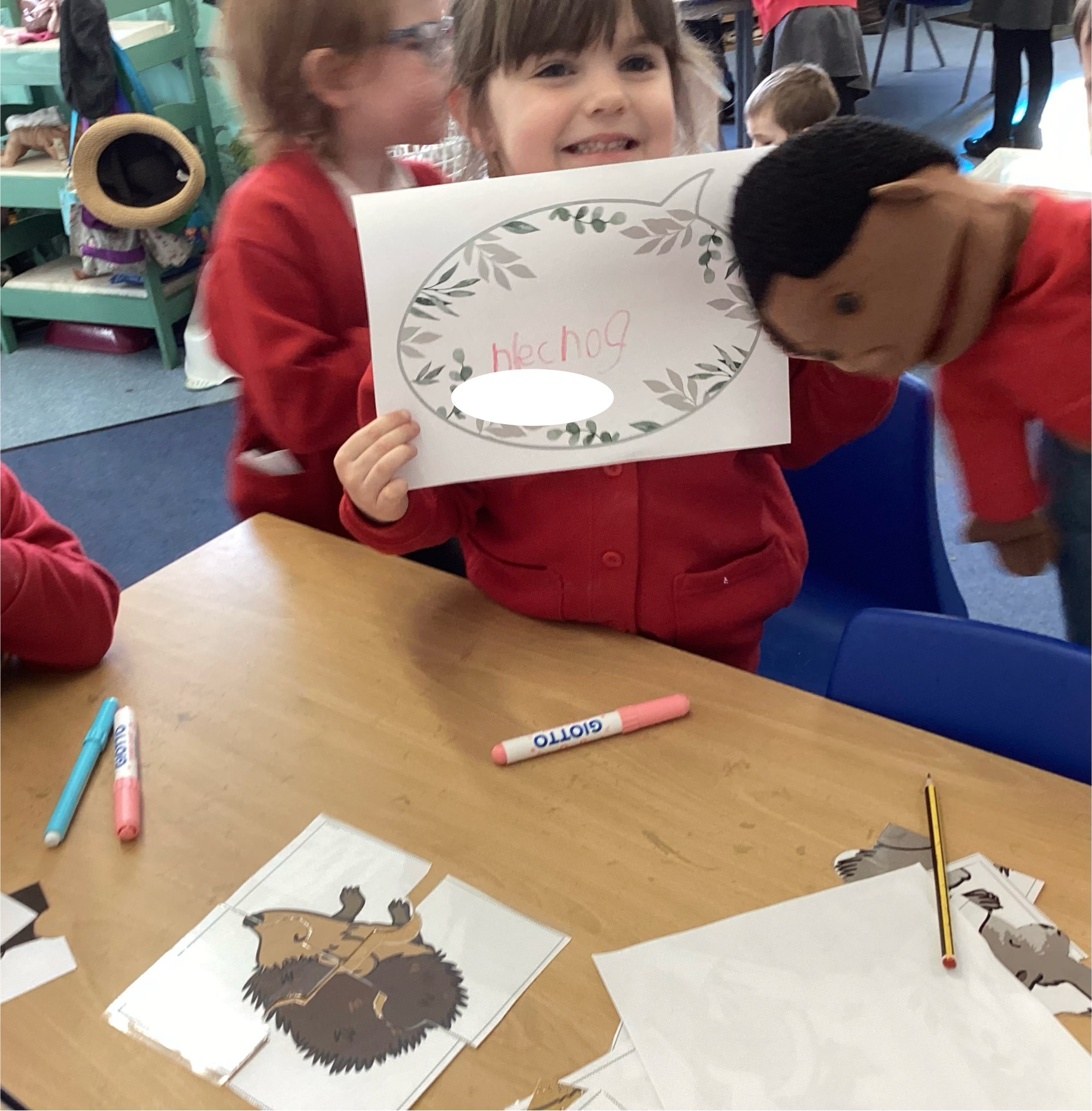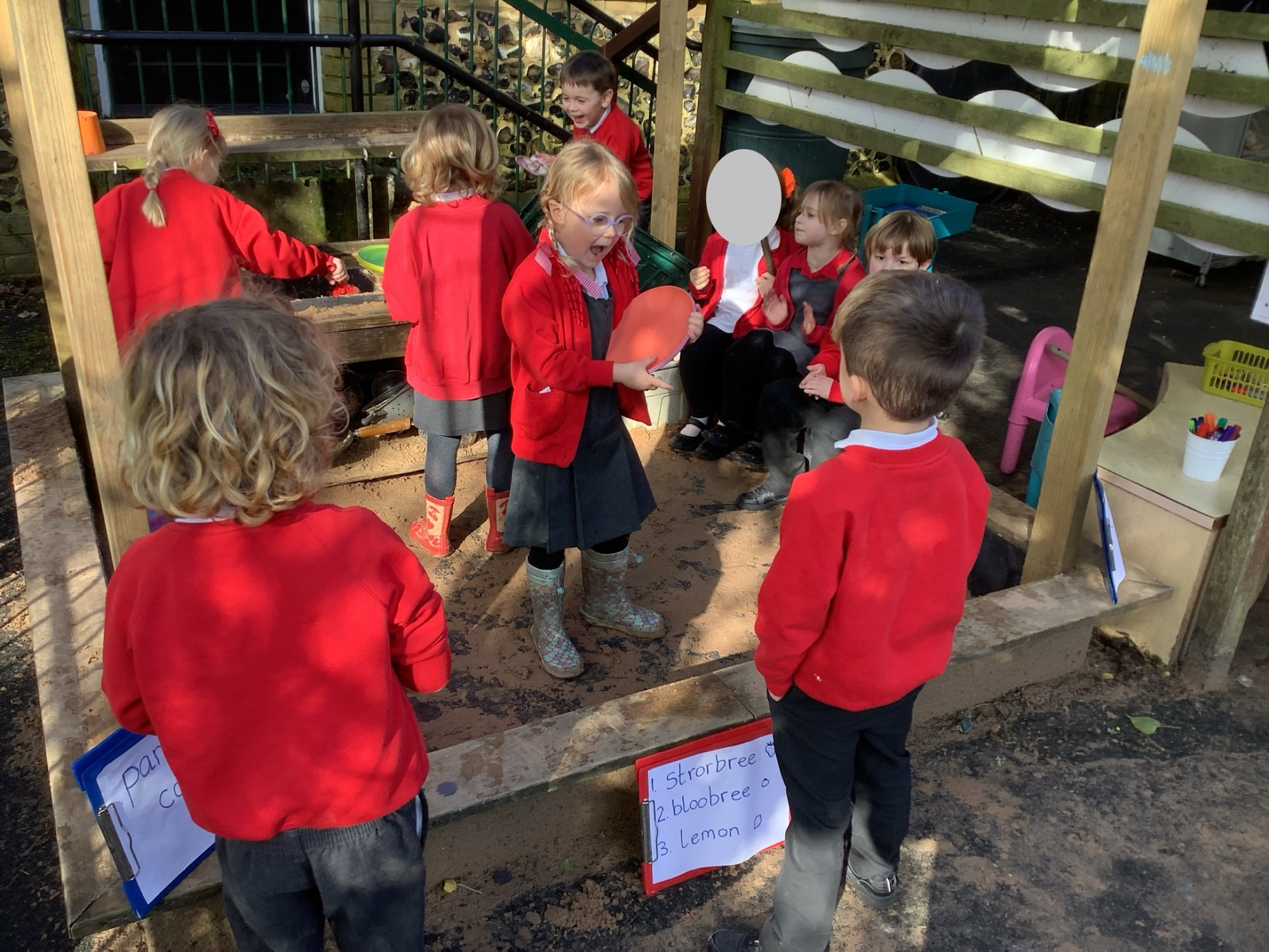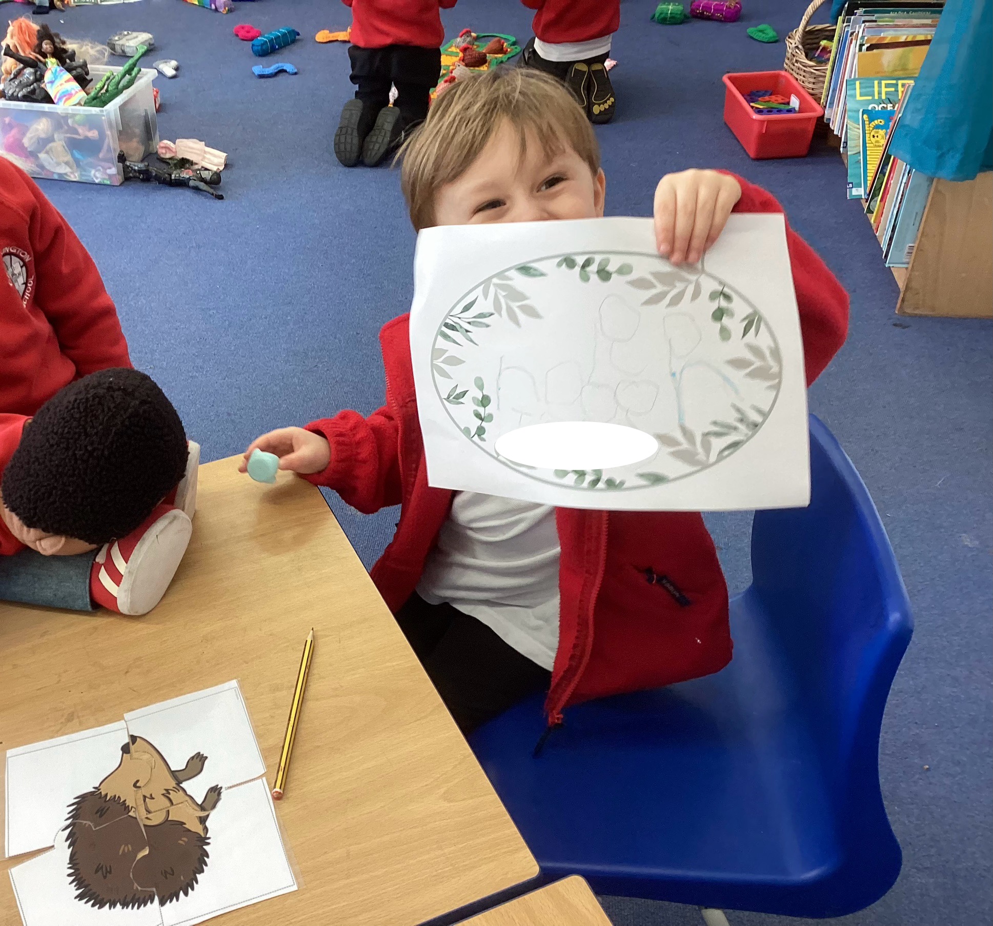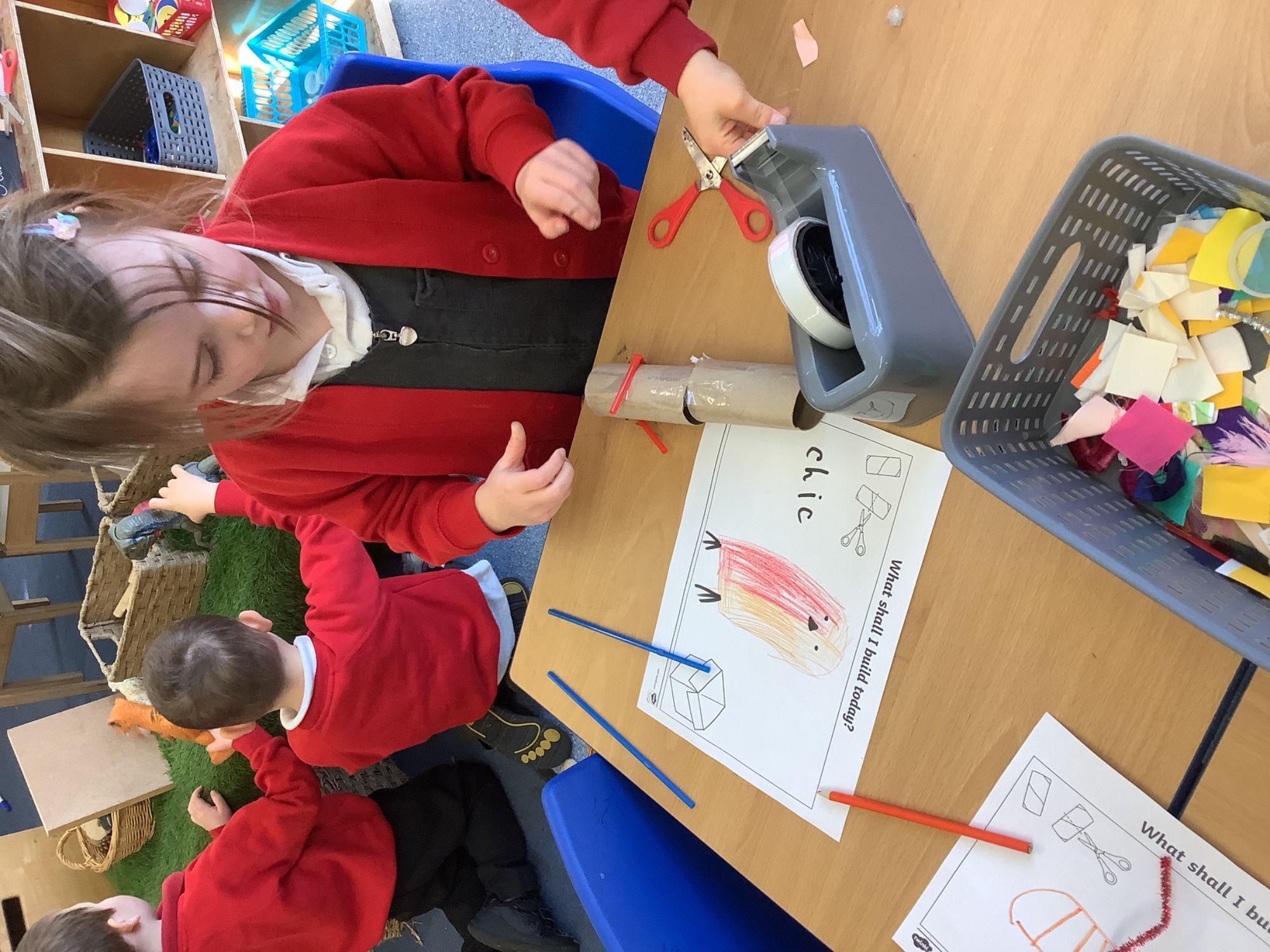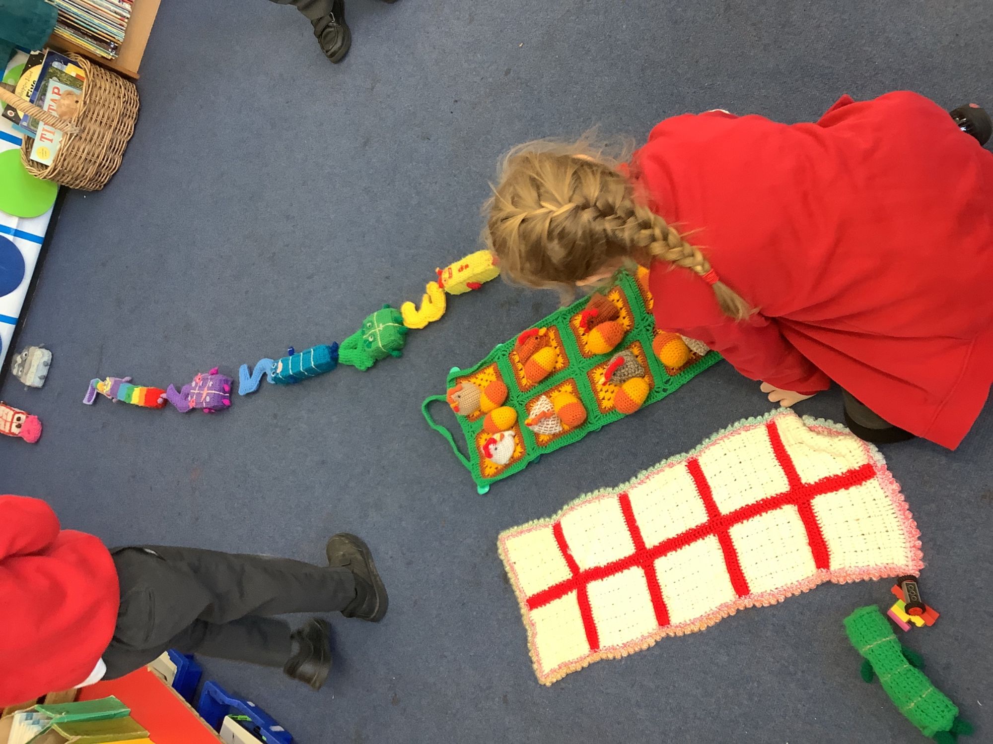 In Discovery Time we solved puzzles to find woodland animals and then wrote about the creature we found, made and sold pancakes in a Pancake Cafe, built dens, made car ramps, wrote with chalk, designed and made things with junk modelling materials and played with numbers (a lot!).