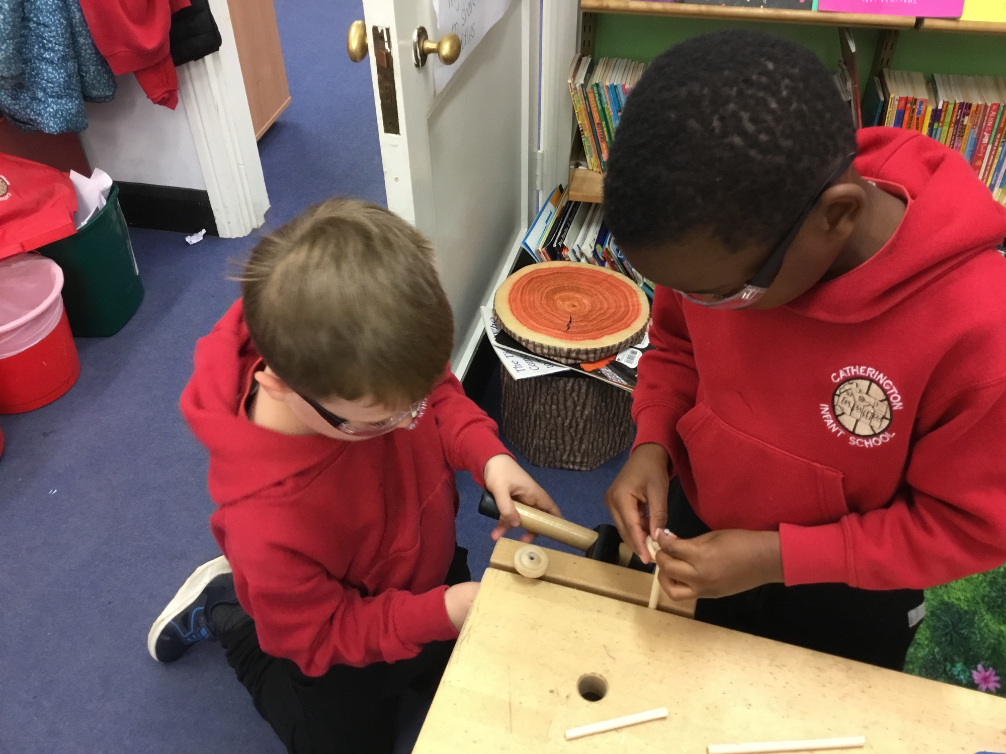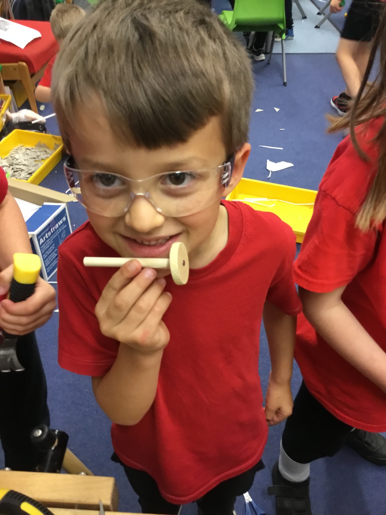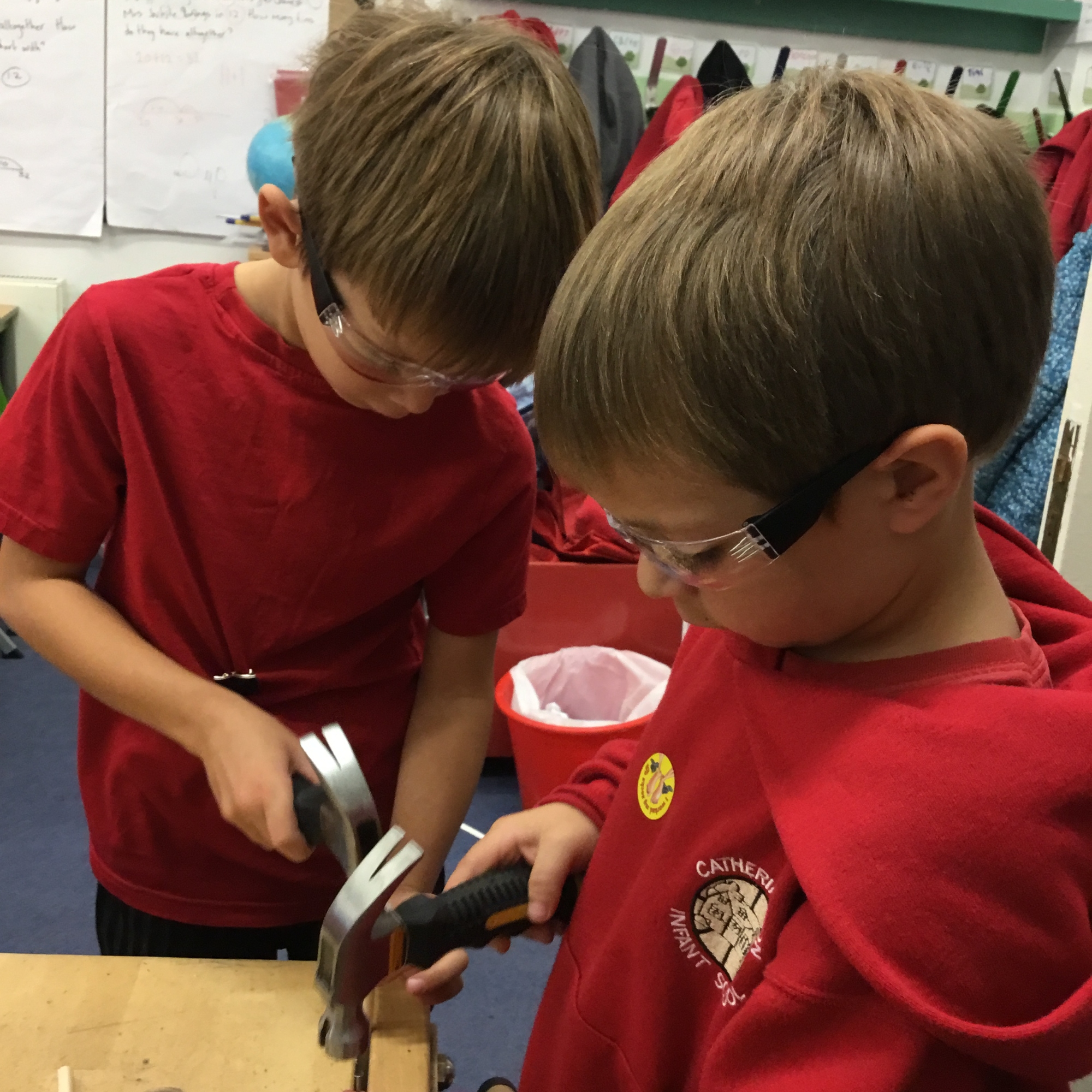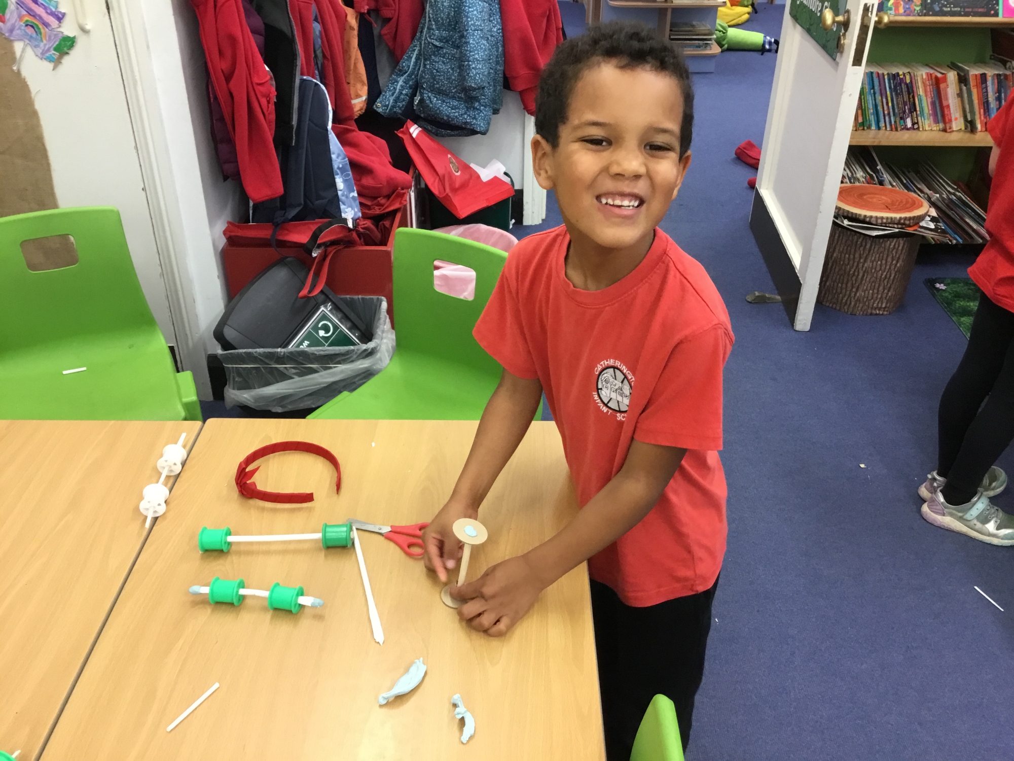 This week the children recapped their woodwork skills of how to use a vice to hold a piece of wood and then how to use a hammer and nails safely to help them make wheels and axles. We explored which materials and joining techniques we could use to make fixed and free moving wheels and axles. We experimented to see which was the best wheel type and axle to meet the criteria of transporting a pencil pot.