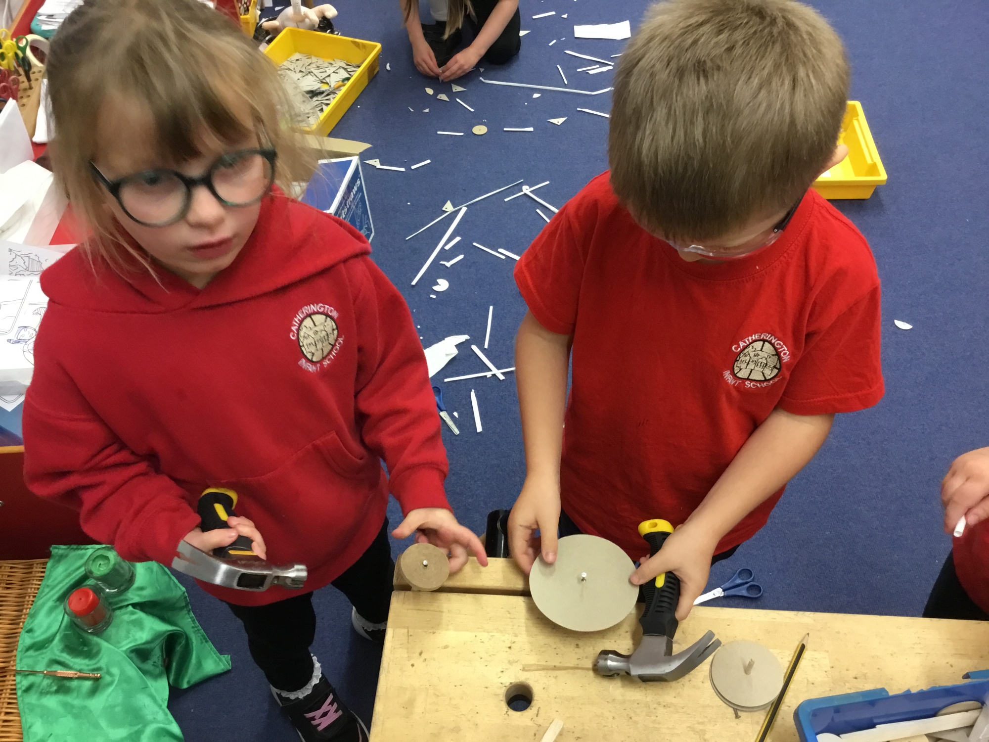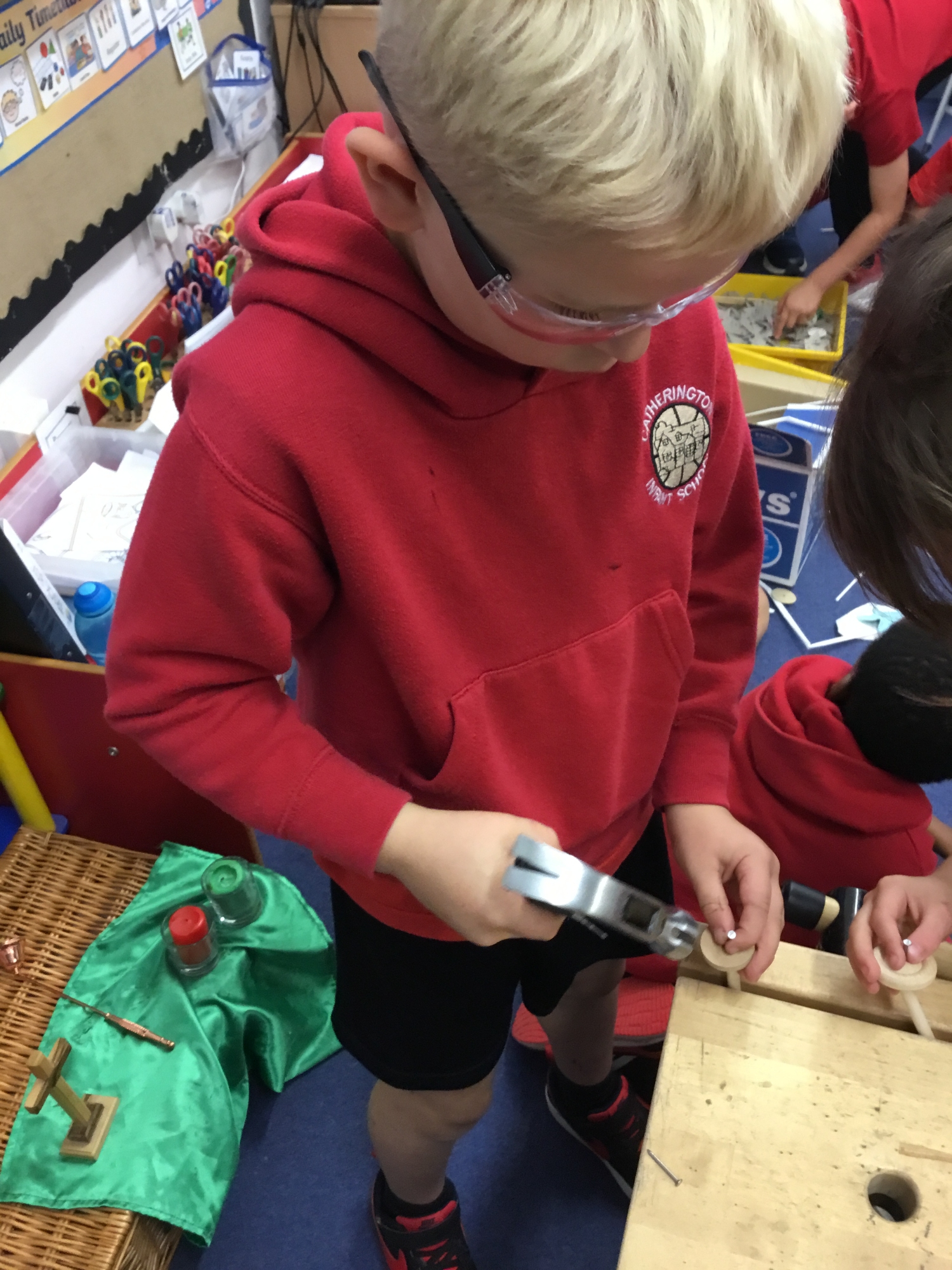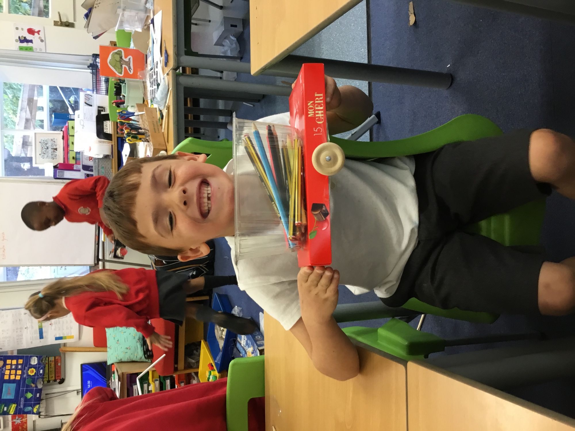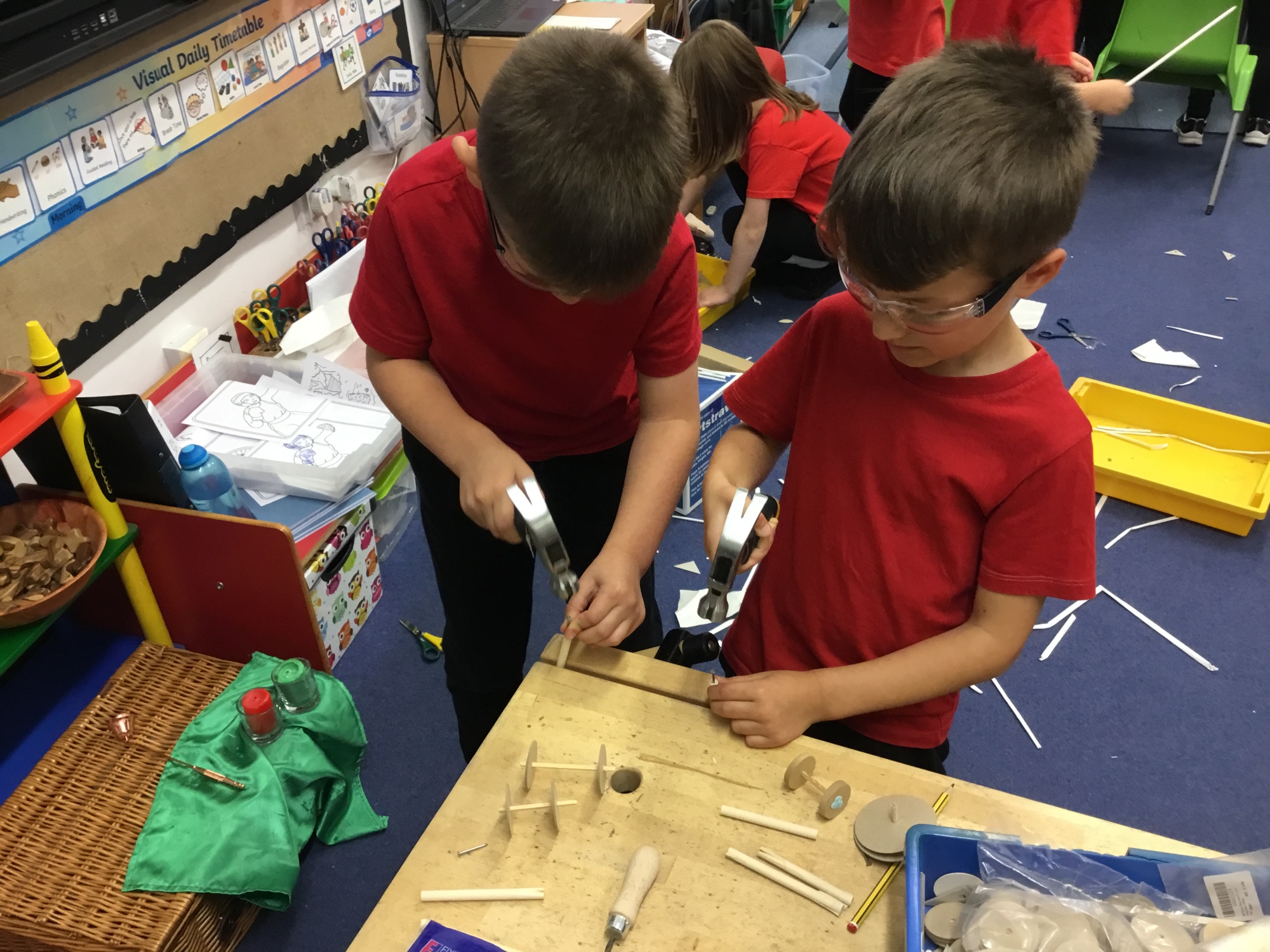 This week the children recapped their woodwork skills of how to use a vice to hold a piece of wood and then how to use a hammer and nails safely to help them make wheels and axles. We explored which materials and joining techniques we could use to make fixed and free moving wheels and axles. We experimented to see which was the best wheel type and axle to meet the criteria of transporting a pencil pot.