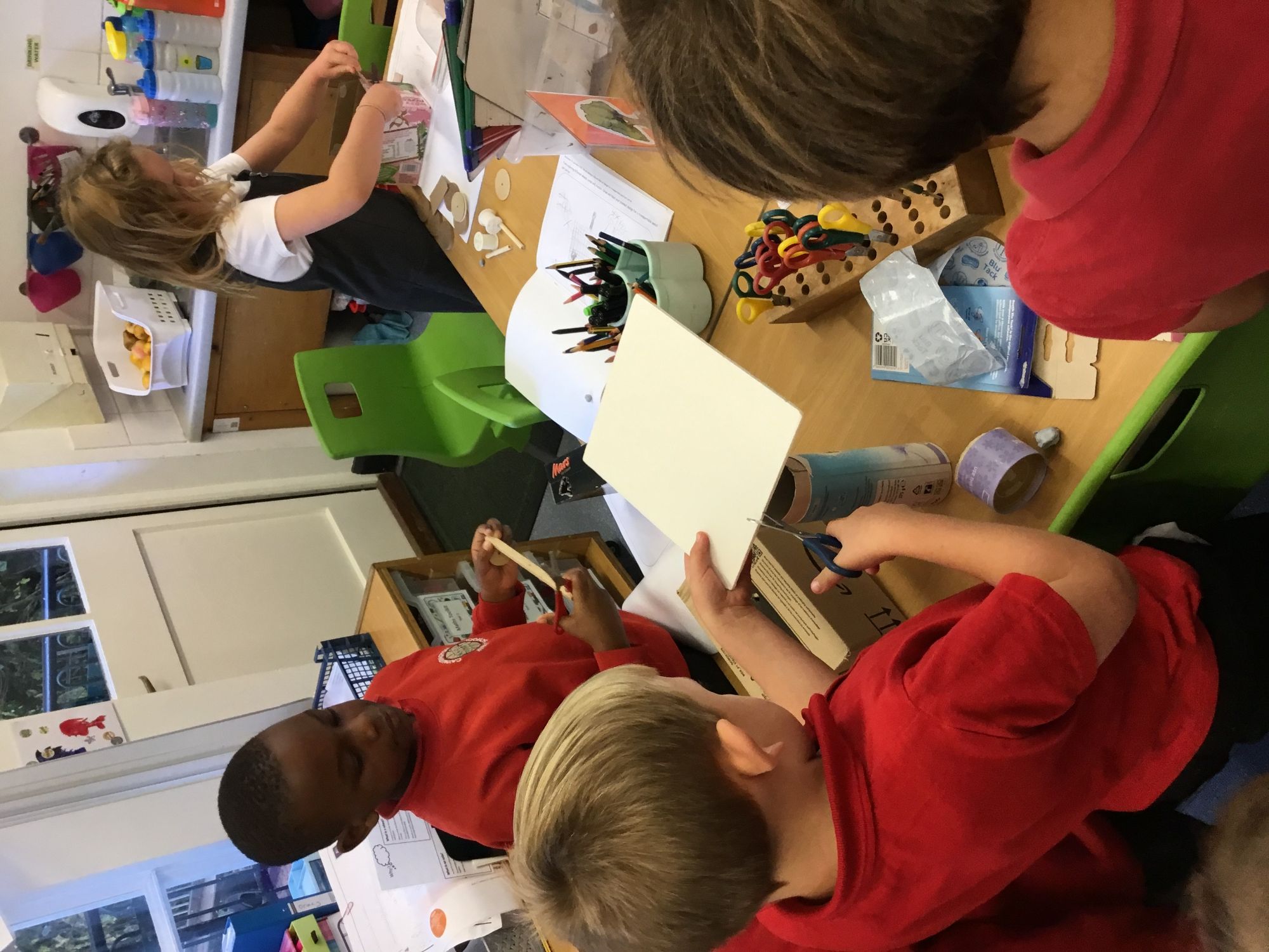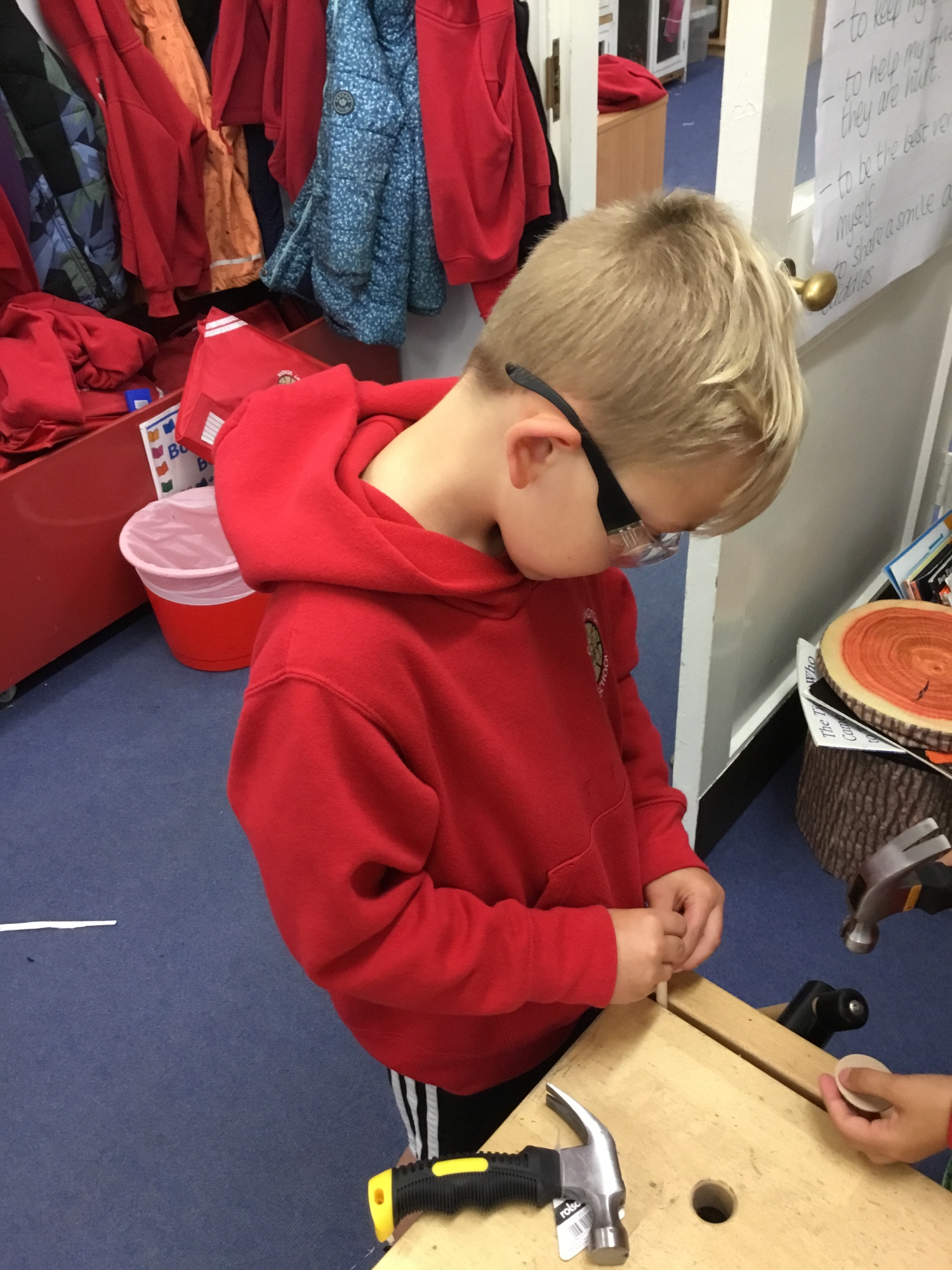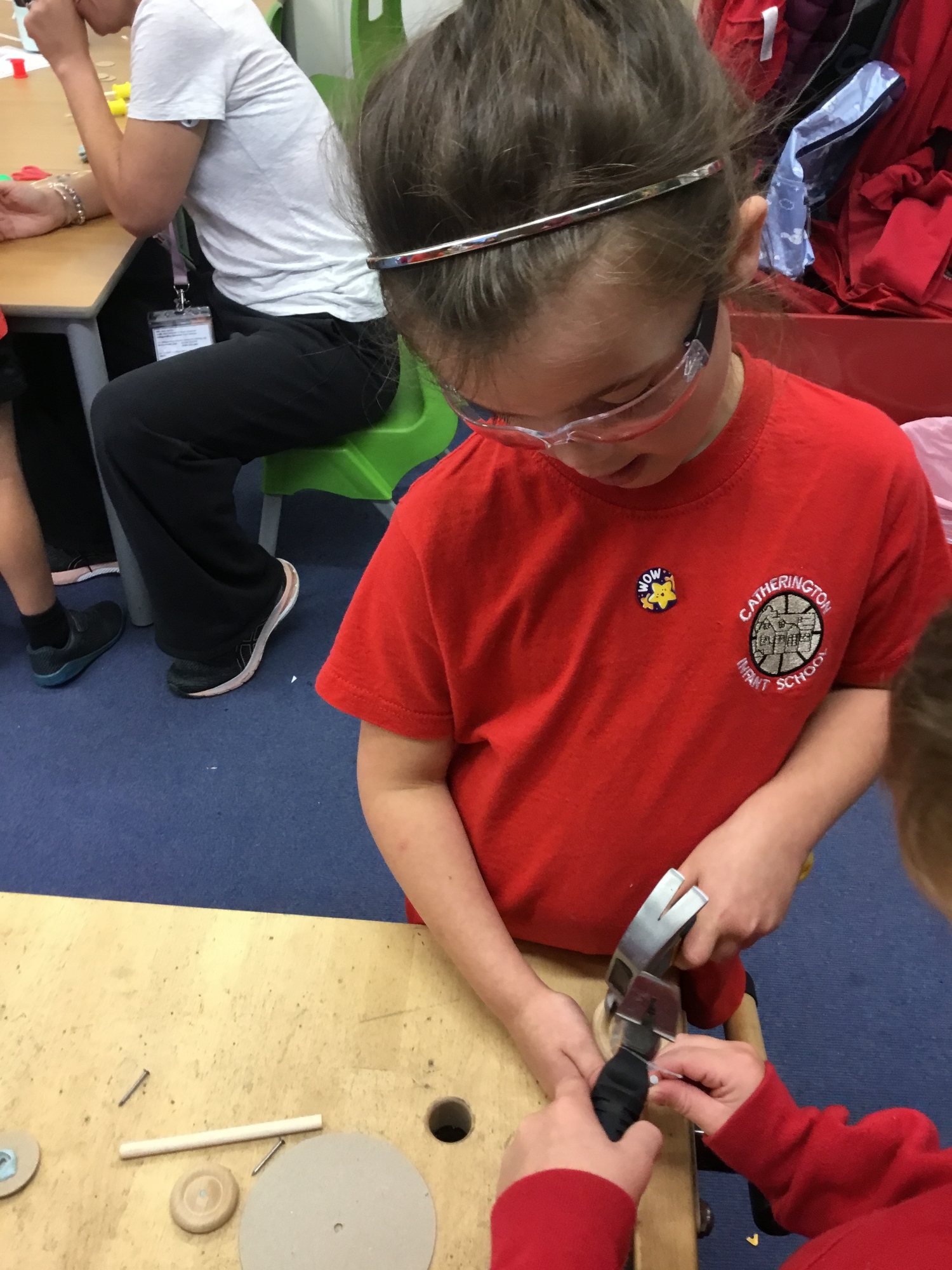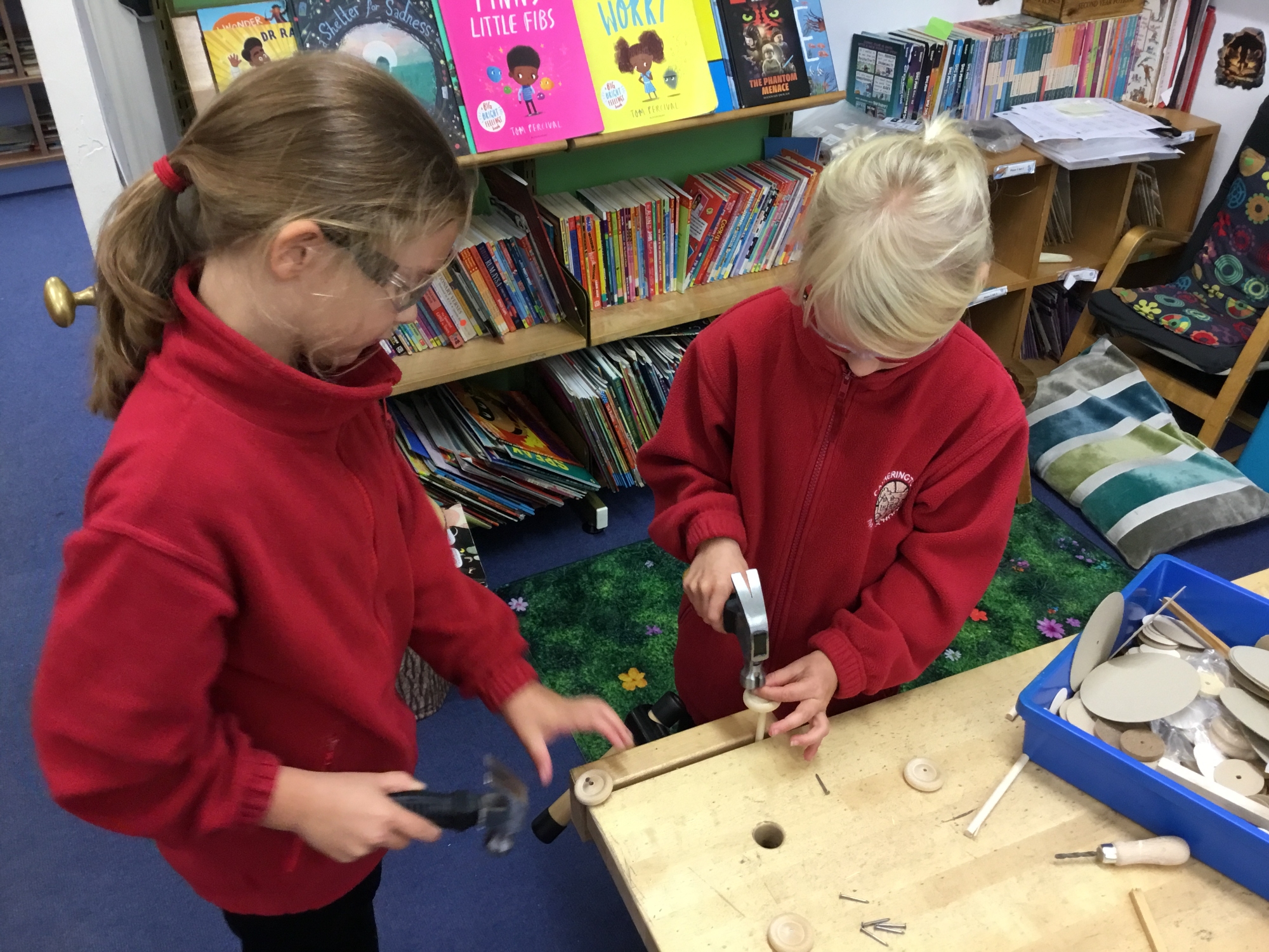This week the children recapped their woodwork skills of how to use a vice to hold a piece of wood and then how to use a hammer and nails safely to help them make wheels and axles. We explored which materials and joining techniques we could use to make fixed and free moving wheels and axles. We experimented to see which was the best wheel type and axle to meet the criteria of transporting a pencil pot.