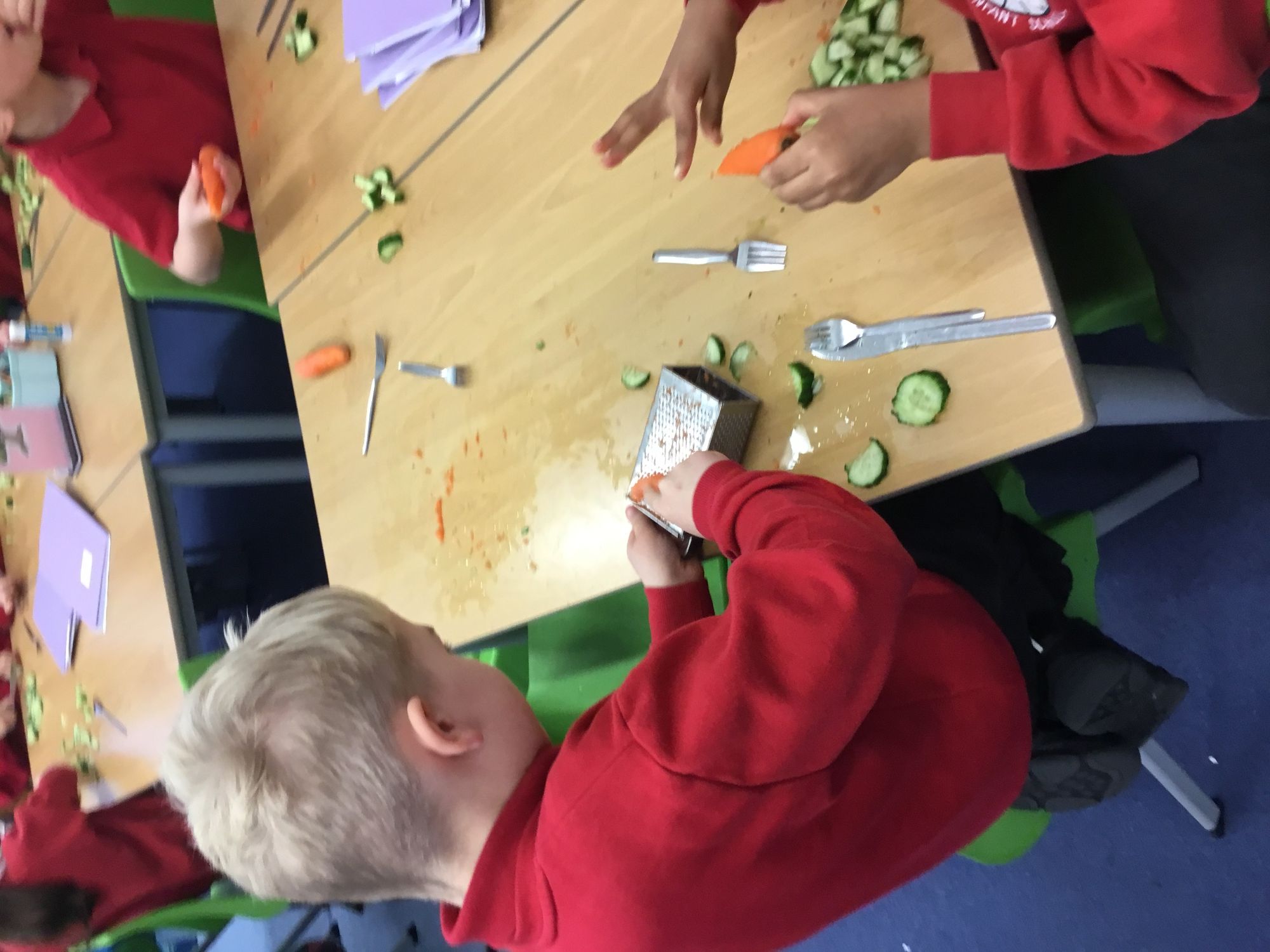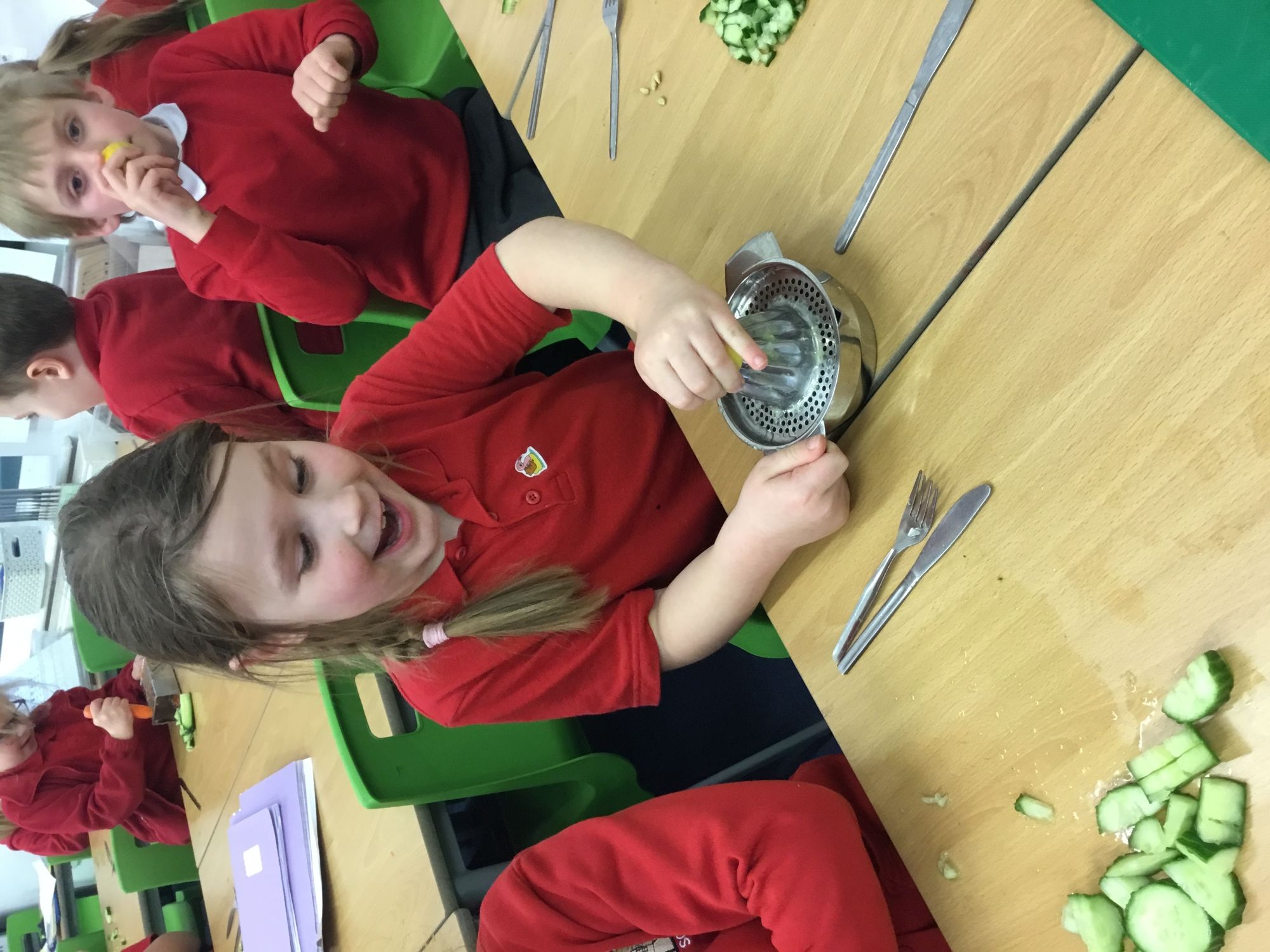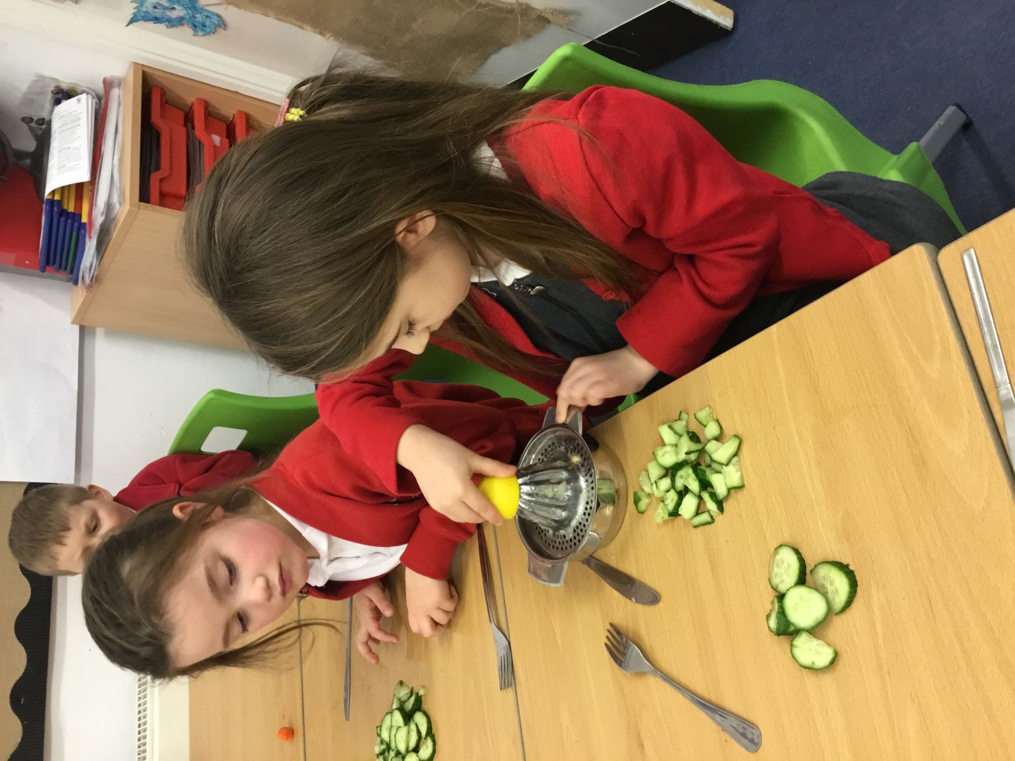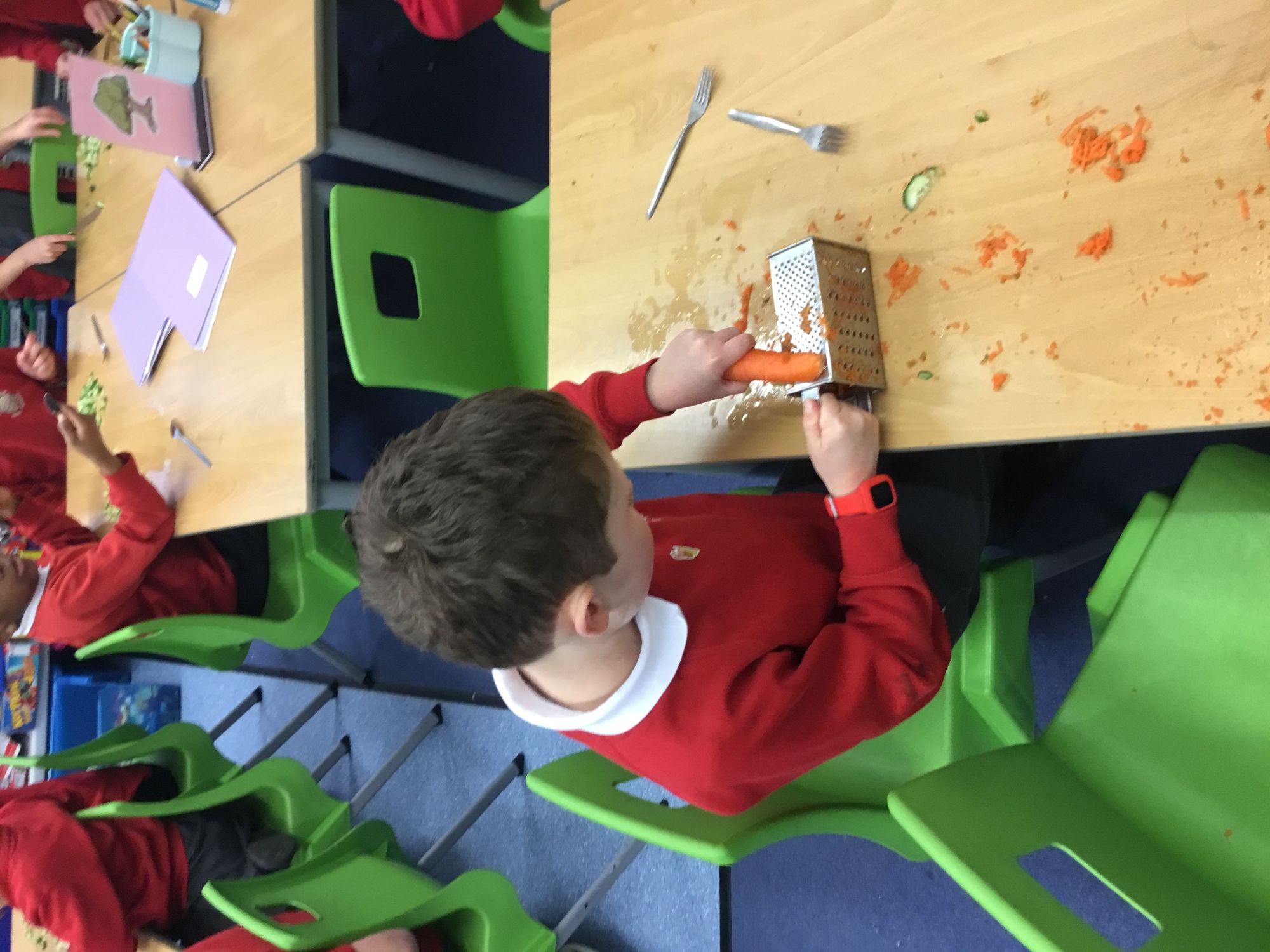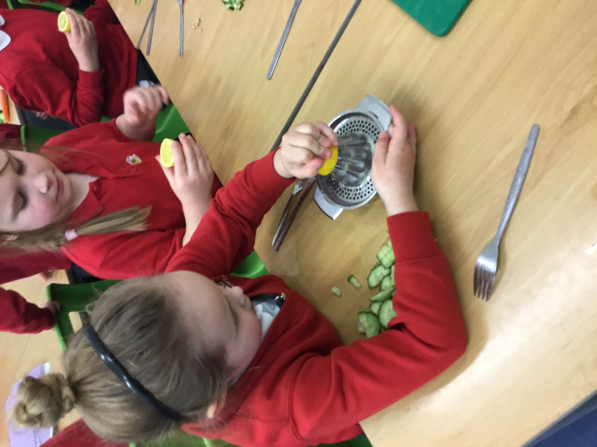 This week, the children developed their knowledge and skills by processing food. We recapped how to cut safely using the bridge, the claw, and the fork technique before learning how to dice, grate and juice different foods.