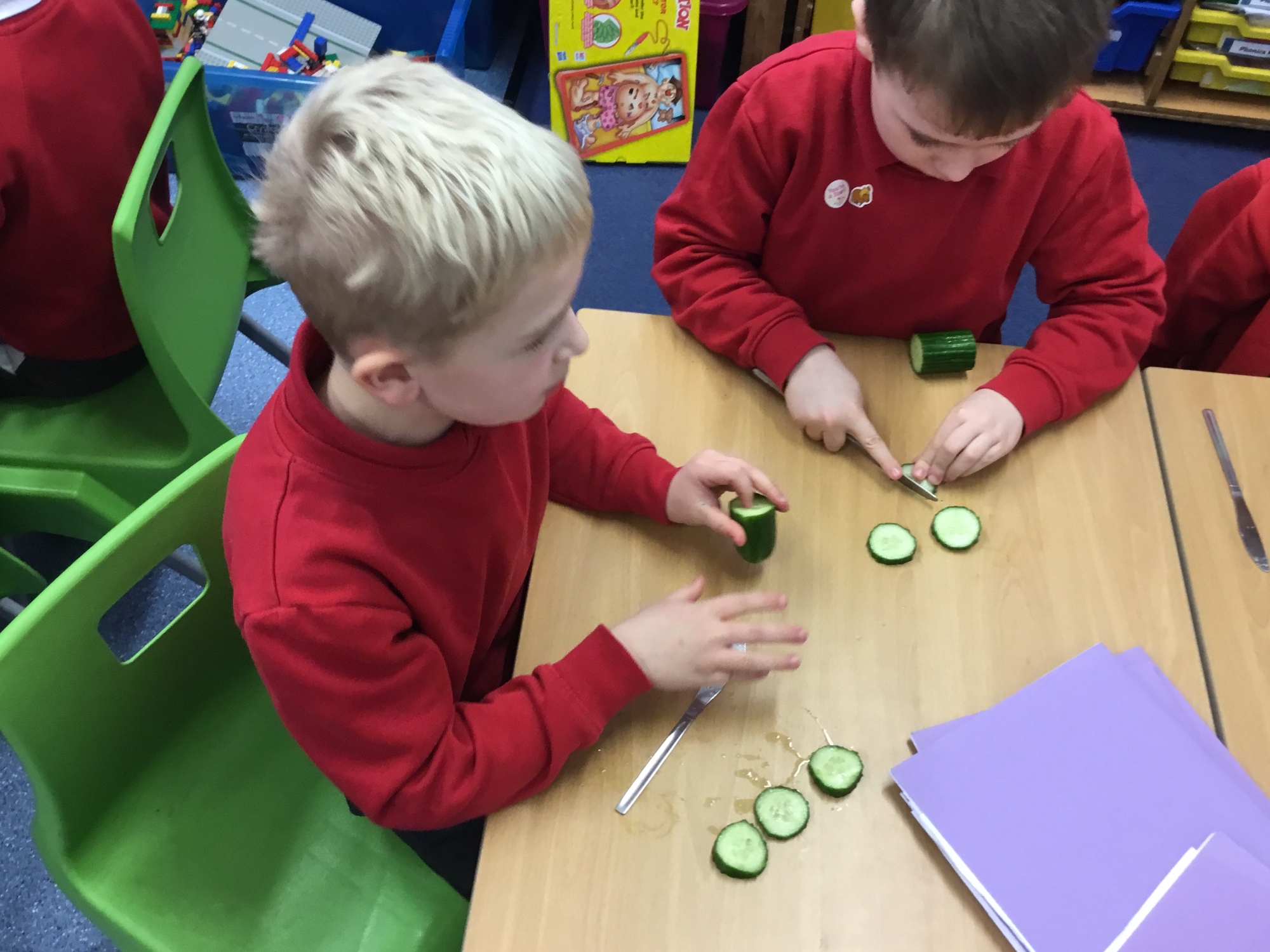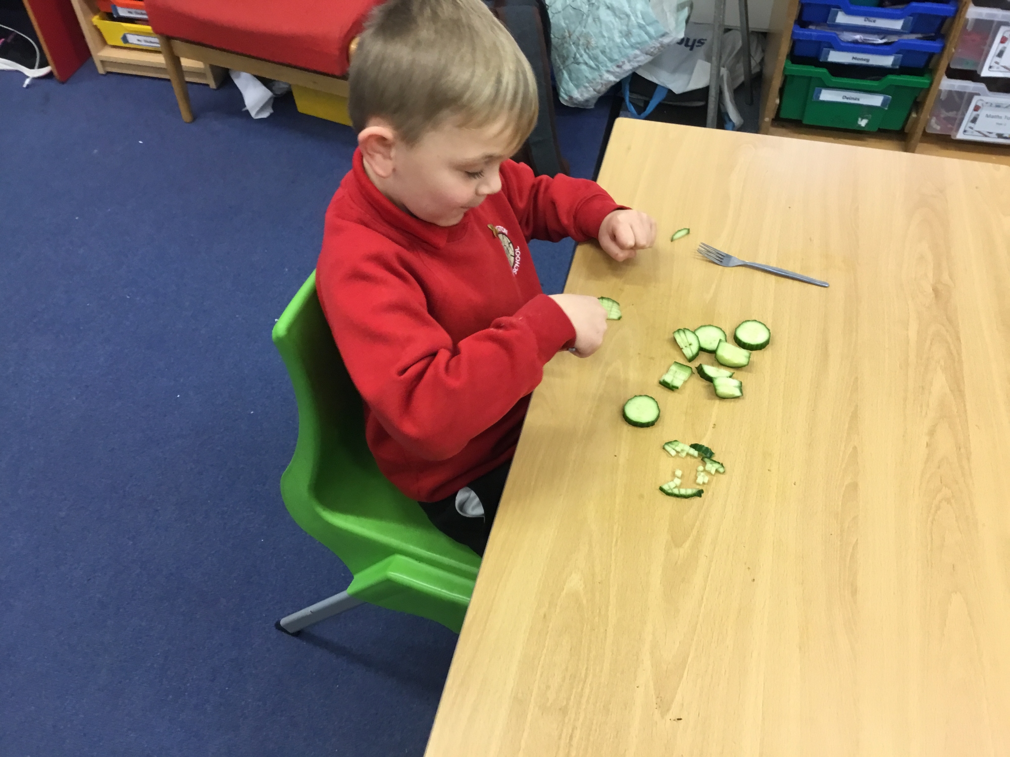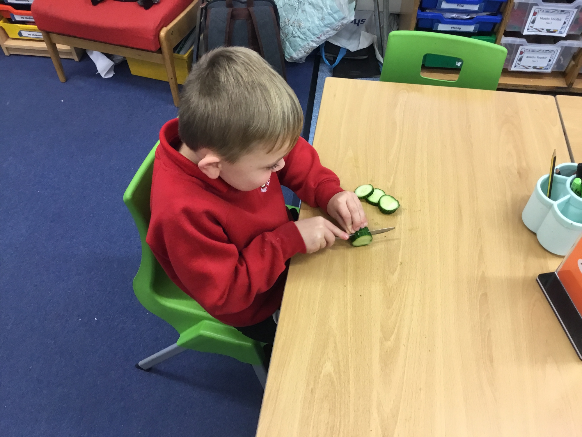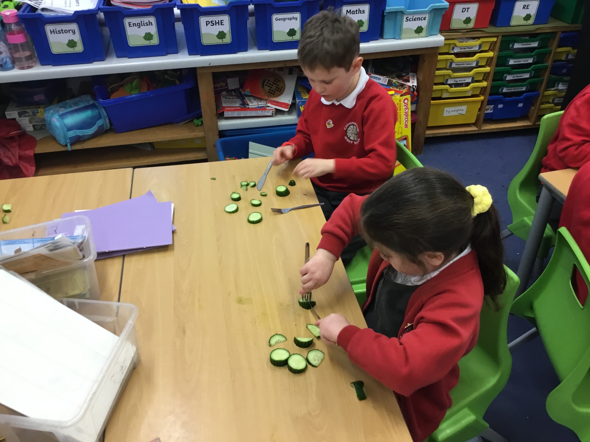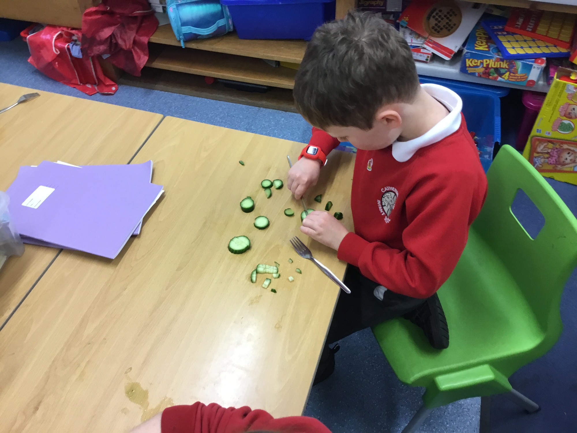 This week, the children developed their knowledge and skills by processing food. We recapped how to cut safely using the bridge, the claw, and the fork technique before learning how to dice, grate and juice different foods.